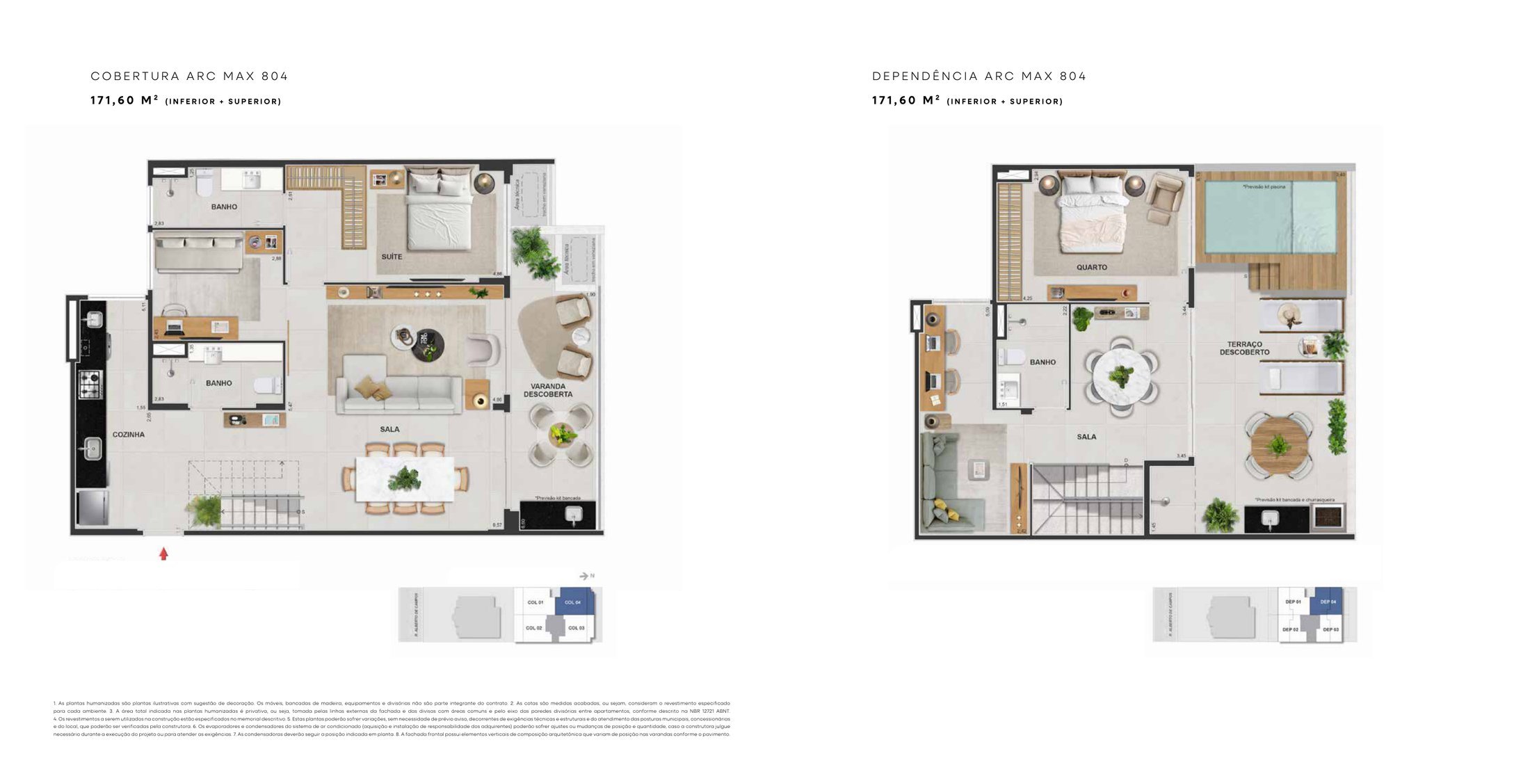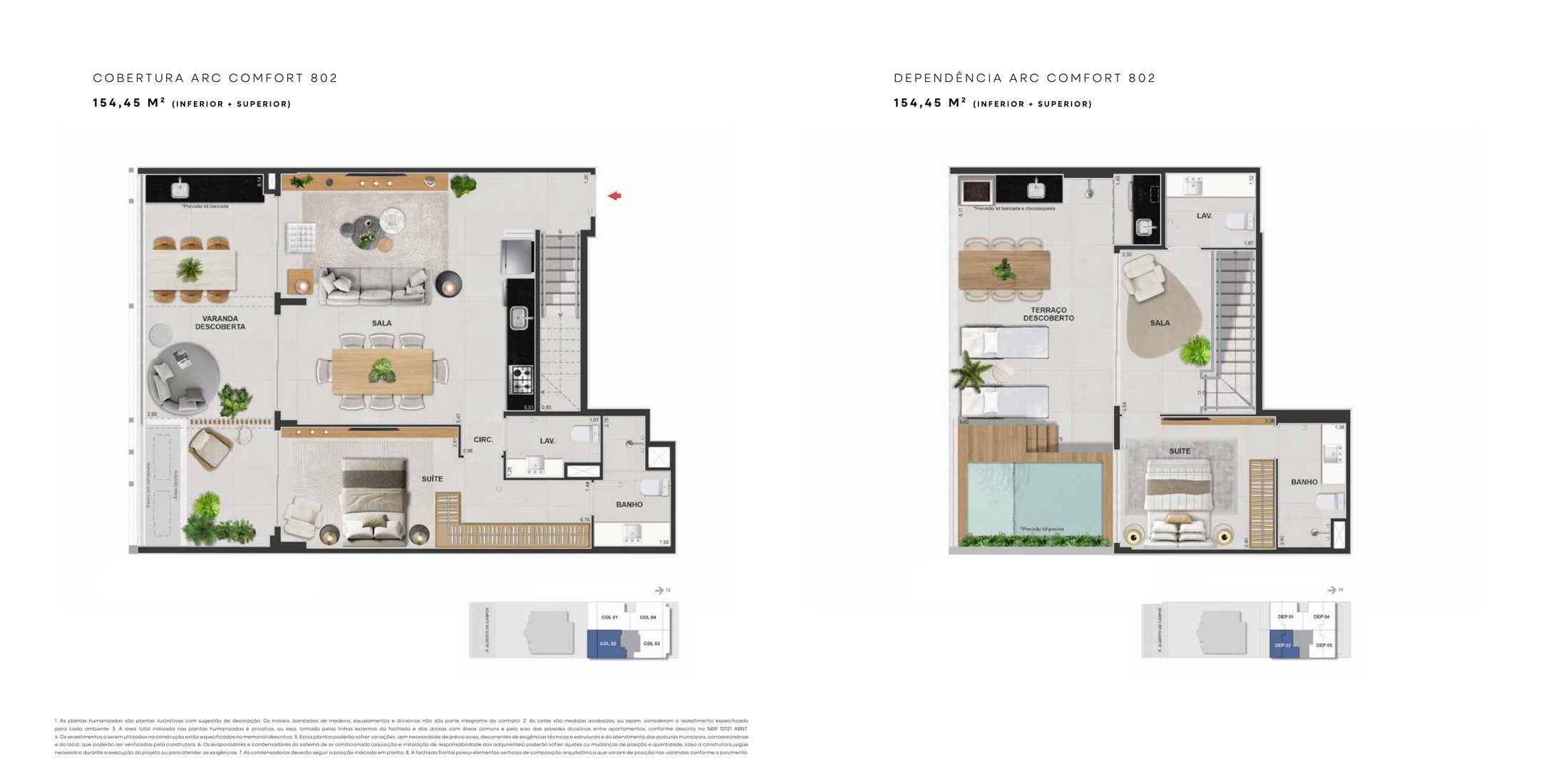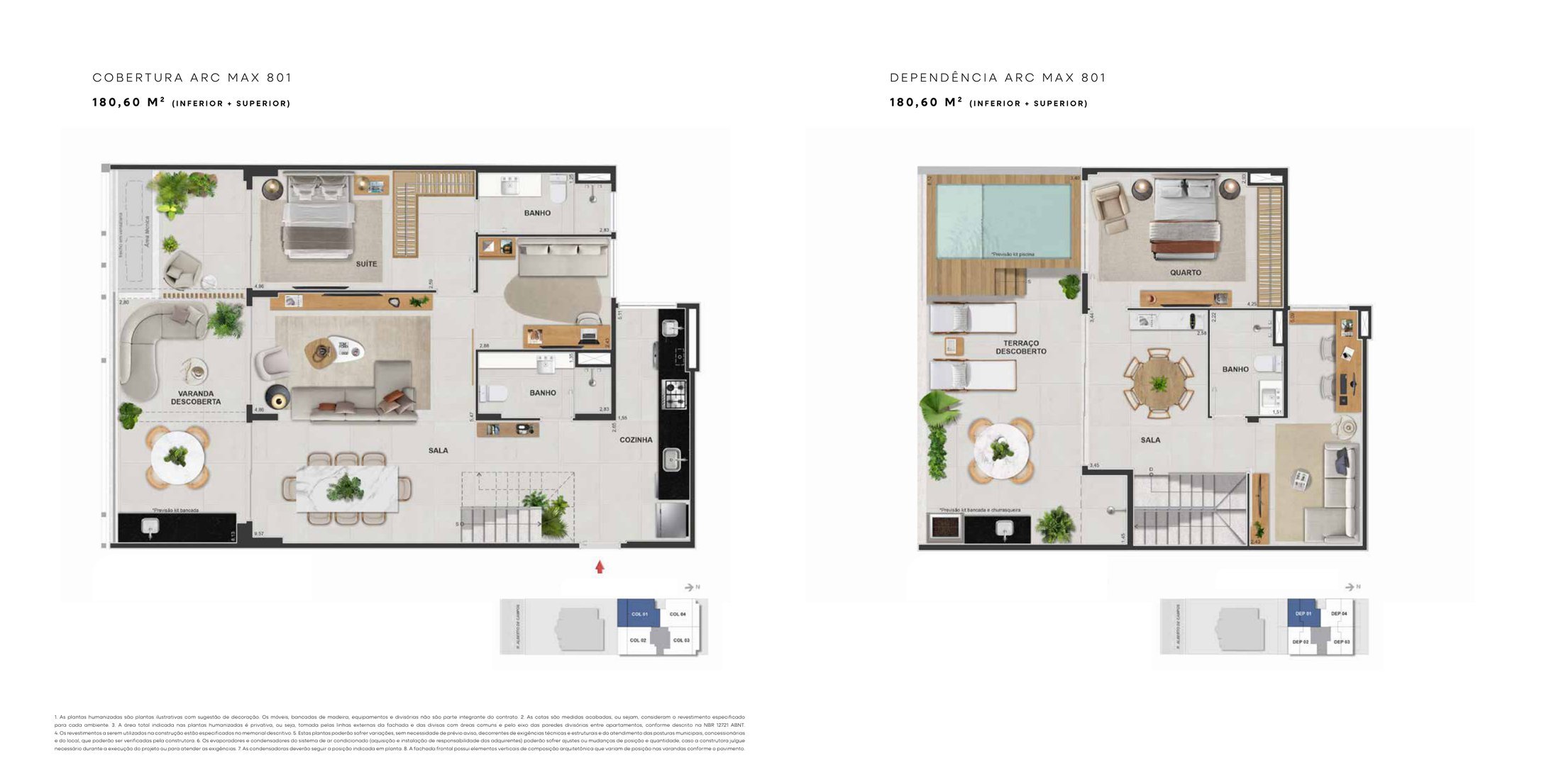 As coberturas duplex do Arc Ipanema são um verdadeiro destaque, com 4 unidades que variam entre 138 m² e 180 m². Essas unidades oferecem espaços amplos, ótima distribuição interna e áreas externas que permitem criar ambientes exclusivos, como varandas gourmet e espaços de lazer privativos. Com acabamentos refinados e uma vista privilegiada do bairro, as coberturas do Arc Ipanema são ideais para quem busca sofisticação e exclusividade.