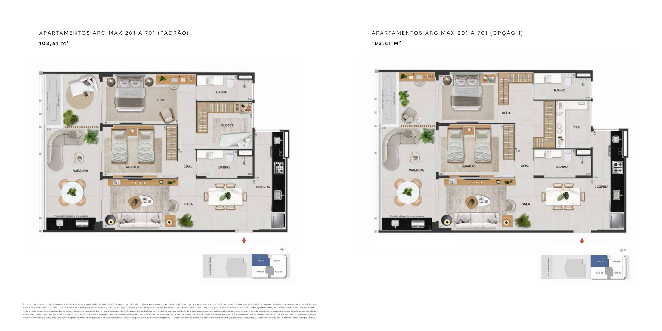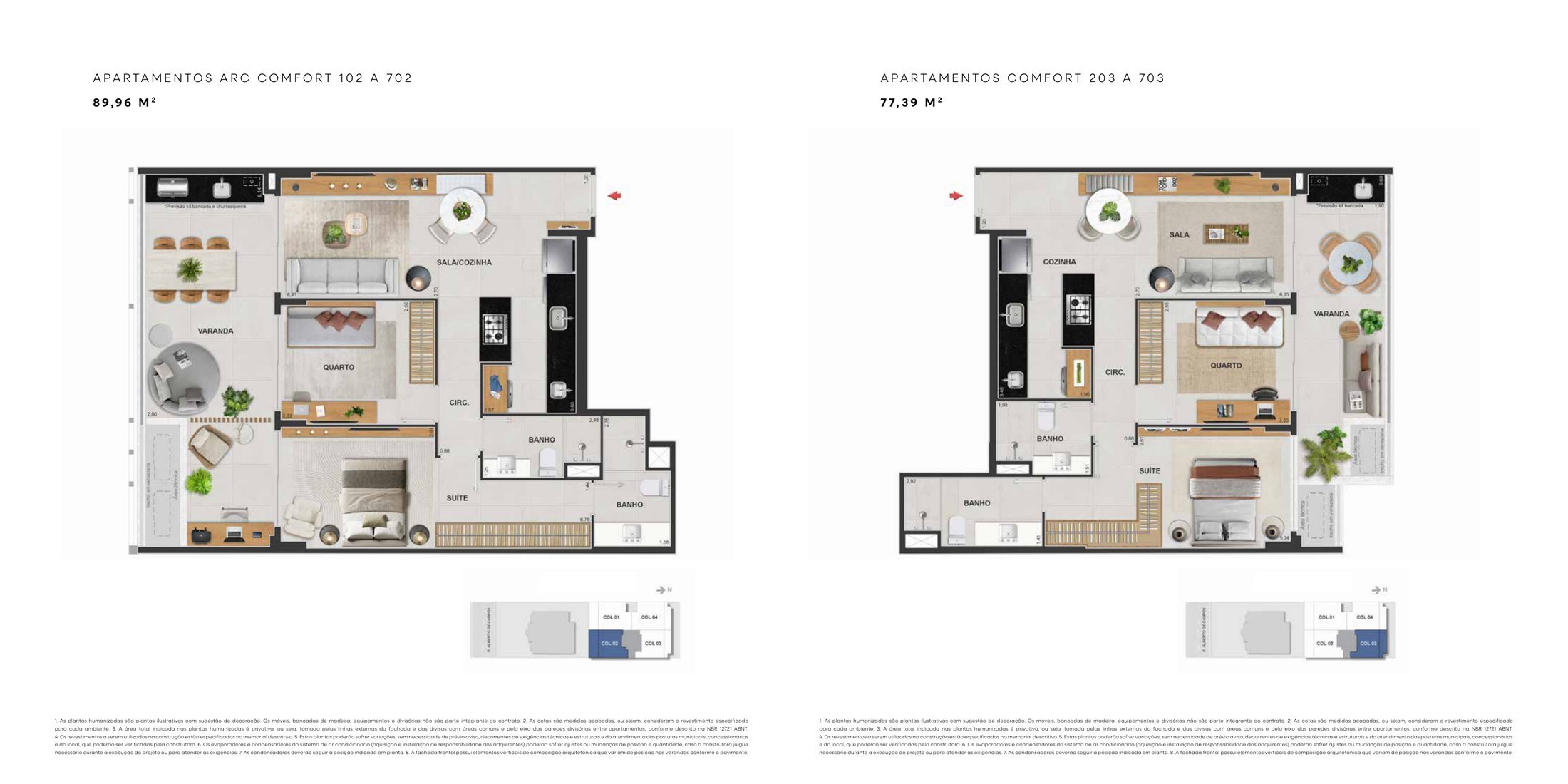 Os apartamentos do Arc Ipanema oferecem conforto e sofisticação em plantas bem planejadas. São 13 unidades de 2 quartos entre 77 m² e 89 m² e 13 unidades de 2 quartos com dependência, variando entre 94 m² e 103 m². Todas contam com ambientes bem distribuídos, acabamentos de alto padrão e áreas sociais integradas. As janelas amplas garantem ótima iluminação natural e ventilação, proporcionando um ambiente agradável.