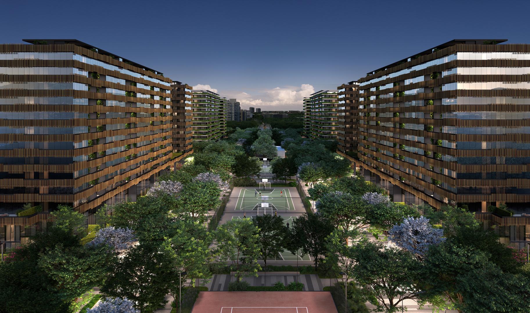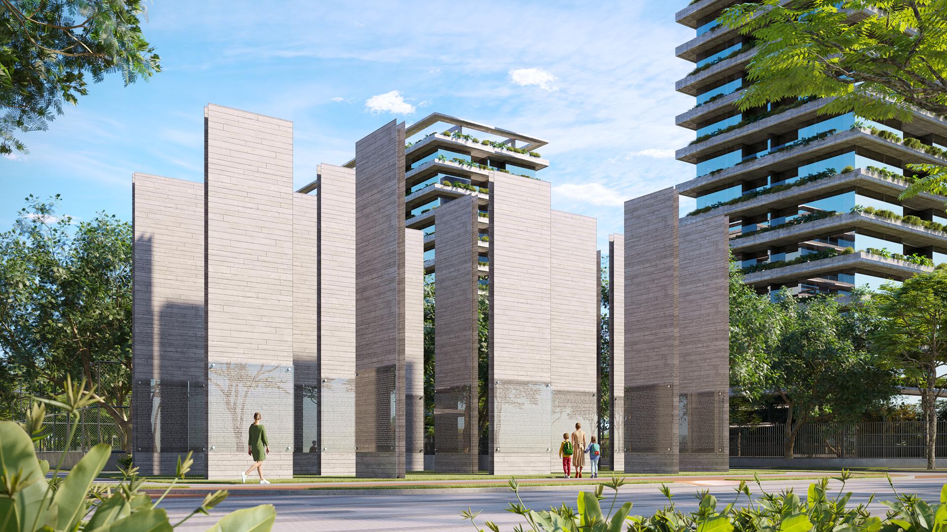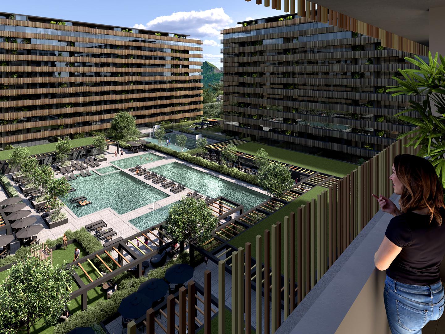 O projeto apresenta um design contemporâneo, com fachadas elegantes, varandas integradas, áreas verdes e espaços projetados para aproveitar a luz natural, priorizando conforto e sustentabilidade.