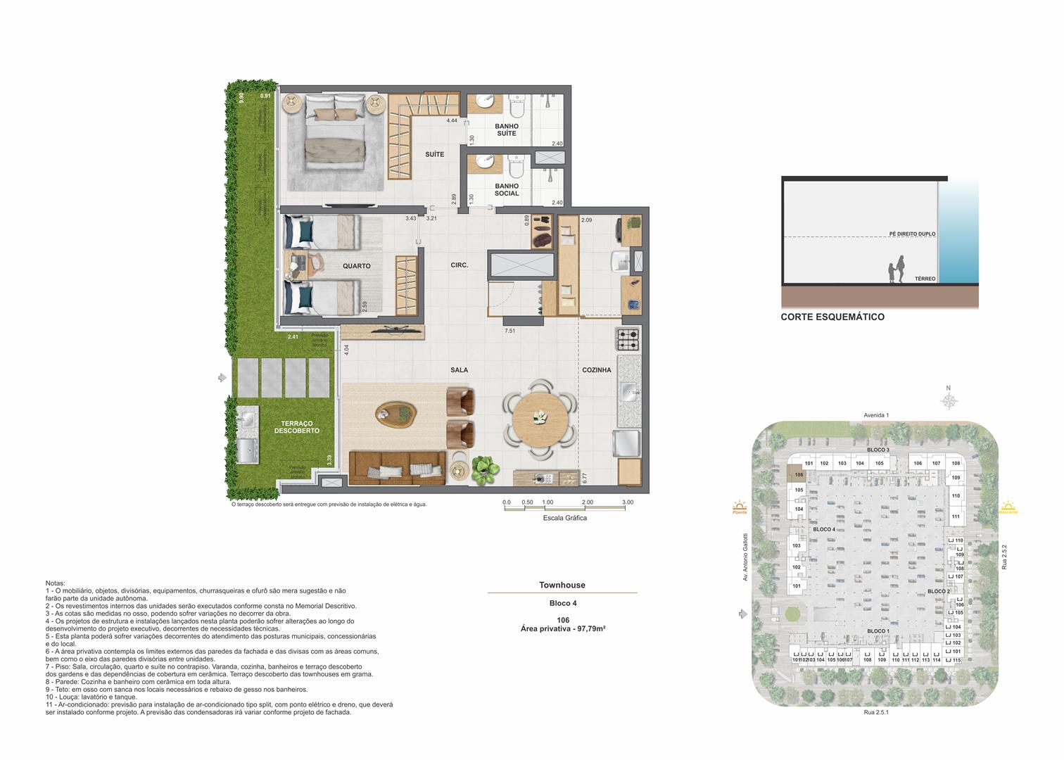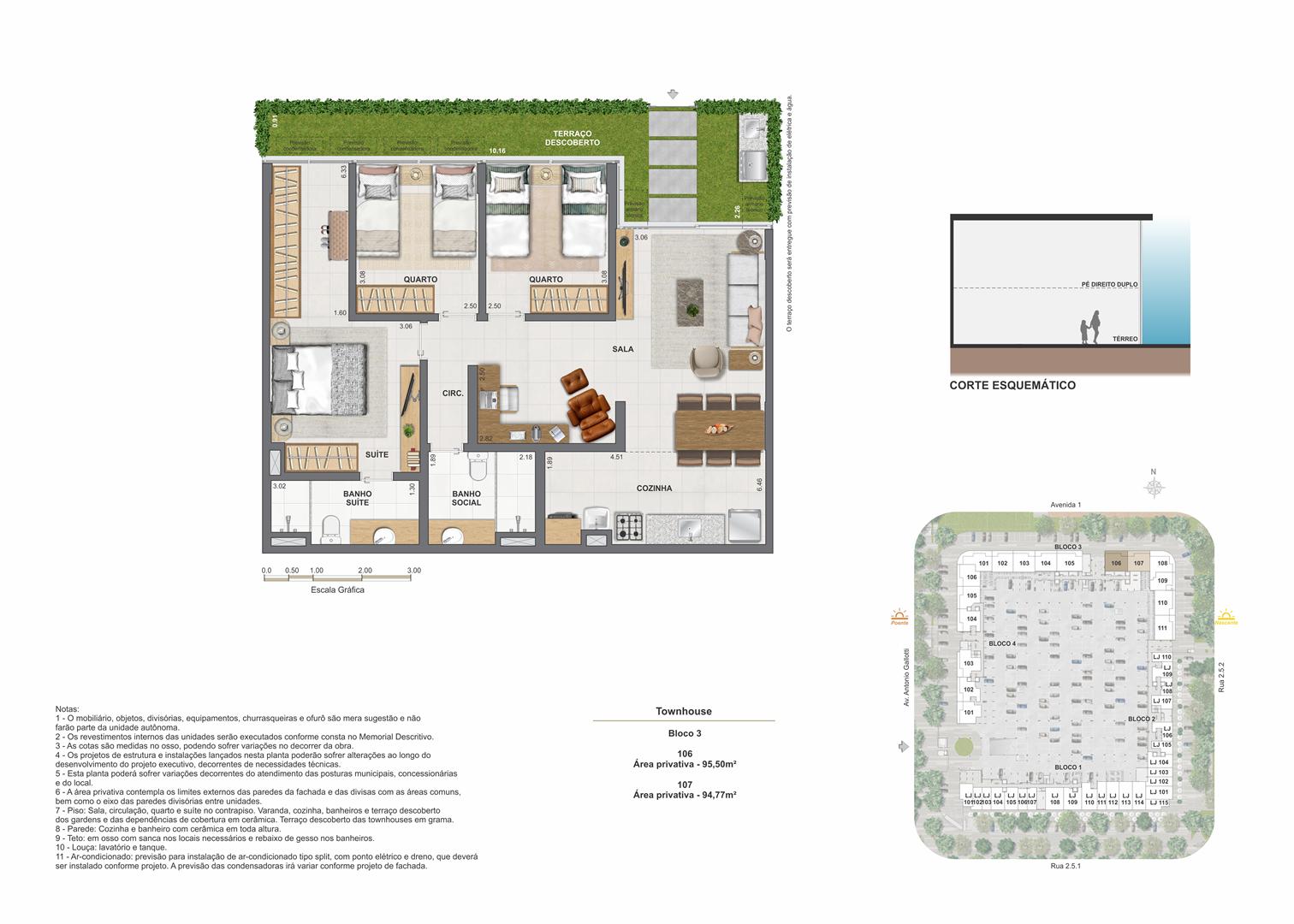 O empreendimento possui diversas tipologias: apartamentos, upgardens, coberturas duplex, townhouses e lojas, com opções residenciais de 2 e 3 quartos e 1 vaga de garagem.