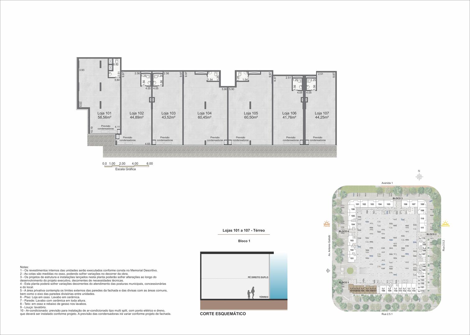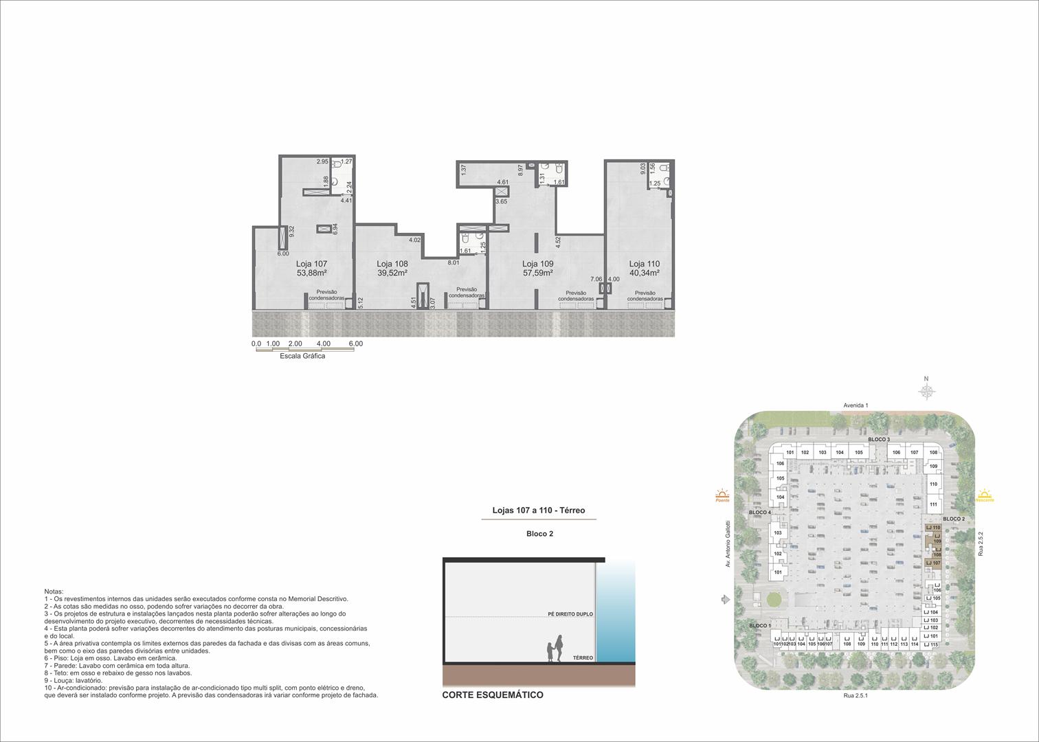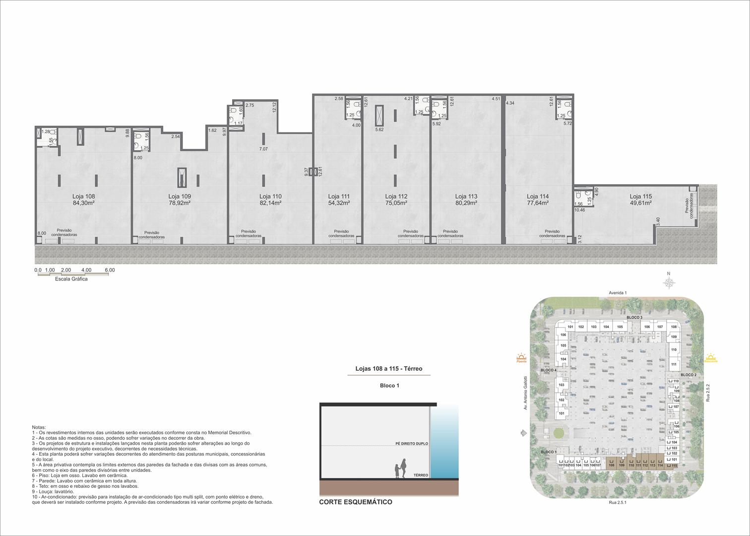 O projeto também inclui lojas com metragens entre 40 m² e 84 m², perfeitas para serviços, conveniências e comércios locais. Todas estão estrategicamente distribuídas pelas quadras do Cidade Arte, garantindo praticidade e dinamismo ao cotidiano dos moradores.