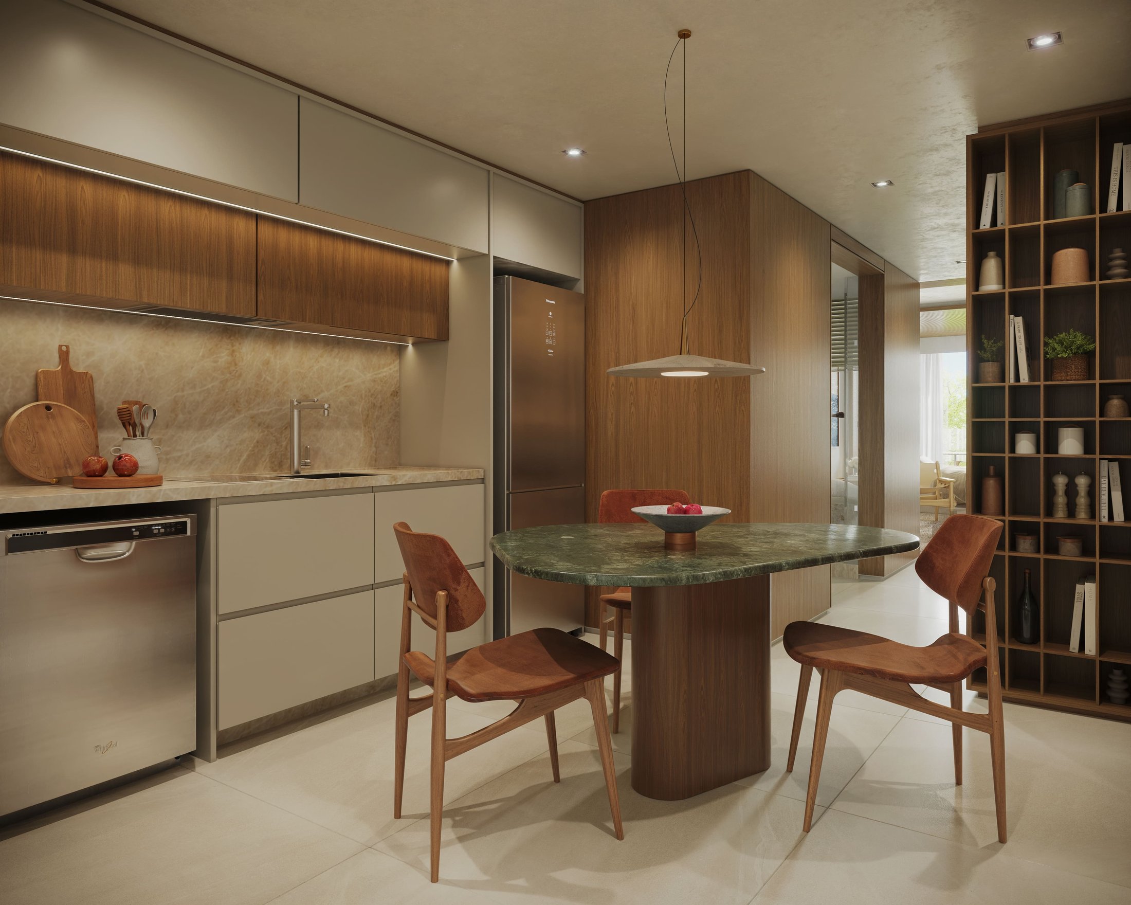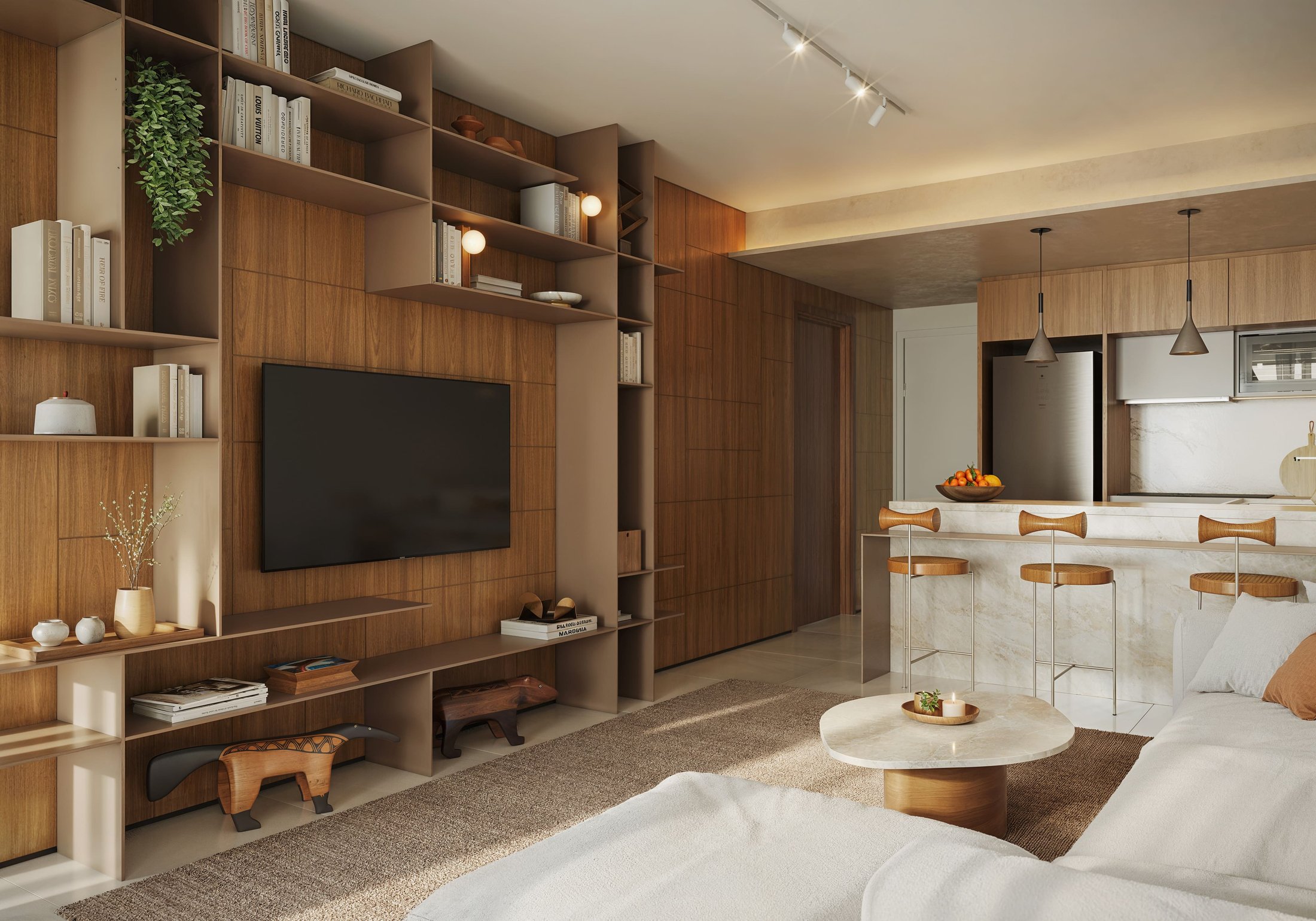 Os apartamentos oferecem living espaçoso com ambientes perfeitamente integrados à cozinha planejada.