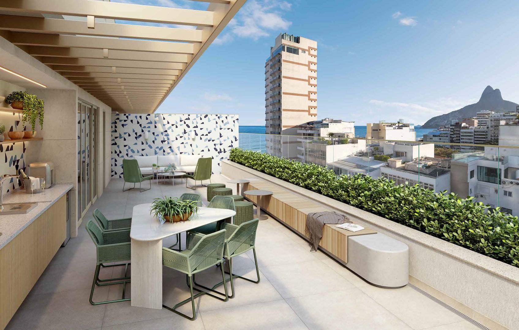 O condomínio oferece piscina climatizada, lounge bar, academia, bicicletário, mini mercado e espaço delivery, todos localizados no rooftop com vista para o Morro Dois Irmãos.