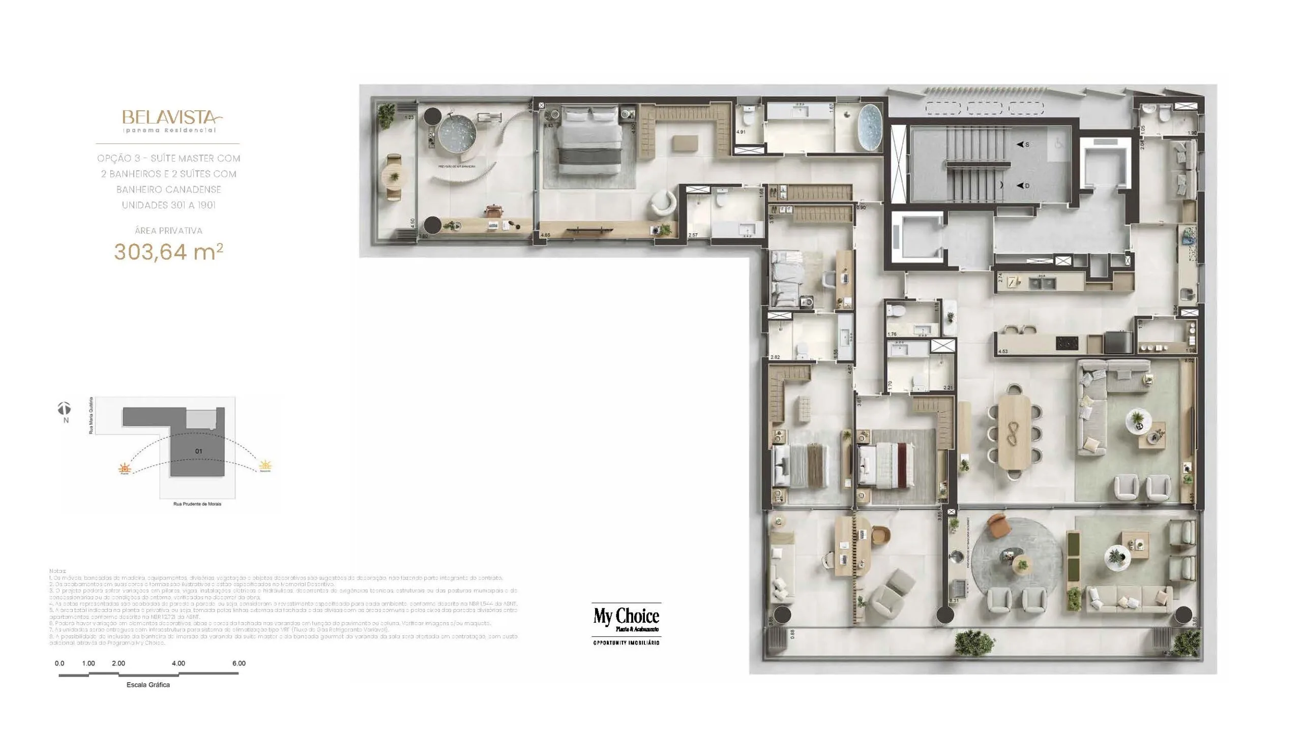 No Bela Vista Ipanema, os apartamentos foram projetados para oferecer o máximo de conforto e sofisticação. Com área privativa de 303 m², as unidades possuem 4 suítes, amplas salas de estar e jantar, e varandas com vista panorâmica. Os acabamentos de alto padrão e a atenção aos detalhes garantem uma experiência residencial única.