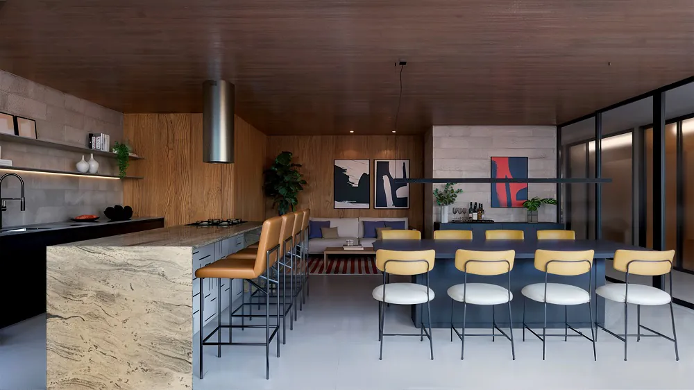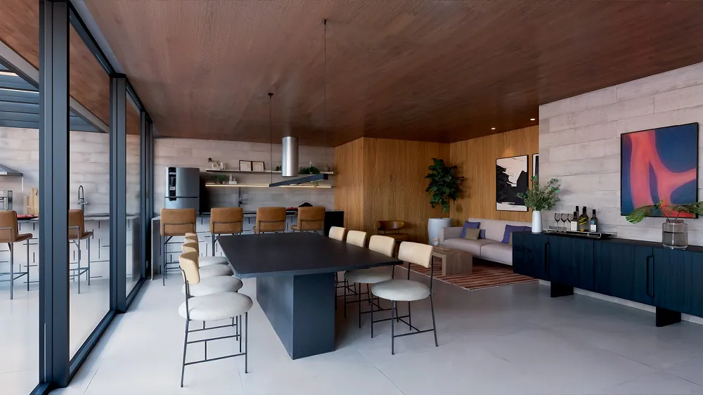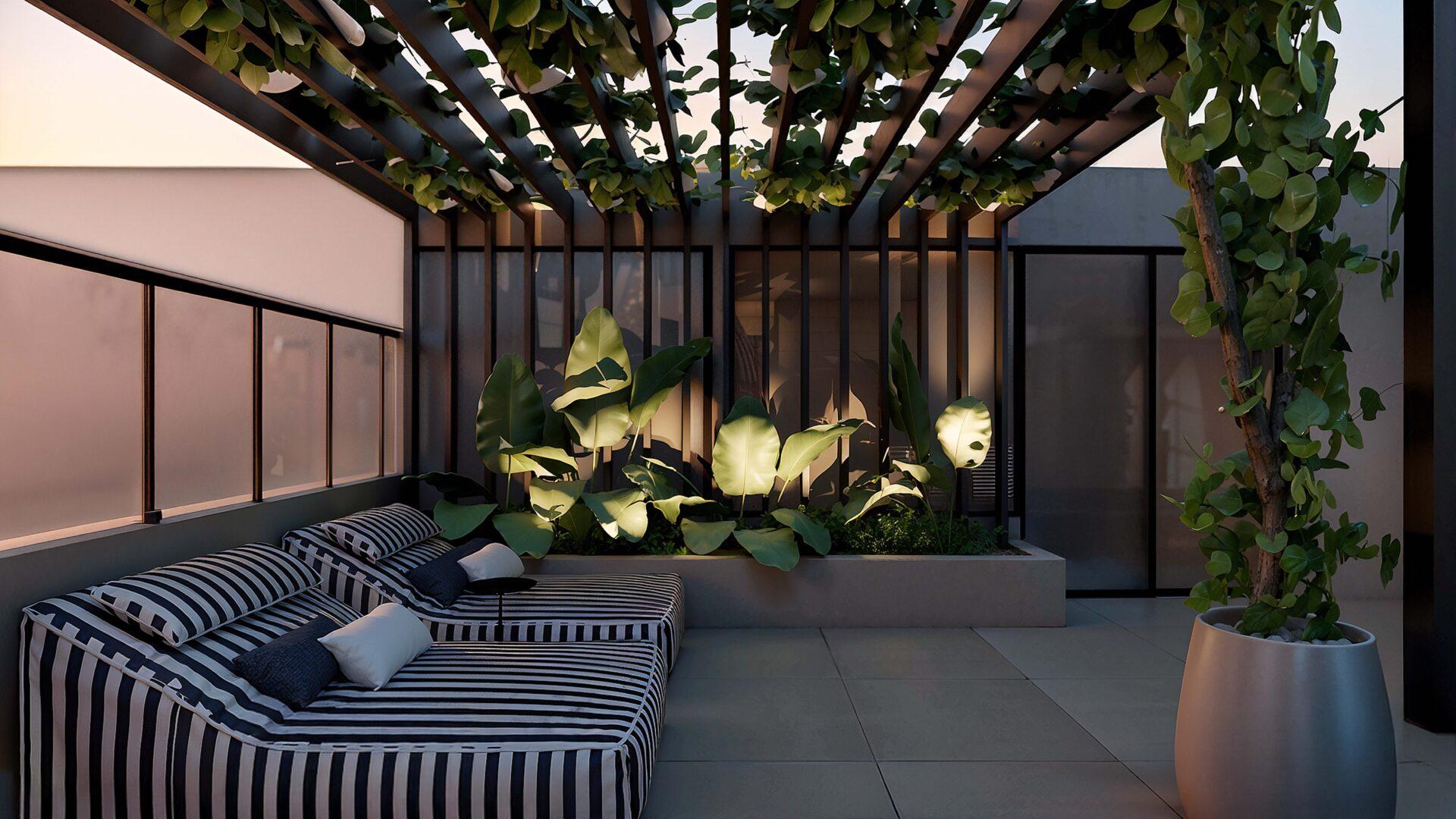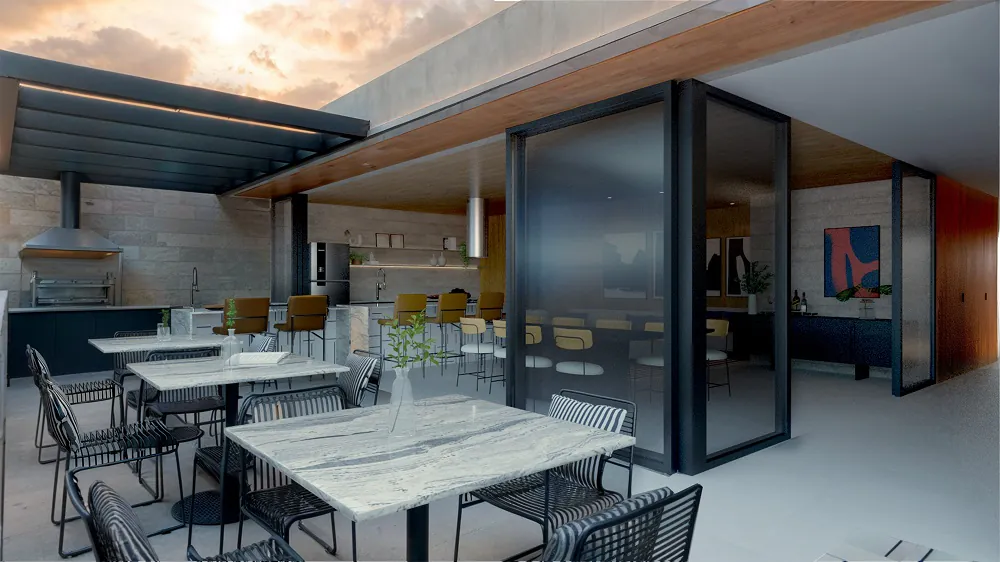 O projeto apresenta arquitetura contemporânea, com ambientes integrados, acabamentos de qualidade e áreas comuns modernas, como rooftop com piscina, coworking e academia.