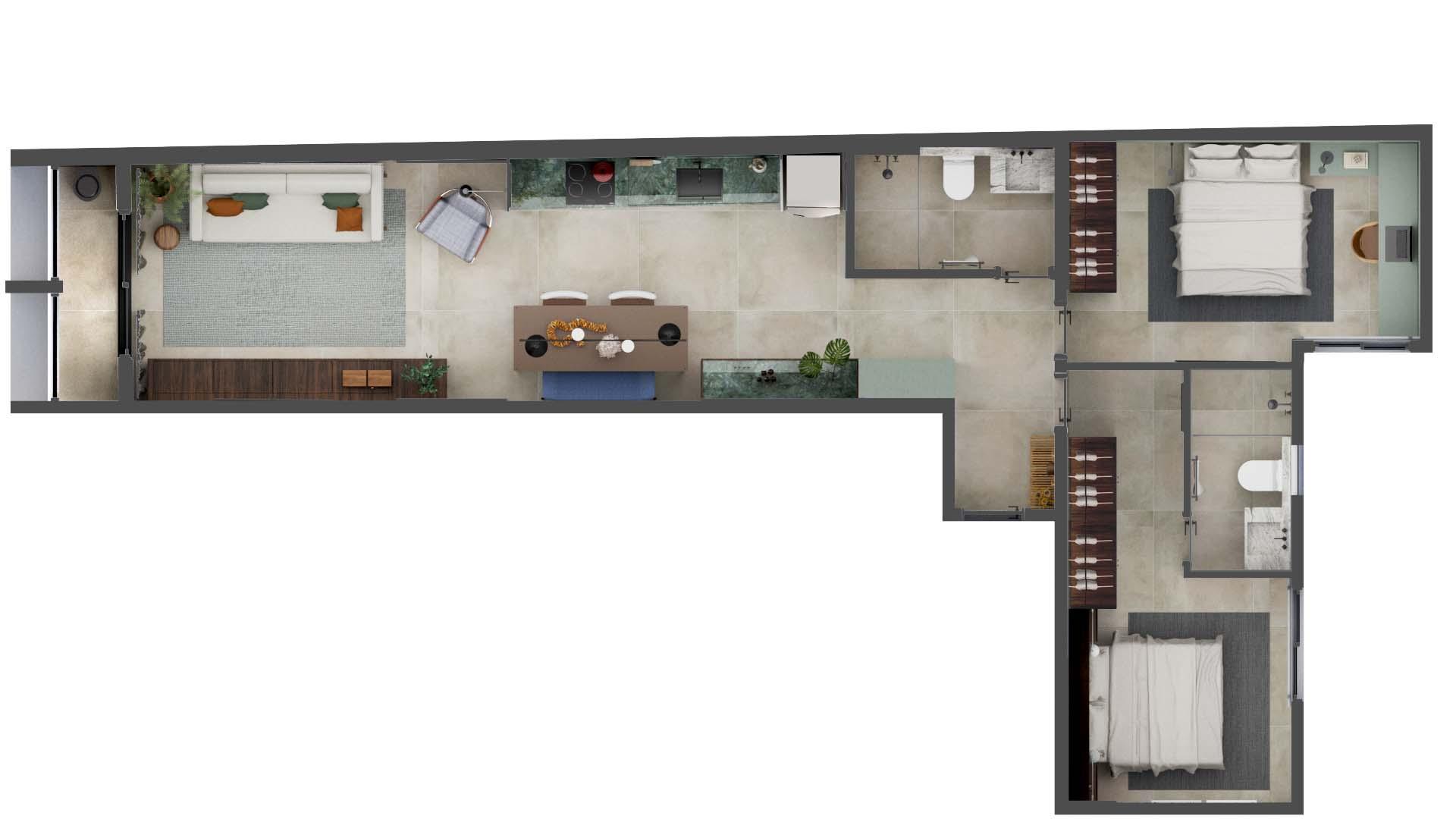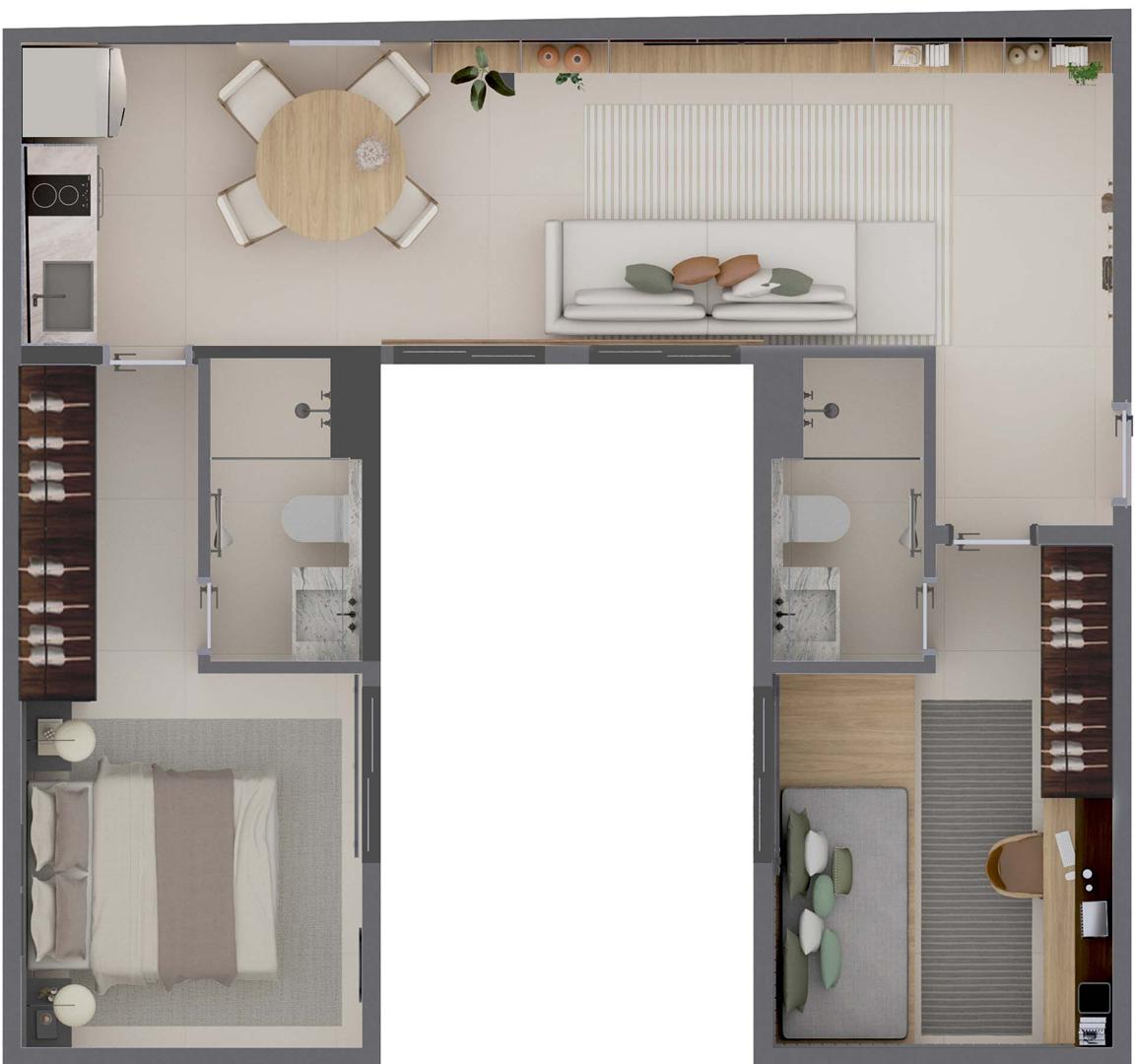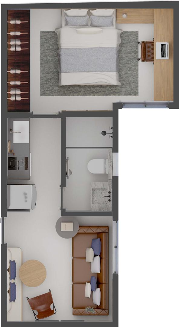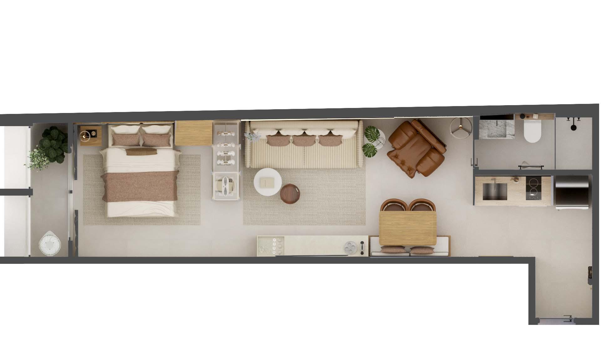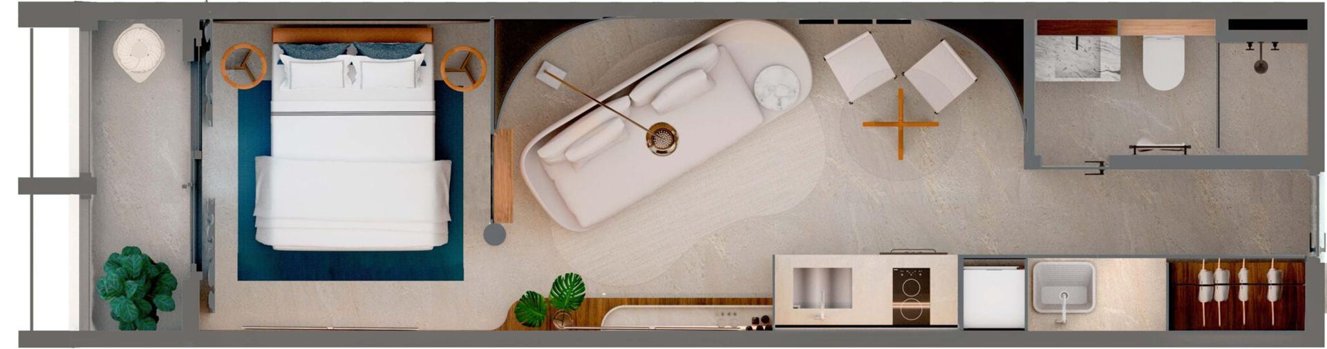 Os apartamentos do Brise Studios Design foram projetados em tipologias de studios, com tamanhos que variam de 31 m² a 44 m². Todas as unidades contam com varanda, acabamentos modernos e aproveitamento inteligente do espaço. São ideais tanto para morar quanto para investir, com plantas funcionais que se adaptam ao estilo de vida contemporâneo.