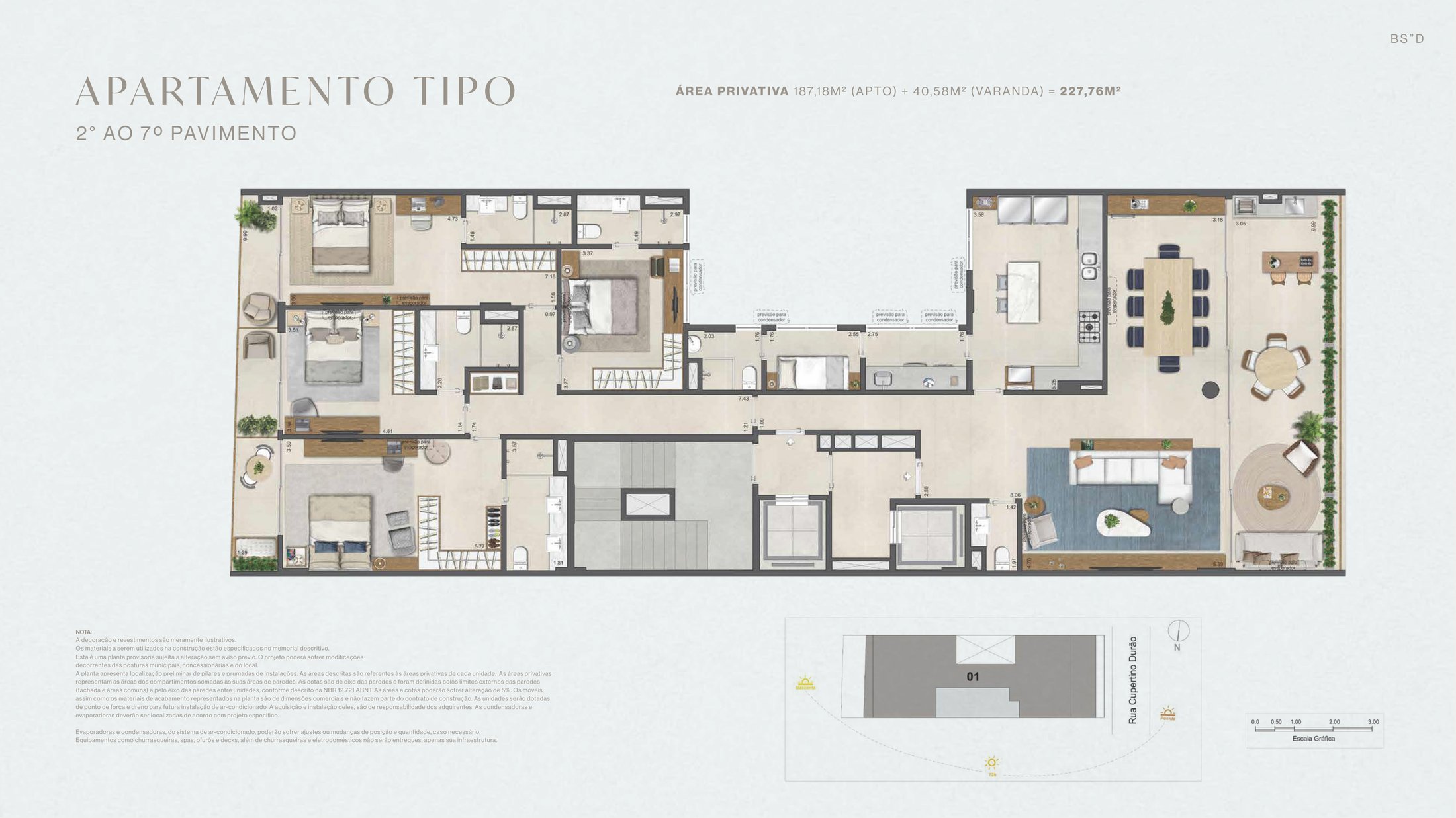 Os apartamentos tipo do Bruma ocupam um andar inteiro, garantindo privacidade absoluta com 227,76 m² de área privativa. As unidades contam com 4 suítes, living integrado e varandas com fechamento previsto para manter a harmonia estética da fachada.