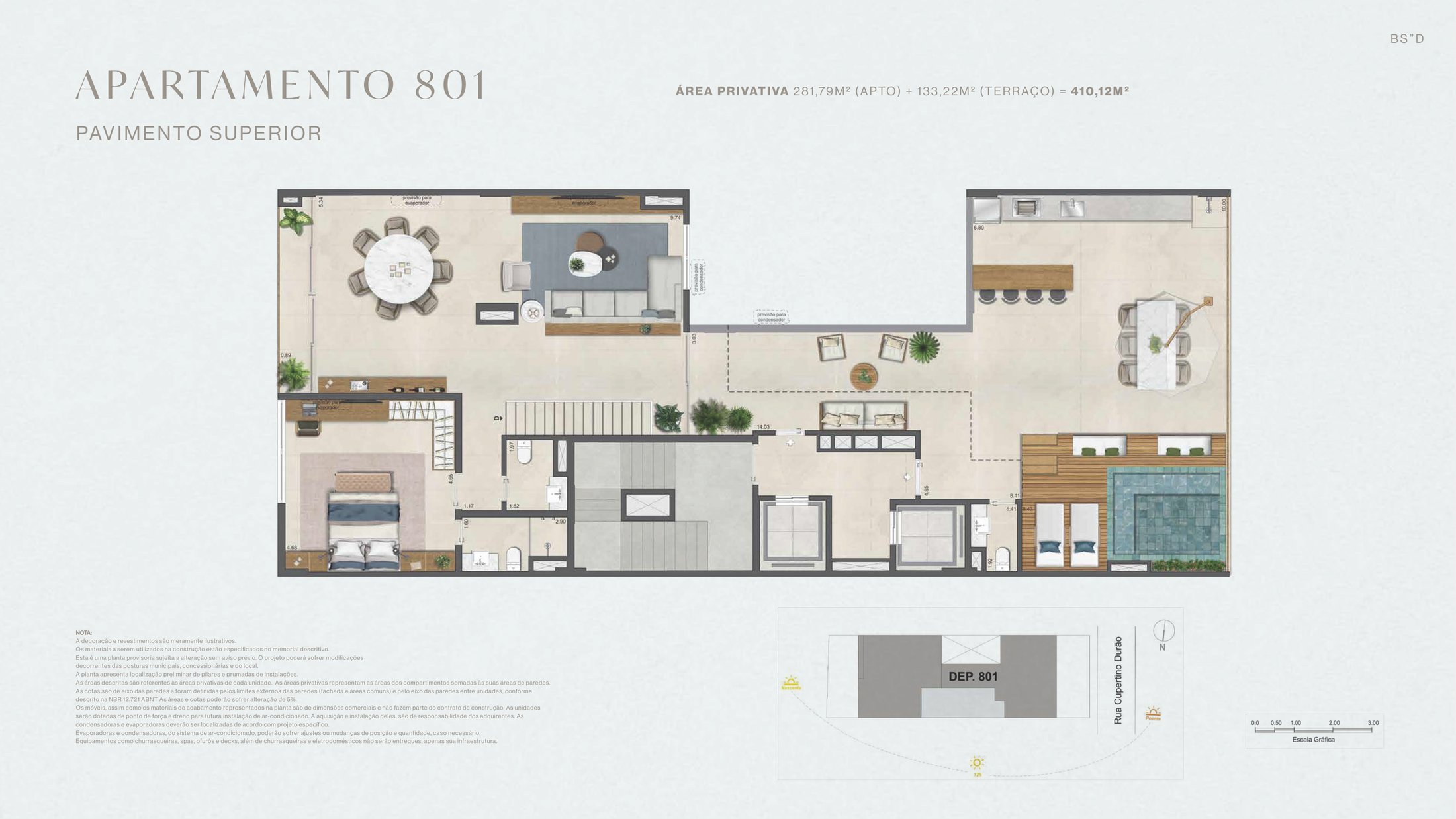 A cobertura duplex do Bruma é o ápice da exclusividade no Leblon, com 415,01 m² e 5 suítes. O pavimento superior oferece um amplo terraço com área gourmet e infraestrutura para piscina privativa, proporcionando uma experiência de lazer particular com vista privilegiada.