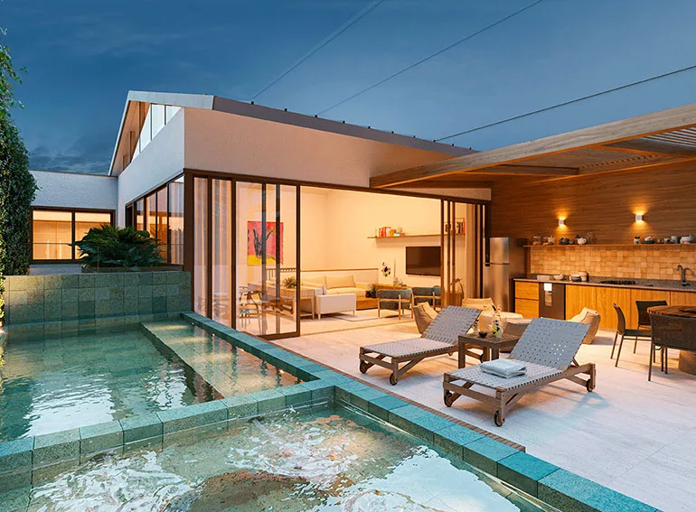 A região onde a casa está situada é segura, permite fácil acesso a escolas, shoppings, comércios e prestadores de serviços diversos. A residência conta com alguns diferenciais para garantir ainda mais exclusividade, conforto e bem-estar aos moradores, como por exemplo a inclusão de um espaço de lazer privativo para a família. Neste espaço encontram-se uma área gourmet com piscina, sendo possível também personalizar com outros itens como espaço kids, área de churrasqueiras, jardim e horta particular, sauna, área de descanso, deck molhado, entre muitas outras possibilidades que se adequem à realidade e aos desejos dos moradores.