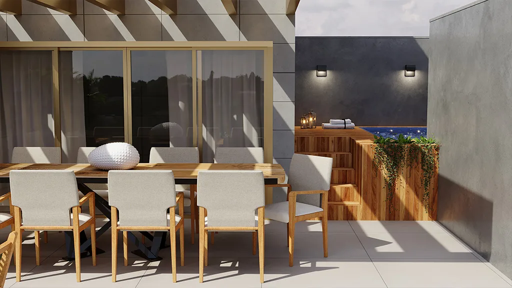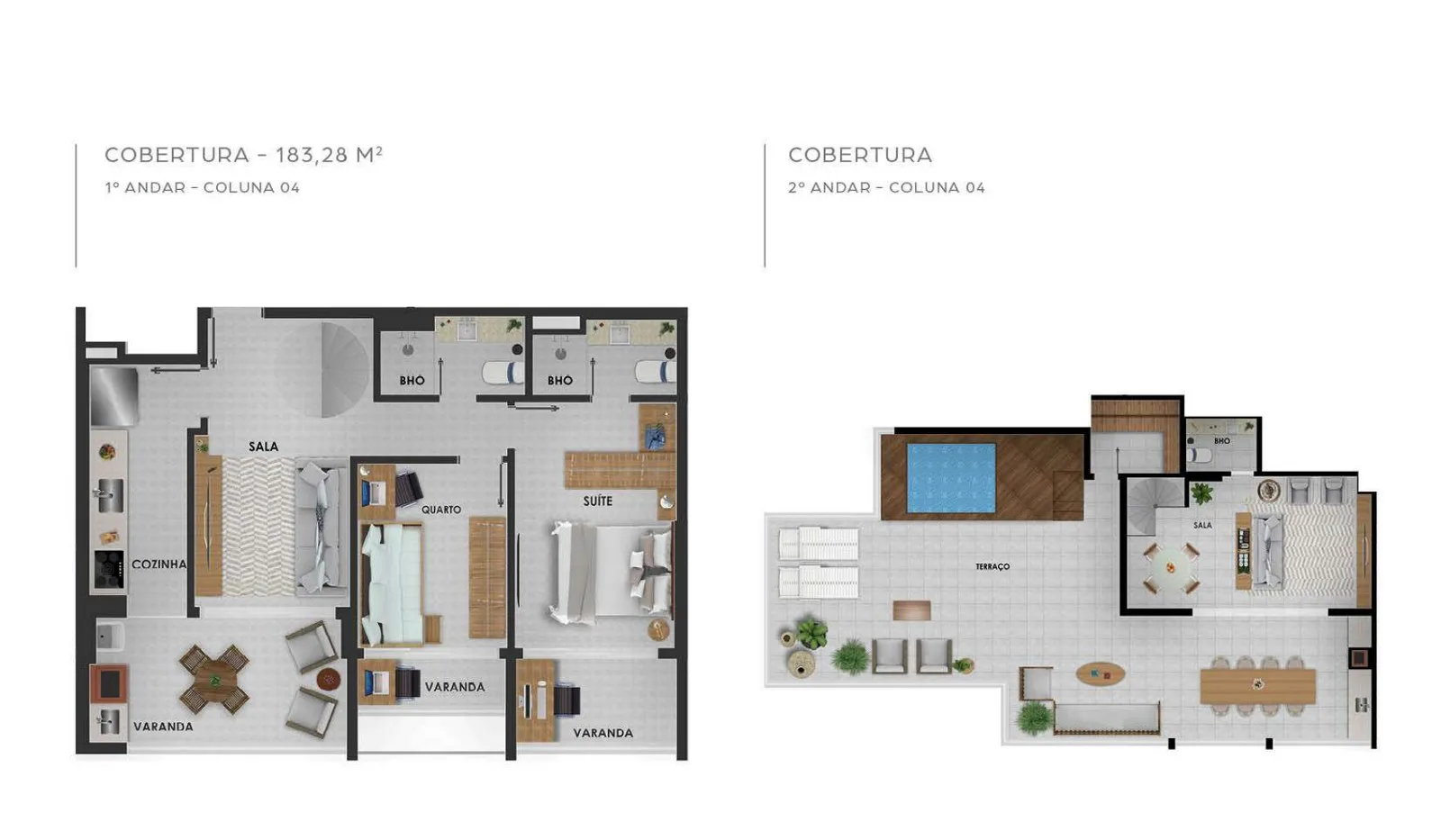 As coberturas do Feng Tijuca Residencial são duplex, com metragens que variam de 144 a 183 m². Estas unidades oferecem 2 ou 3 quartos, sendo que todas possuem uma suíte com varanda. Os terraços das coberturas têm previsão para instalação de piscina, proporcionando uma área de lazer privativa e diferenciada. O design contemporâneo e os acabamentos de alto padrão são destaques das coberturas.