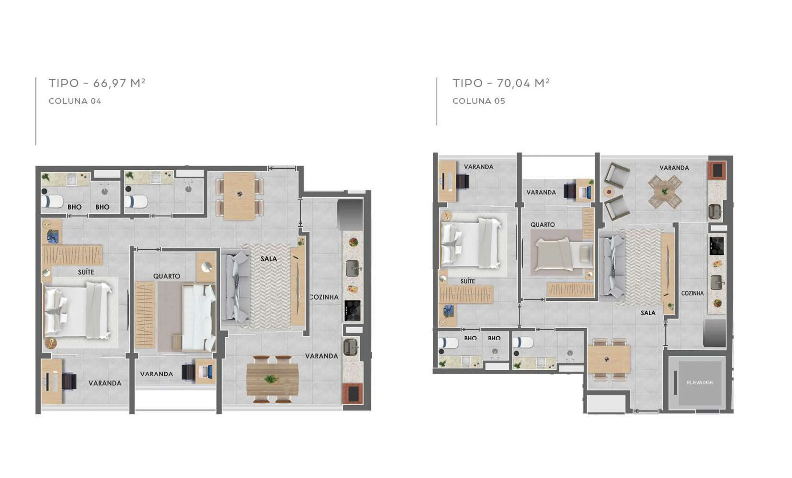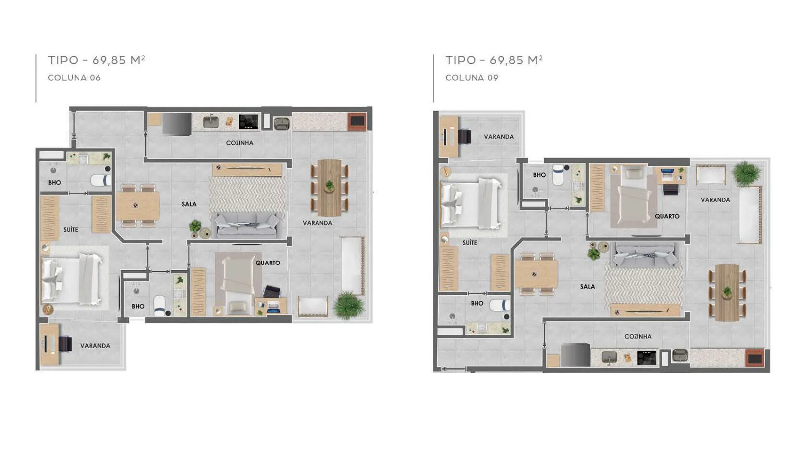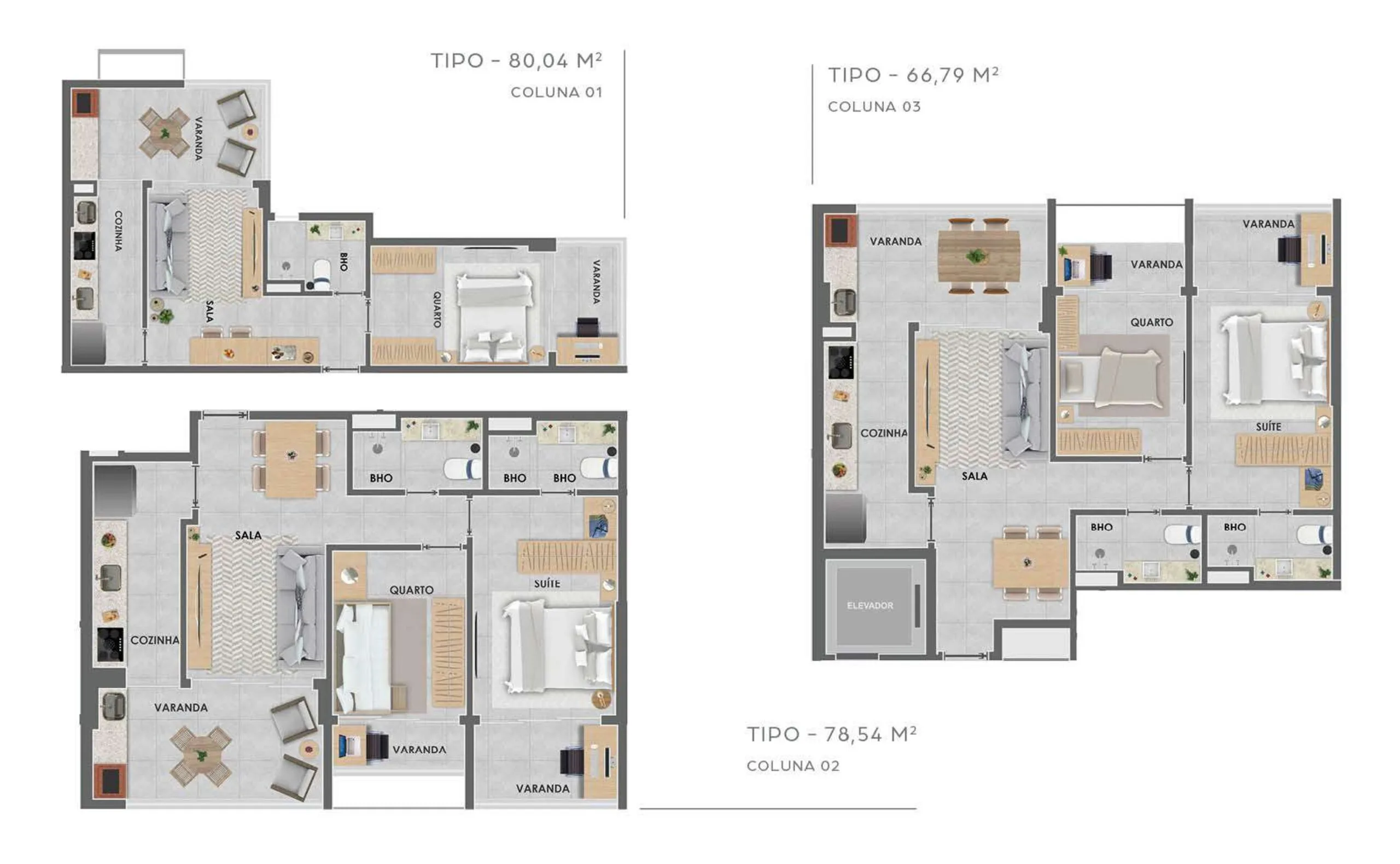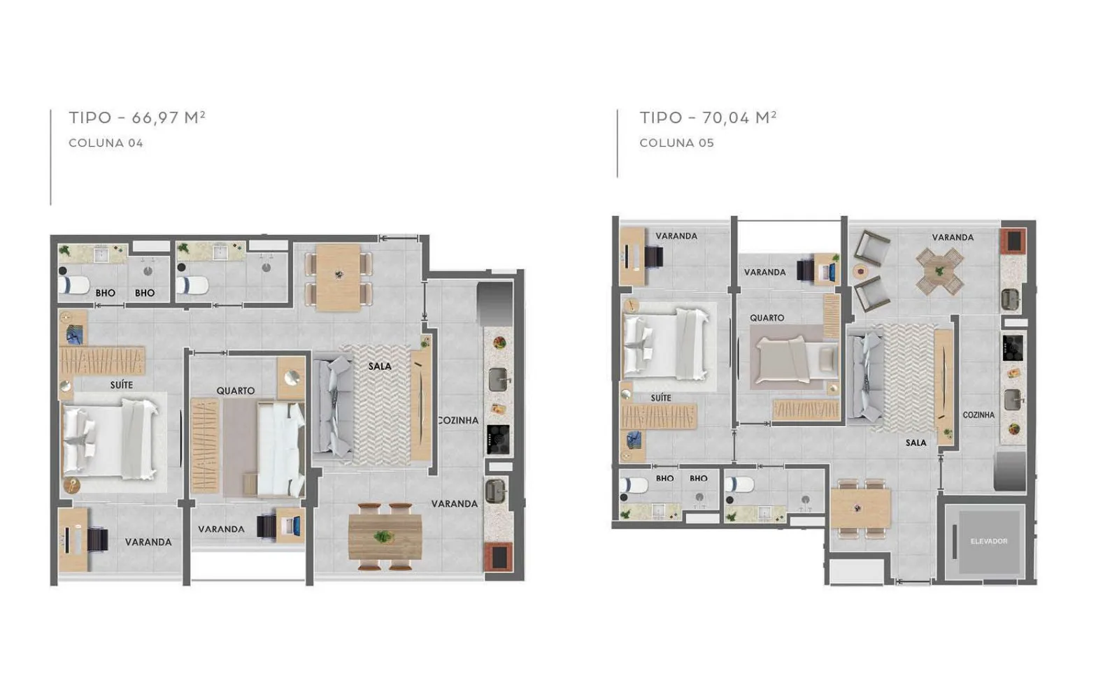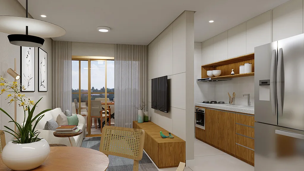 Os apartamentos do Feng Tijuca Residencial variam de 53,05 m² a 80,04 m², com opções de 1 ou 2 quartos, sendo que algumas unidades possuem suíte. Todos os apartamentos contam com varanda na sala e nos quartos, proporcionando espaços amplos e bem iluminados. Os acabamentos de alto padrão e a distribuição inteligente dos espaços garantem conforto e funcionalidade aos moradores.