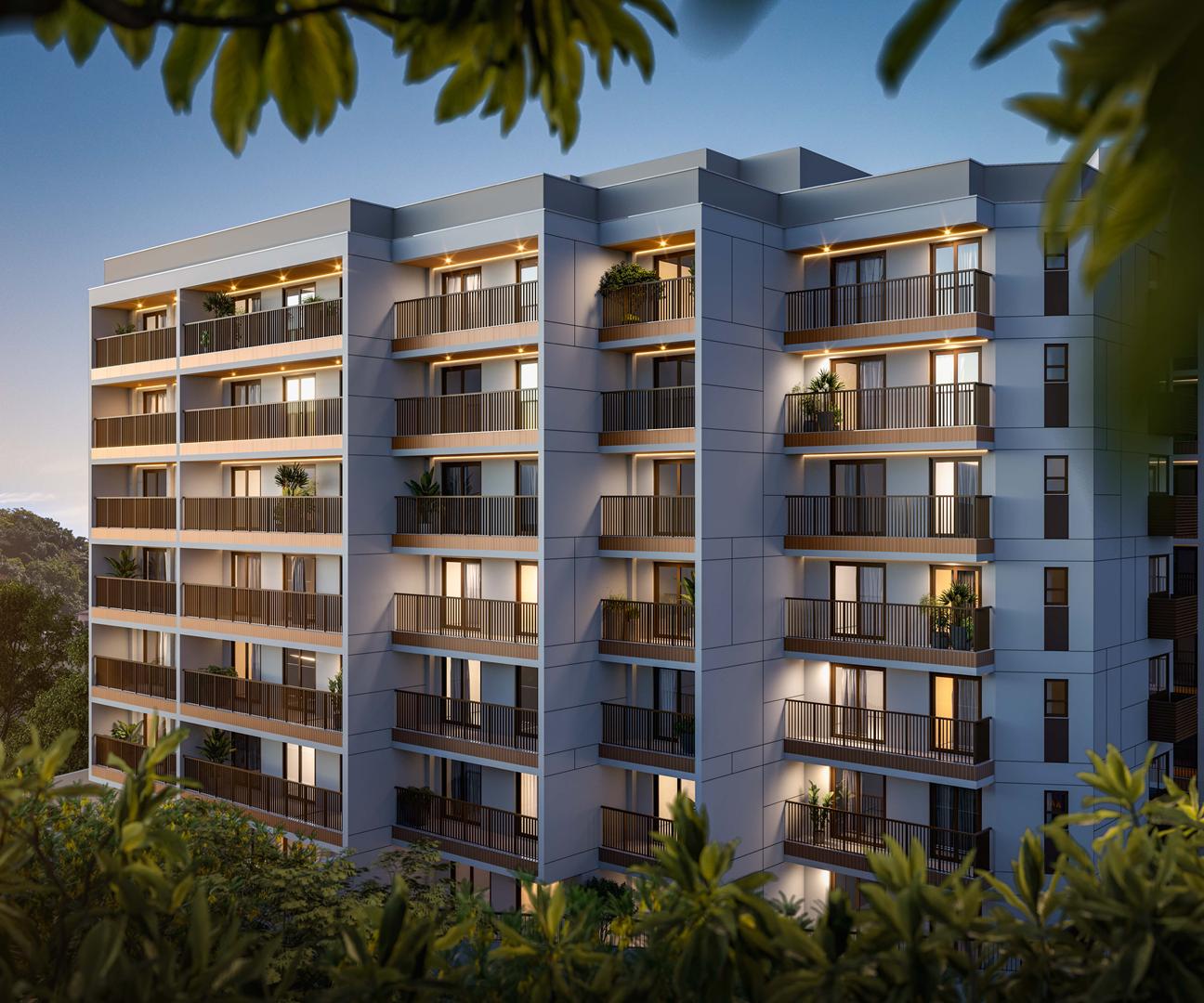 O empreendimento oferece studios, apartamentos e UpGardens de até 3 quartos, com metragens que variam entre 30 m² e 106 m², atendendo diferentes perfis de moradores.