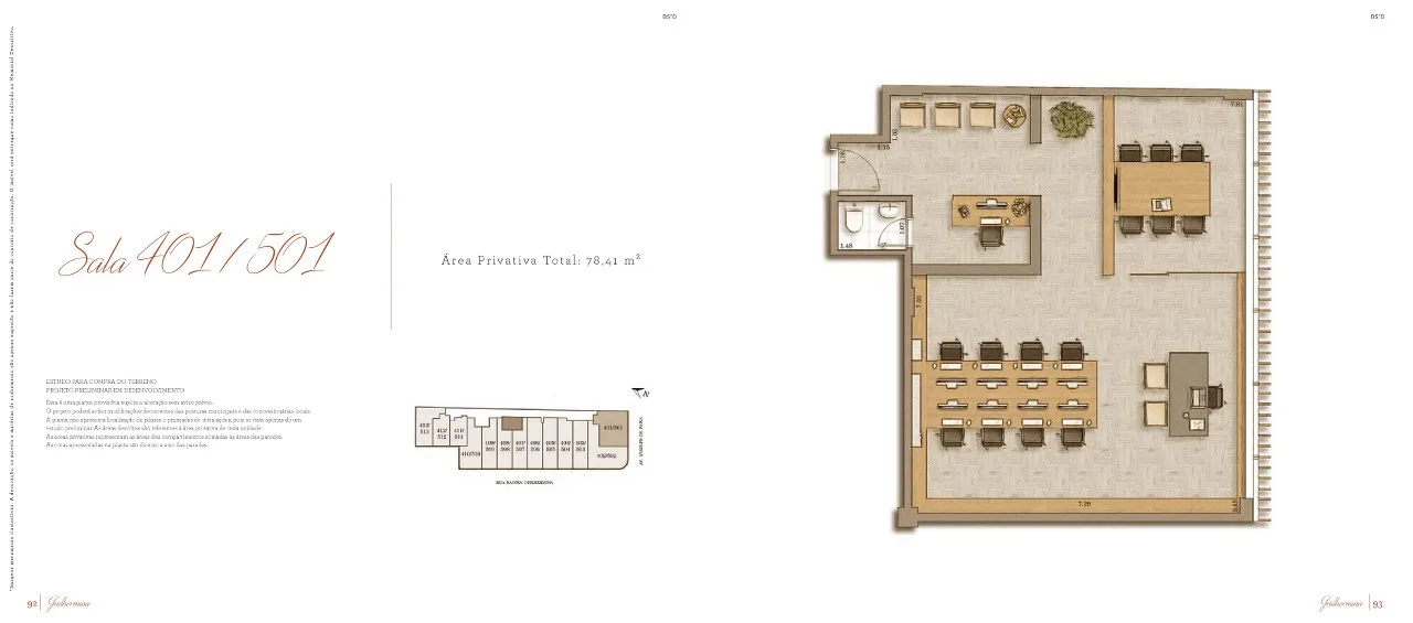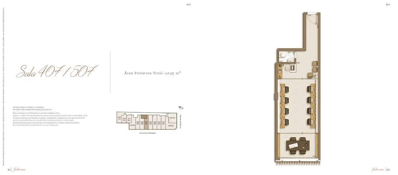 As salas comerciais que compõem o Guilhermina Leblon exibem configurações variadas com metragens de 35 m² a 160 m², com plantas sofisticadas que oferecem excelente aproveitamento do espaço interno, sem desperdícios. Sua infraestrutura também é entregue totalmente equipada para receber qualquer modelo de negócio, bem como para receber futuras instalações por parte de seus proprietários. As unidades possuem direito de 1 vaga no estacionamento do empreendimento.