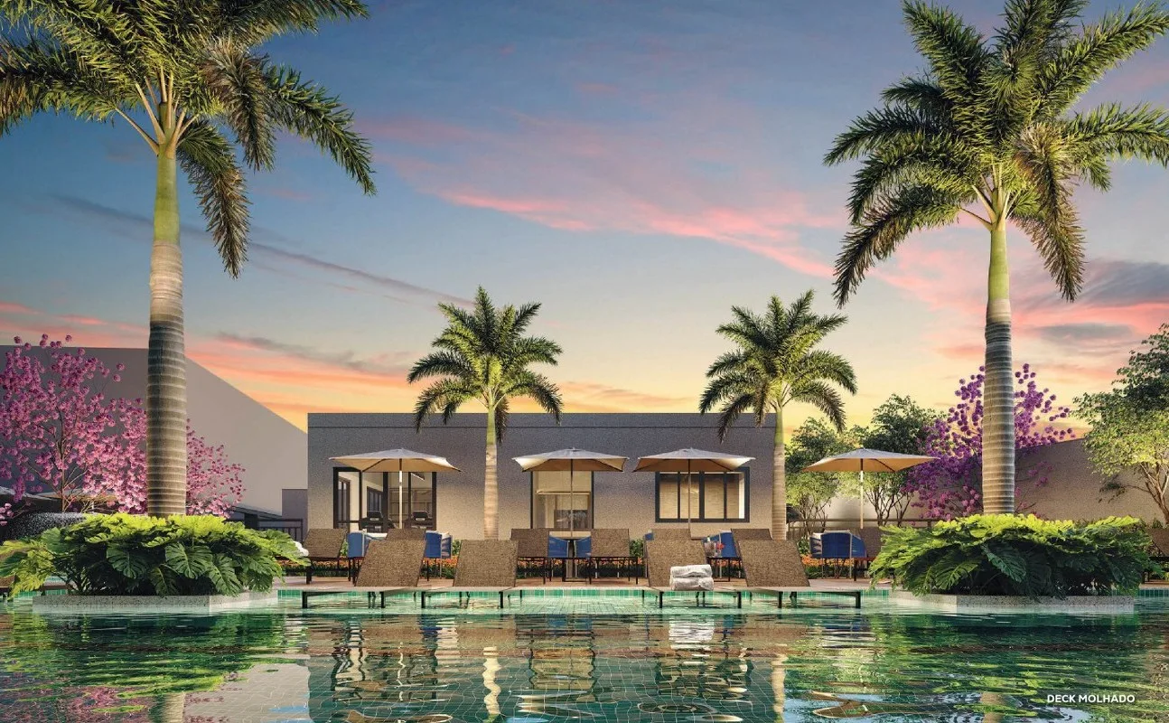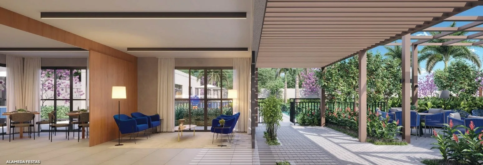 O projeto oferece 308 unidades, incluindo apartamentos e apartamentos garden, com opções de plantas que variam de 47 a 111 m². As unidades possuem 2 a 3 quartos, com 1 suíte, e contam com varanda gourmet, proporcionando um espaço ideal para convivência e lazer. Os interiores foram projetados por Mo Figueiredo e Marcela Aubry Arquitetura, que utilizaram tons claros, madeira e elementos orgânicos para criar ambientes acolhedores e harmoniosos.