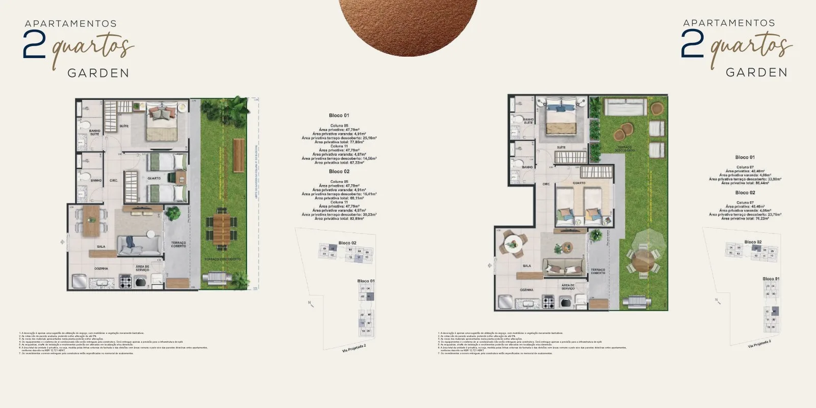 As unidades garden do Marine Barra Residence oferecem layouts bem distribuídos, com metragens entre 77,78 m² e 111,43 m². Os apartamentos possuem 2 ou 3 quartos, incluindo suíte, além de uma área externa exclusiva que amplia o conforto e a liberdade no uso dos ambientes. Com acabamentos de qualidade e integração entre sala, varanda e cozinha, essas unidades atendem famílias que buscam praticidade sem abrir mão do bem-estar.