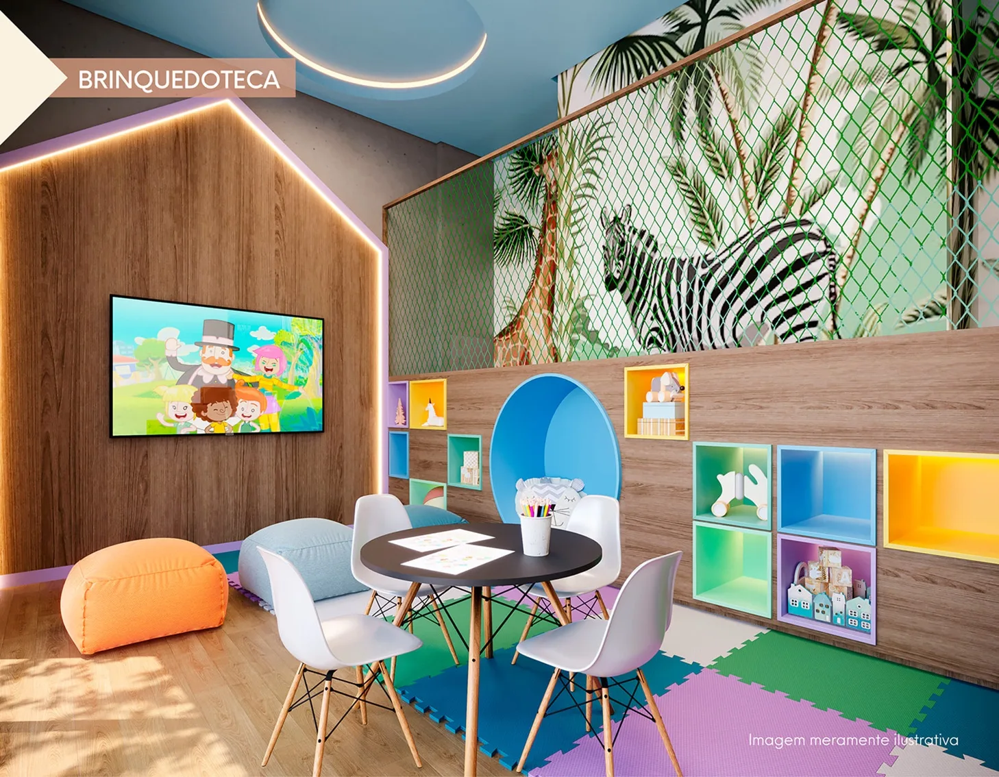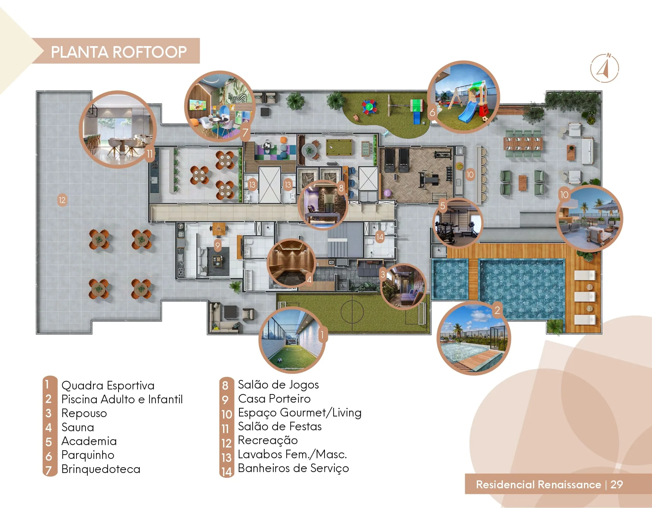 O condomínio do Renaissance conta com uma área de lazer completa, localizada no rooftop. Os moradores poderão desfrutar de piscina, sauna, academia, salão de festas, salão de jogos, brinquedoteca, parquinho infantil, espaço gourmet e quadra esportiva. Além disso, o empreendimento oferece vagas de garagem e bicicletário, garantindo comodidade e segurança, com ambientes ideais para toda a família.