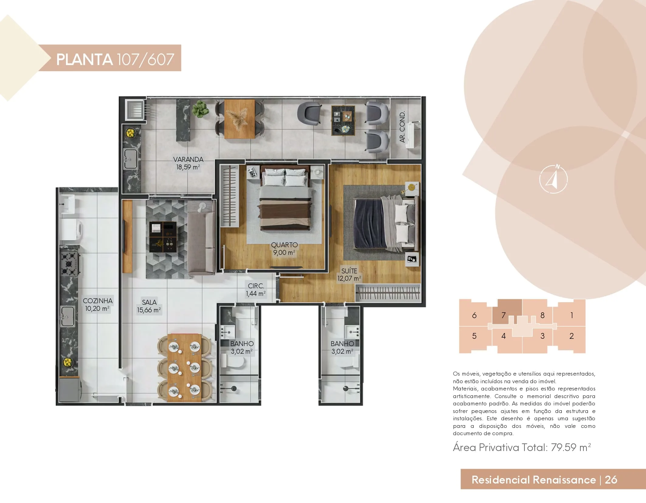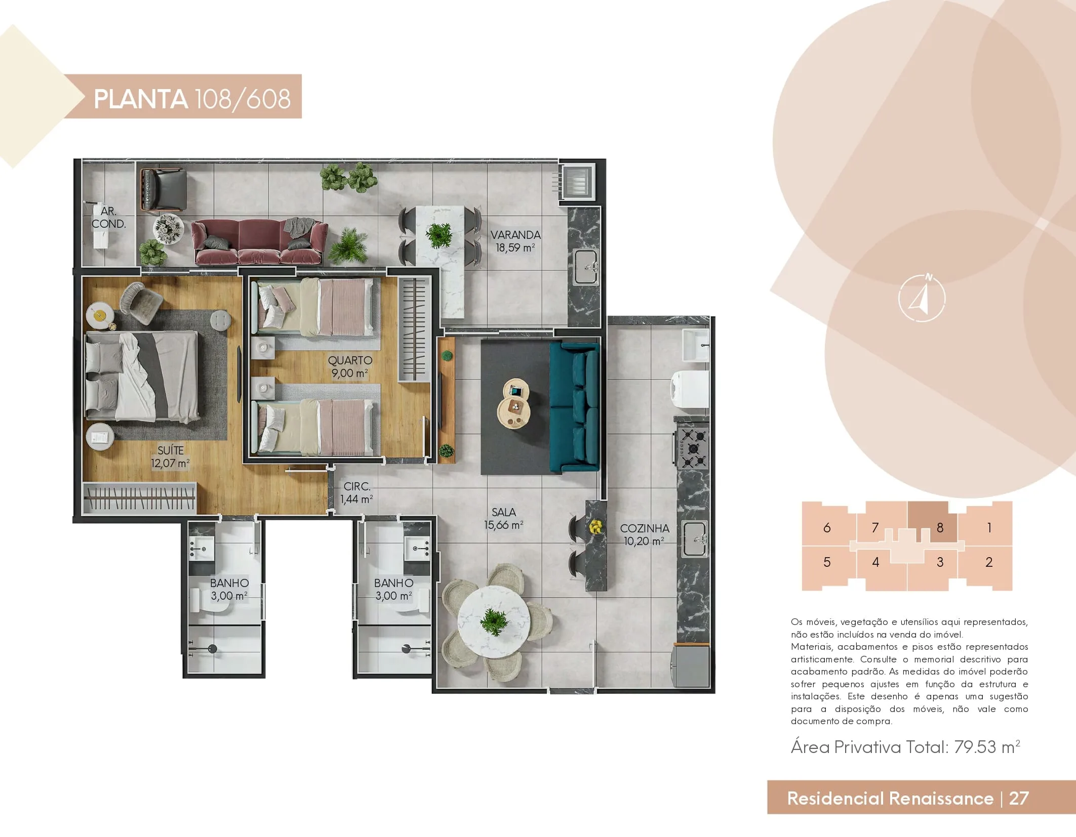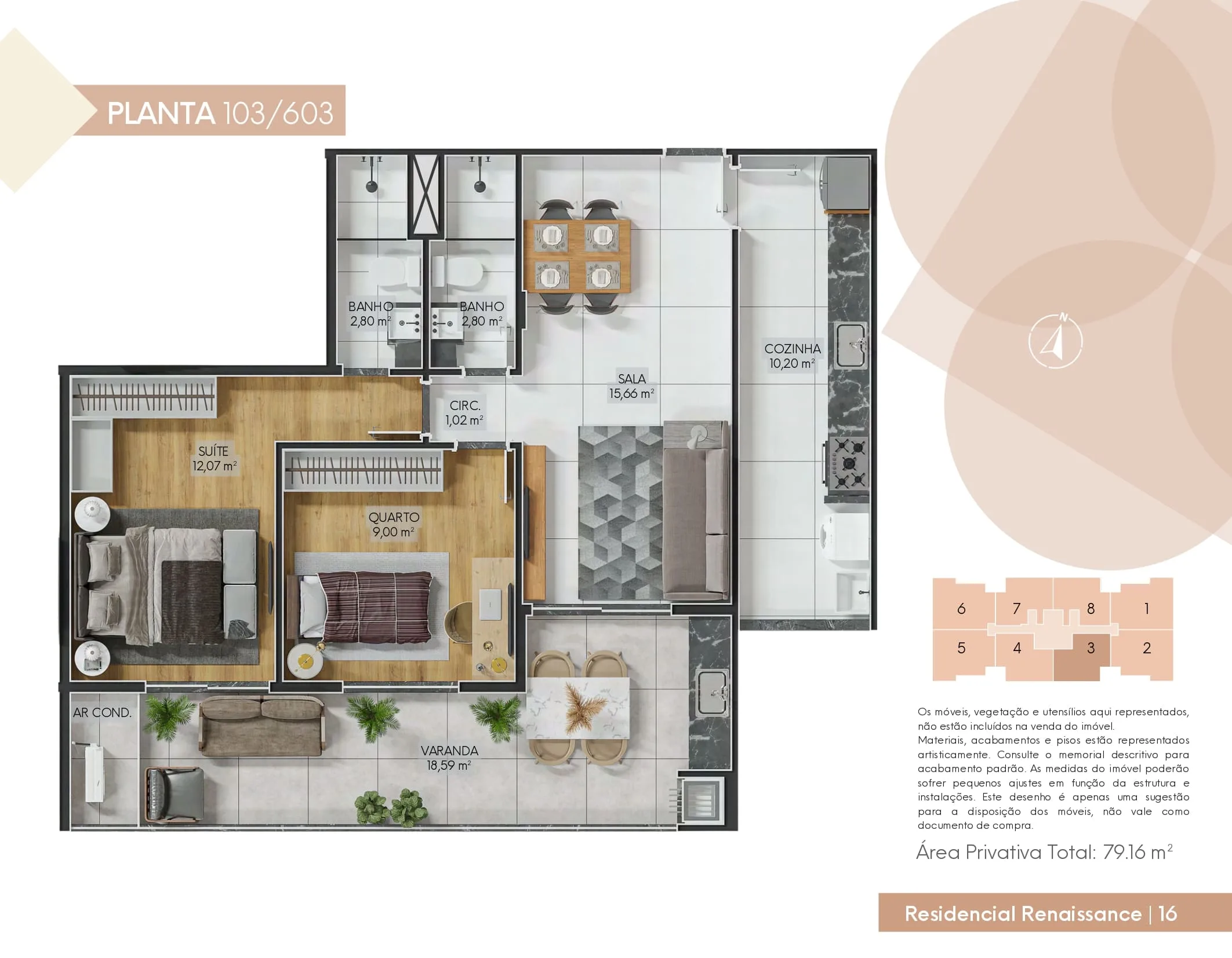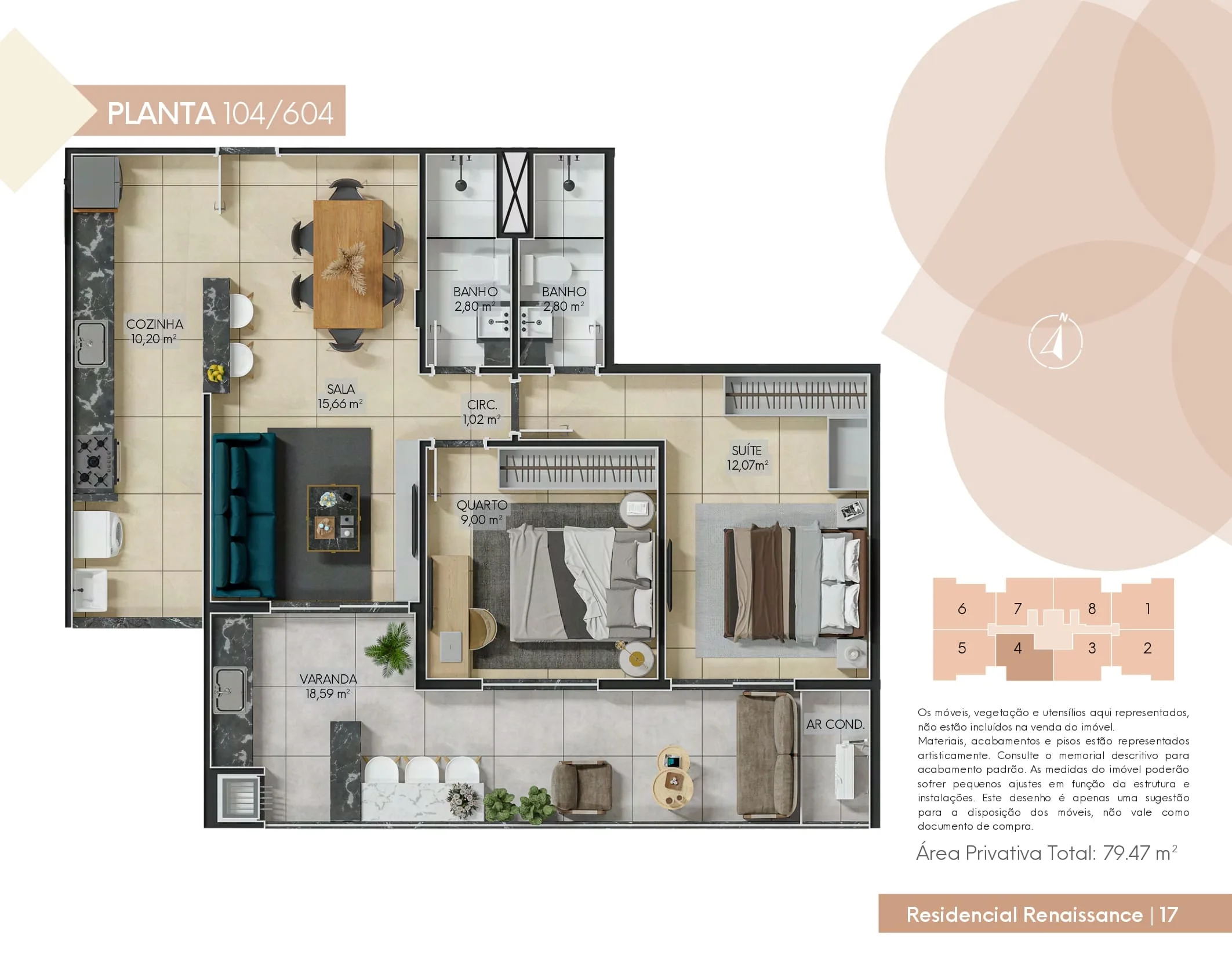 Os apartamentos do Renaissance são projetados para proporcionar conforto, funcionalidade e integração entre os ambientes. As plantas variam entre 79 m² e 98 m², com opções de 2 ou 3 quartos, todas com 1 suíte, varanda gourmet e cozinha em conceito aberto. As unidades contam ainda com vagas de garagem e excelente distribuição dos espaços, garantindo praticidade e conforto para famílias e casais.