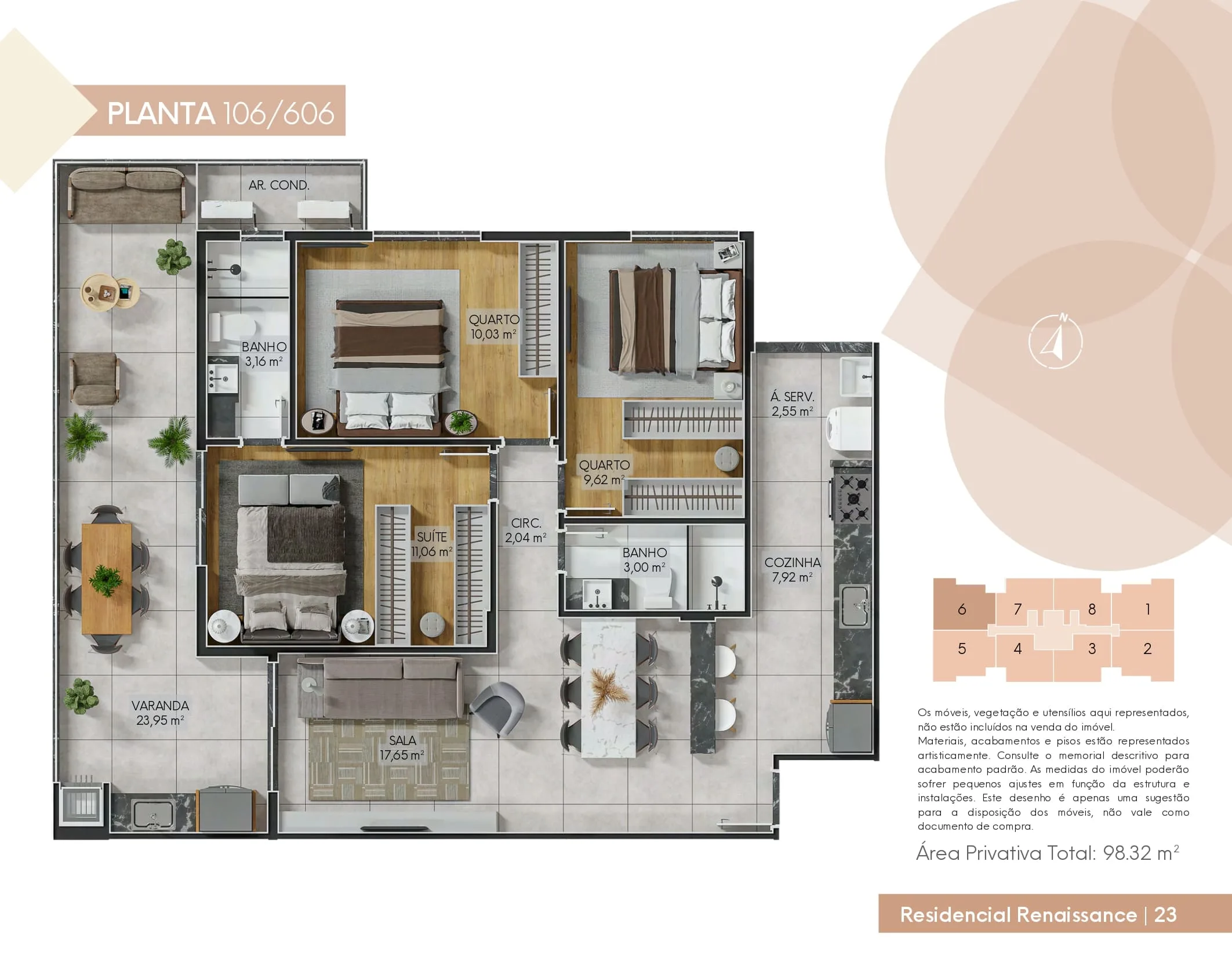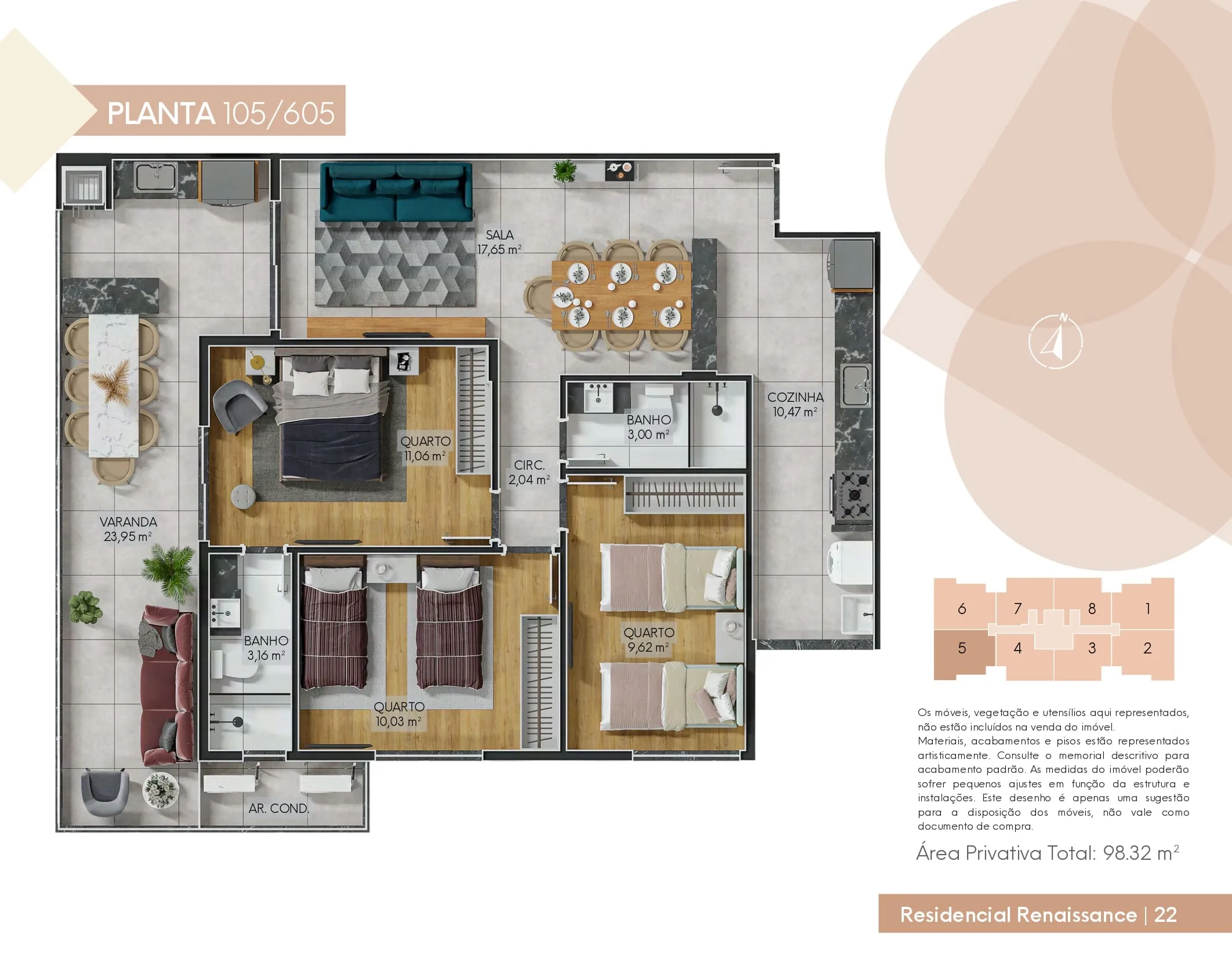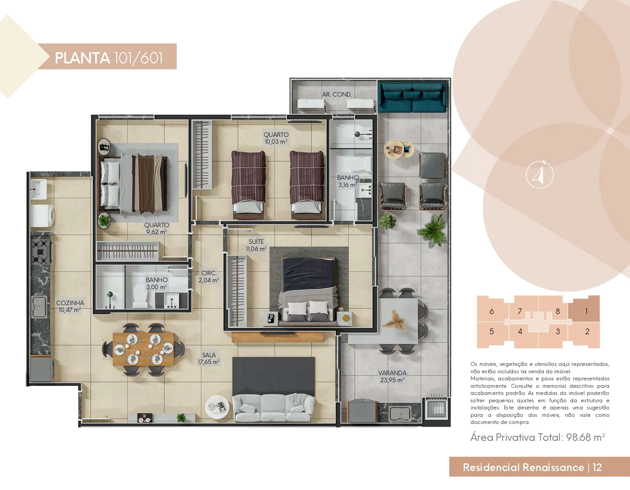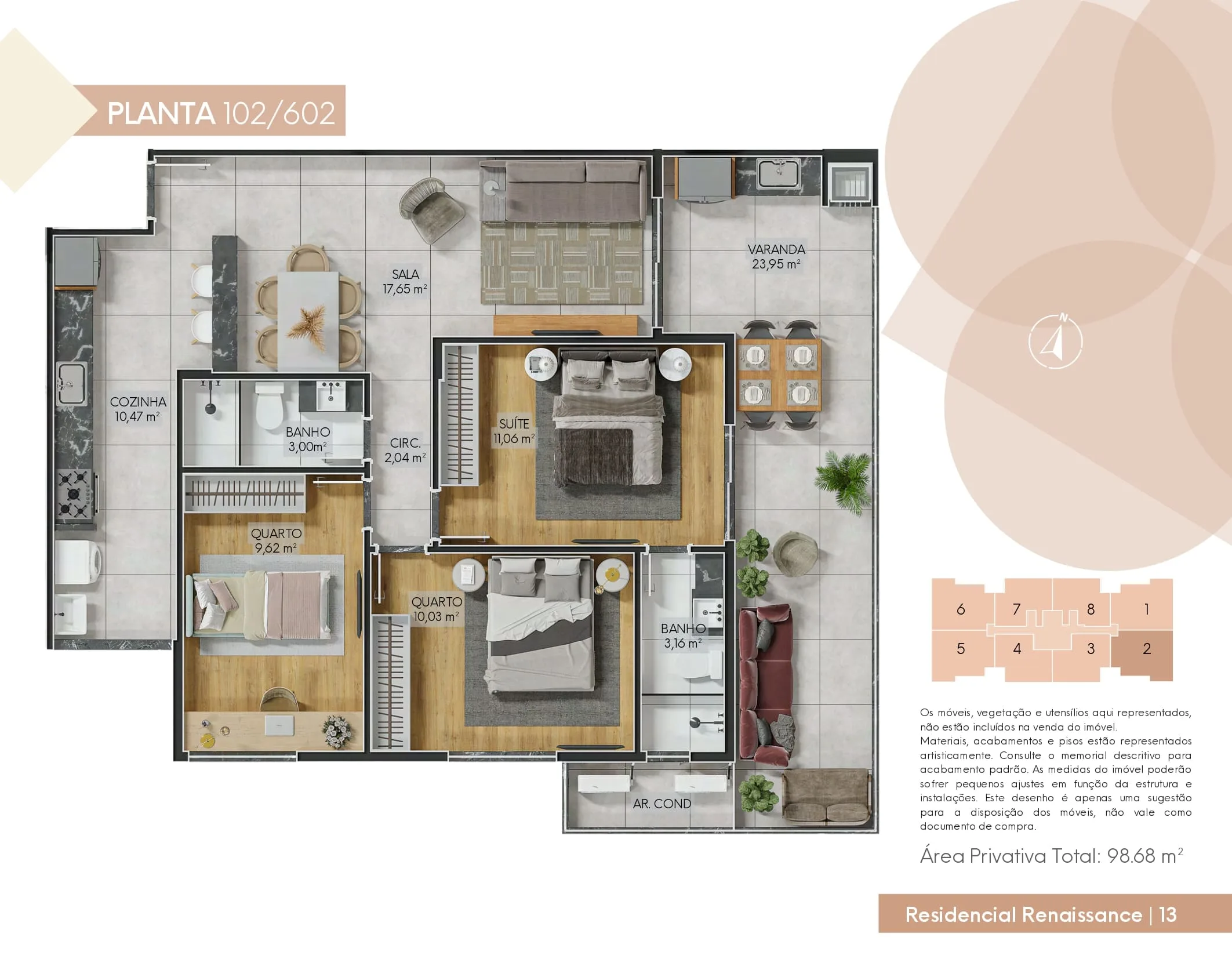 Os apartamentos do Renaissance são projetados para proporcionar conforto, funcionalidade e integração entre os ambientes. As plantas variam entre 79 m² e 98 m², com opções de 2 ou 3 quartos, todas com 1 suíte, varanda gourmet e cozinha em conceito aberto. As unidades contam ainda com vagas de garagem e excelente distribuição dos espaços, garantindo praticidade e conforto para famílias e casais.