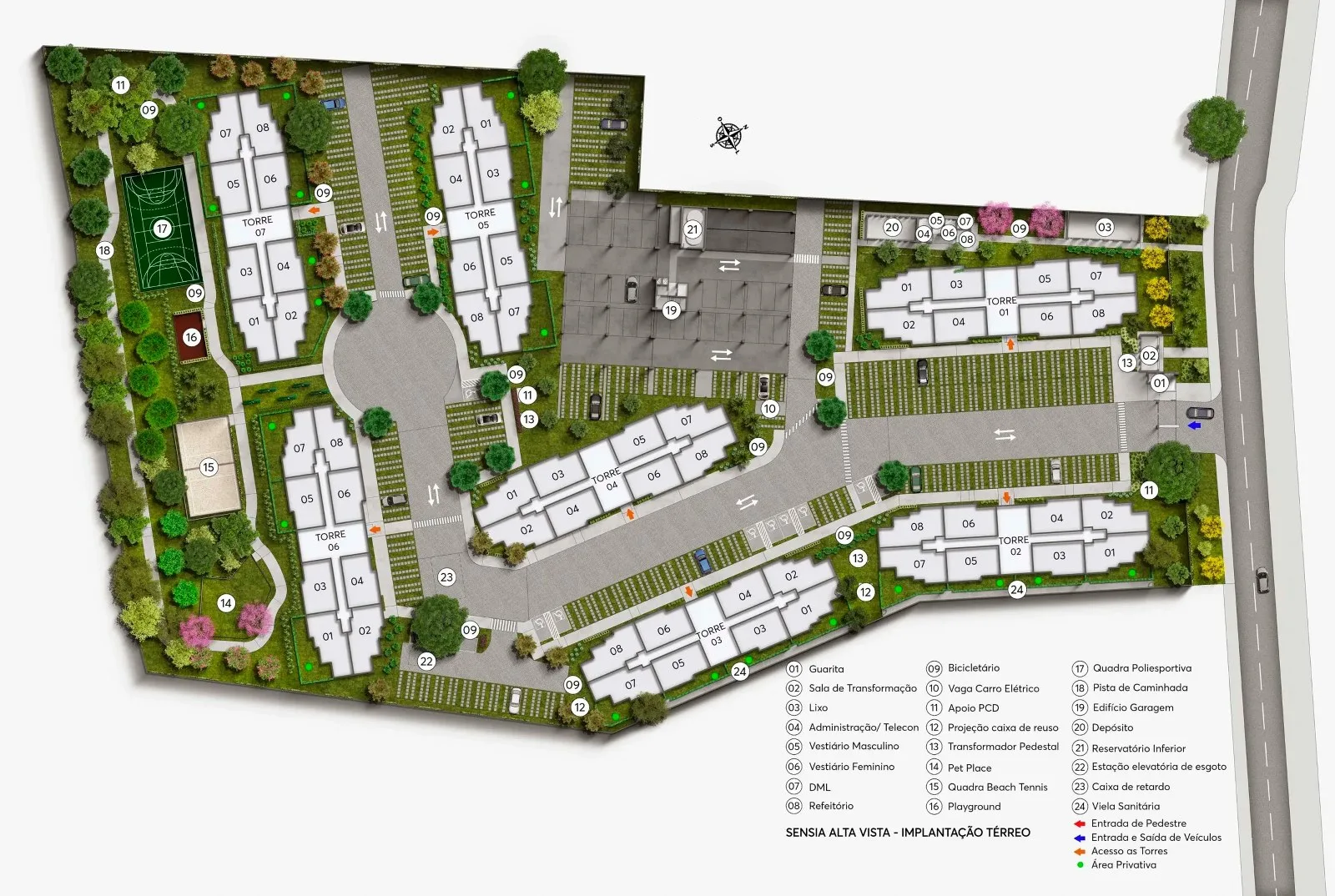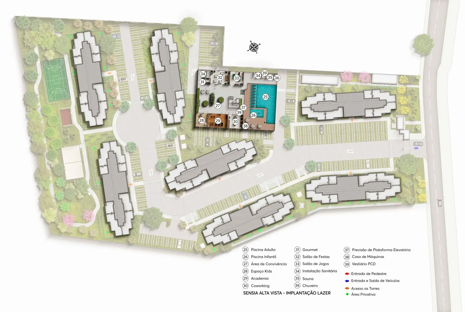 A área de lazer é composta por espaços para a diversão, relaxamento e o bem-estar de diferentes faixas etárias. Entre os itens estão espaço gourmet, sofisticado salão de festas, salão de jogos, uma agradável área de convivência, espaço kids, academia com equipamentos modernos, piscina adulto e infantil, deck molhado, quadra recreativa, playground, pista de caminhada, quadra de beach tennis, pet place, espaço coworking, sauna e bicicletário. O sistema de segurança que integra a infraestrutura do condomínio abrange uma guarita, total controle de acessos de pedestres e veículos, além da expectativa de apresentar um circuito de monitoramento constante. O residencial contará, ainda, com itens de acessibilidade, como rampas e adaptações, e iniciativas sustentáveis que propõem um consumo mais consciente e econômico dos recursos naturais, tais como água e energia elétrica, além de soluções que minimizem impactos no meio ambiente, como coleta seletiva de resíduos.