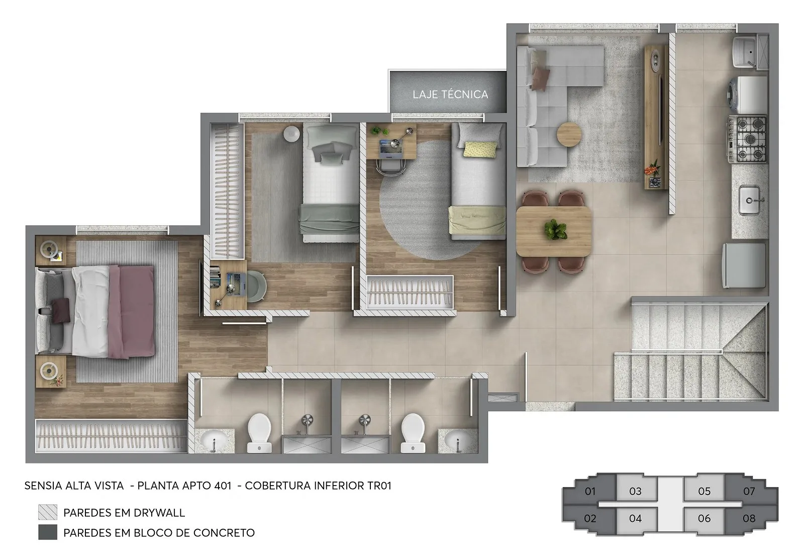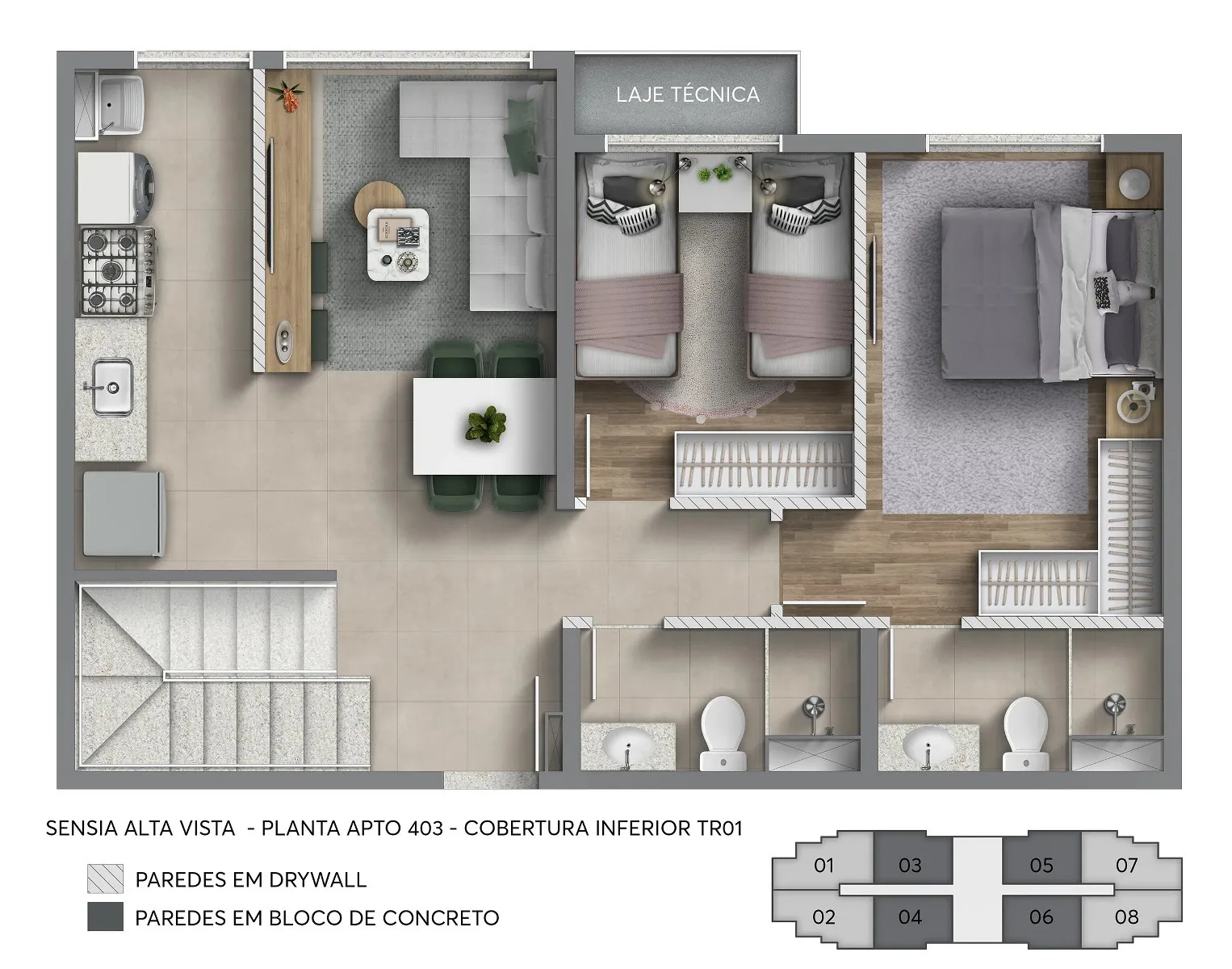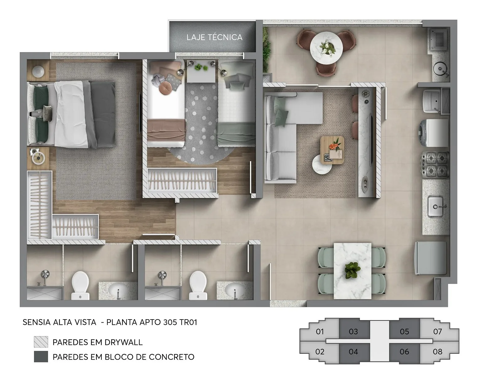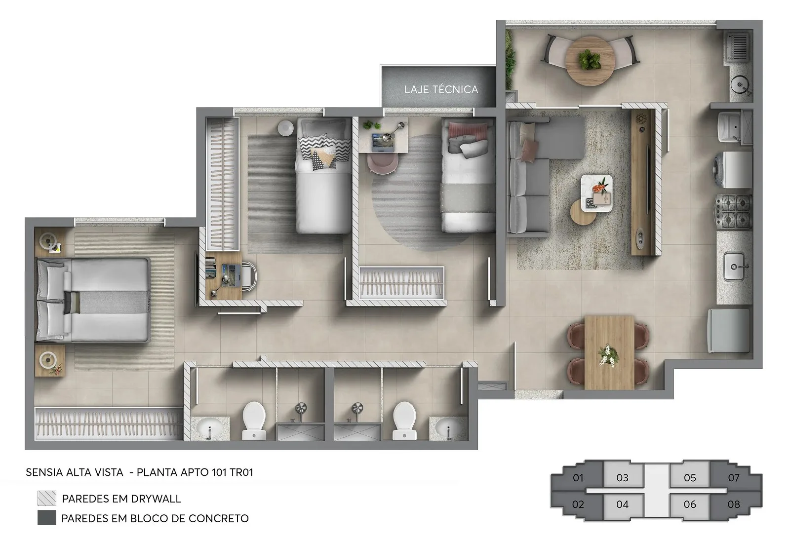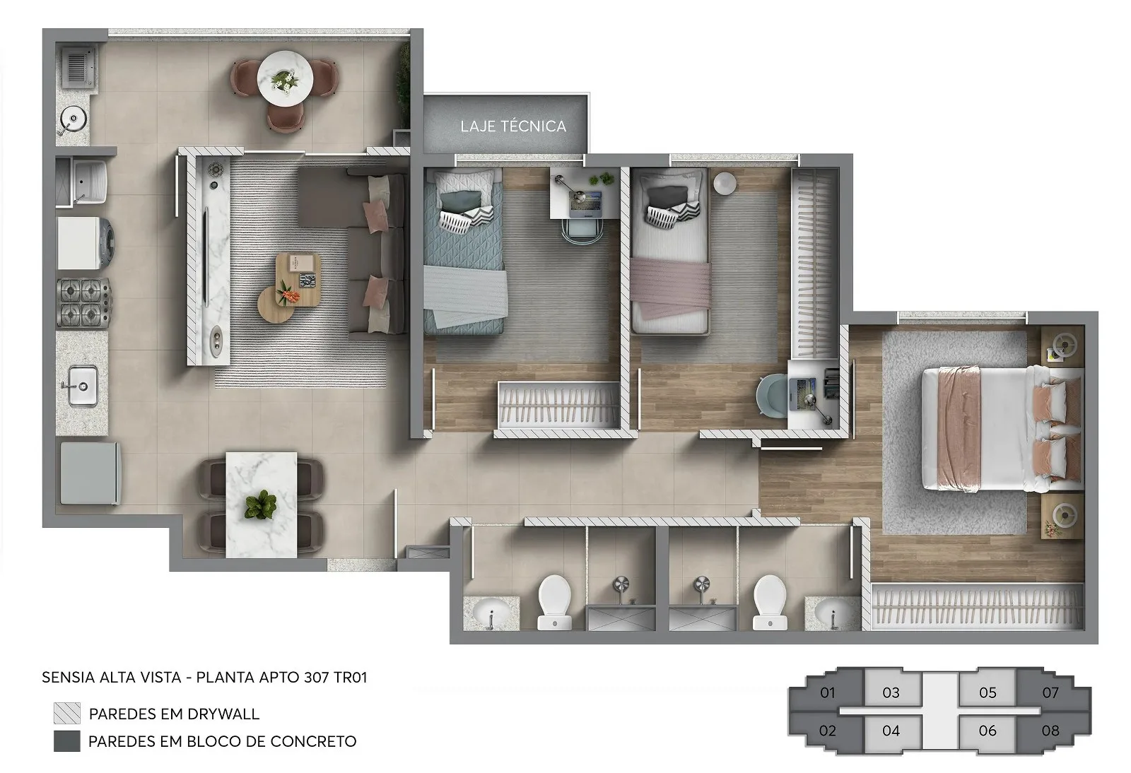 Os apartamentos do Sensia Alta Vista Camorim são formulados com metragens que variam de 55 m² a 64 m², com uma distribuição inteligente e otimizada dos ambientes, o que proporciona maior aproveitamento de espaço, sem qualquer desperdício, além de excelente entrada de iluminação e ventilação naturais que contribuem para maior conforto térmico da unidade, bem como acabamentos de alto padrão e a flexibilidade de escolher revestimentos, bancadas, pisos, louças e metais.