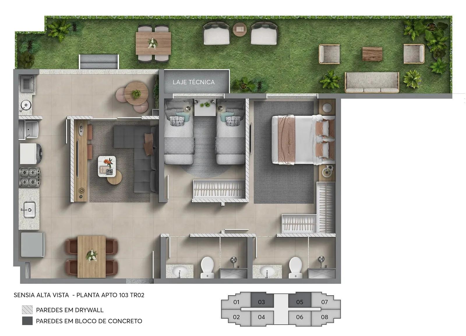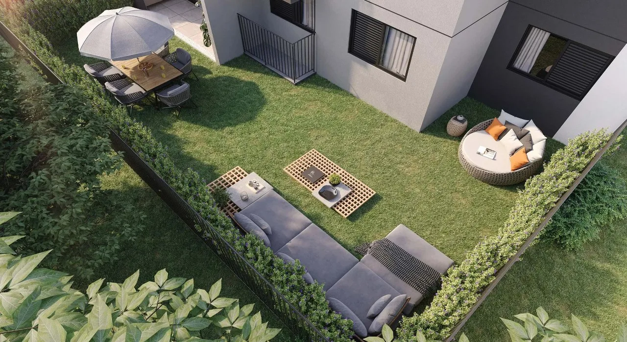 Os apartamentos garden do Sensia Alta Vista Camorim são projetados com área interna de 55 m², 2 quartos, sendo 1 suíte e garantia de vaga de garagem, bem como apresentam uma distribuição similar às demais unidades, caracterizadas por cômodos modernos, acabamentos de elevado padrão de qualidade e opção de personalização dos itens que compõem o imóvel. O grande diferencial das unidades está em um agradável terraço descoberto que se estende além da varanda, com cerca de 23 m², sendo um espaço perfeito para o lazer de toda a família.