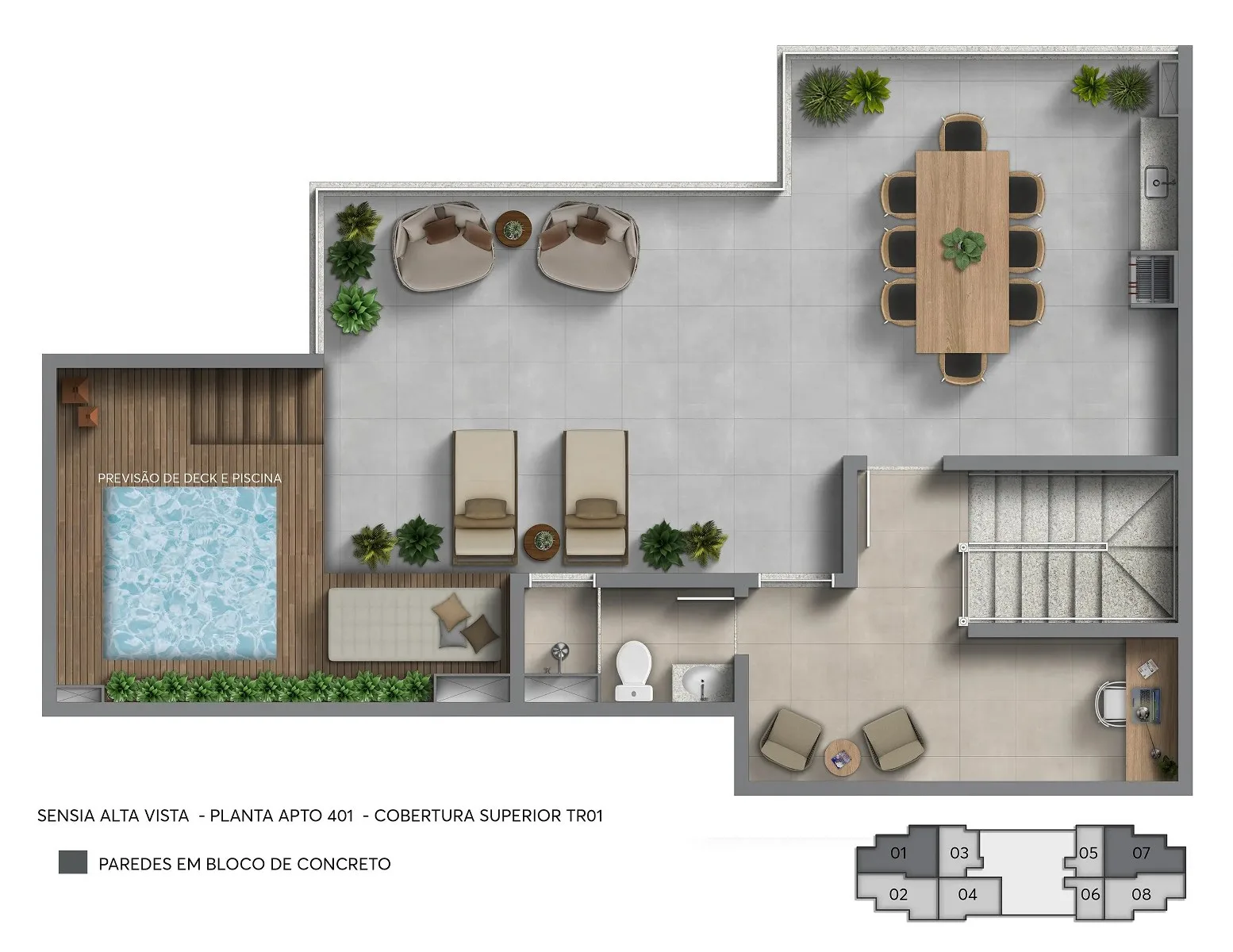 As coberturas do Sensia Alta Vista Camorim apresentam impecáveis plantas duplex de 74 m² a 83 m², com pavimentos que proporcionam maior privacidade para a família e áreas sociais refinadas. Os imóveis também possuem acabamentos de alta qualidade que refletem o luxo e o bom gosto do empreendimento, 2 ou 3 quartos, sendo pelo menos 1 suíte e vagas no estacionamento. Além disso, as coberturas são entregues com terraços privativos que apresentam entre 26 m² a 52 m², com previsão para espaço gourmet, deck e piscina.