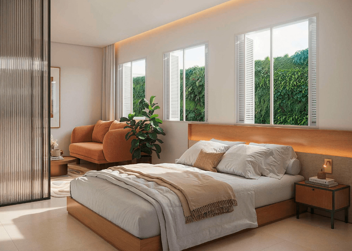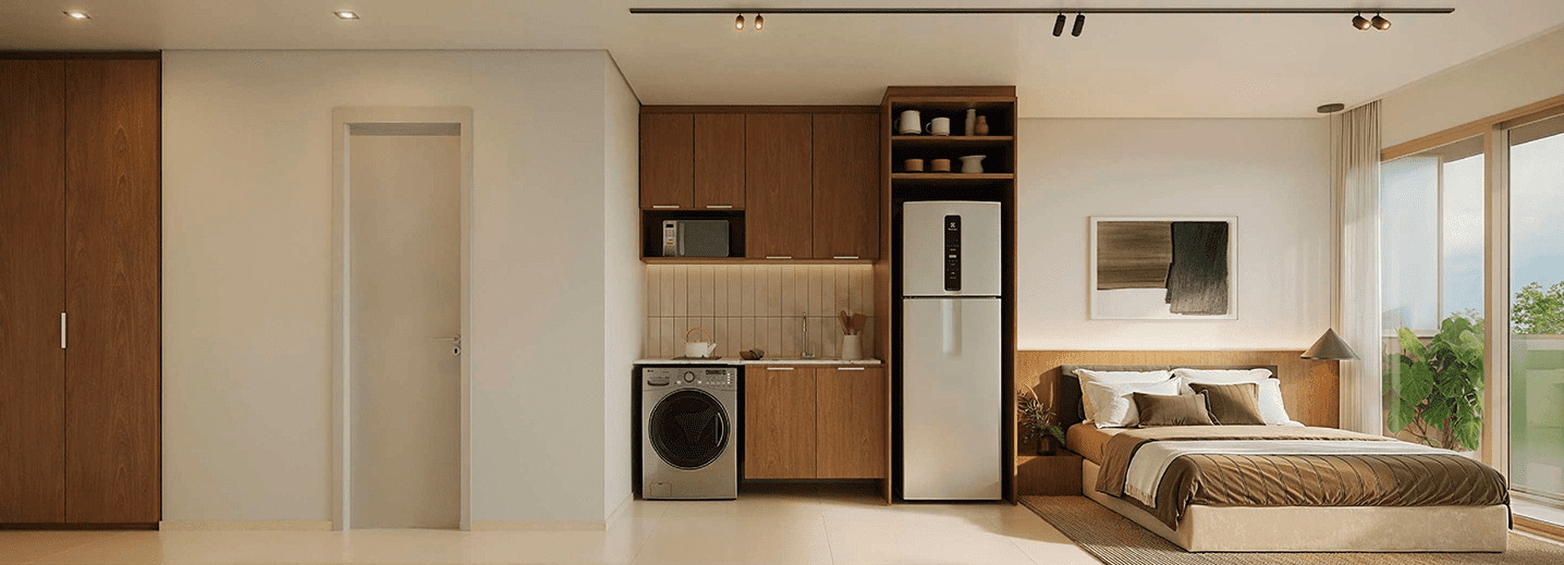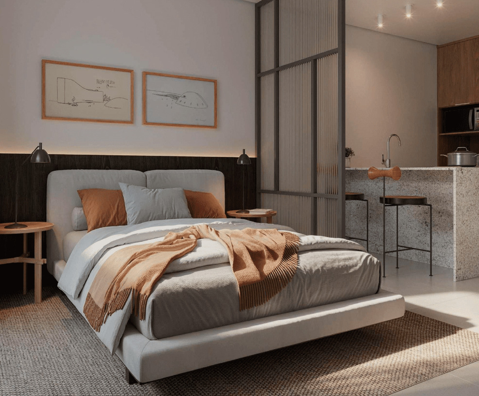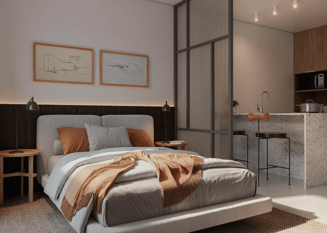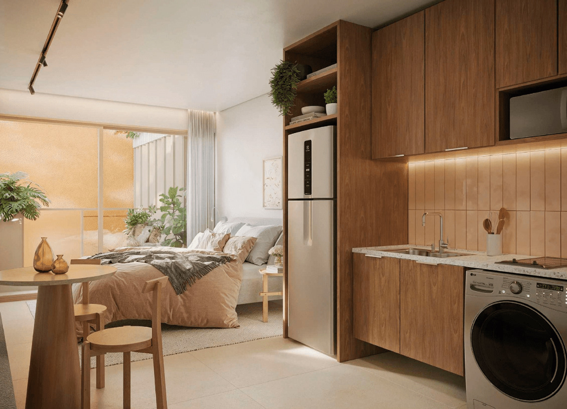Os studios do Soul Rio possuem metragens que variam entre 22 m² e 43 m², ideais para quem busca praticidade em um espaço compacto e bem planejado. As unidades contam com integração inteligente entre sala e cozinha, fechadura eletrônica, bancada funcional e infraestrutura para internet e TV. São perfeitos para moradia individual ou como investimento em locação de curta temporada, aproveitando toda a demanda de Ipanema.