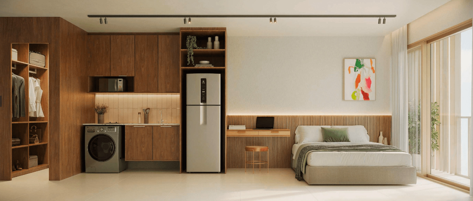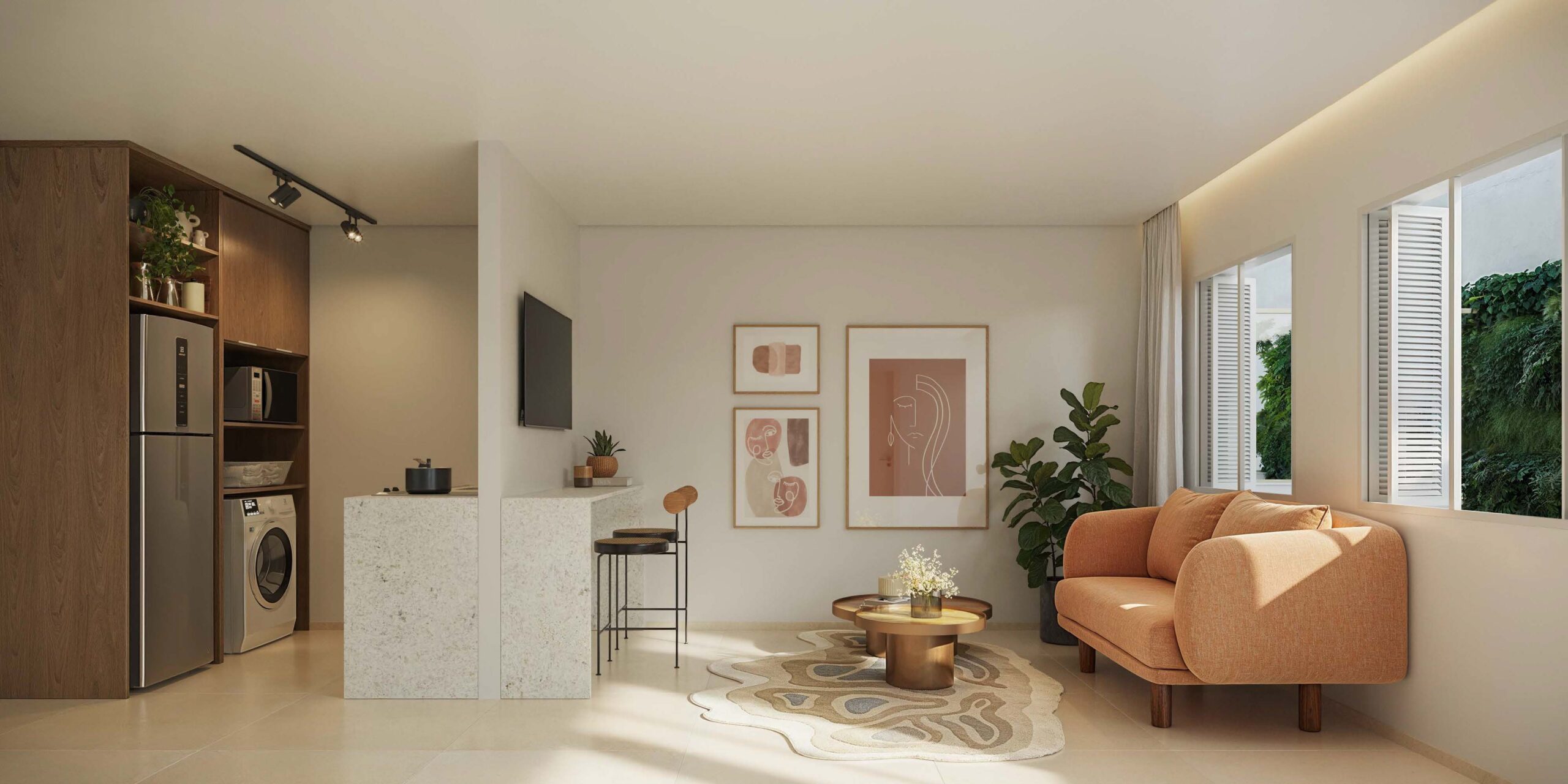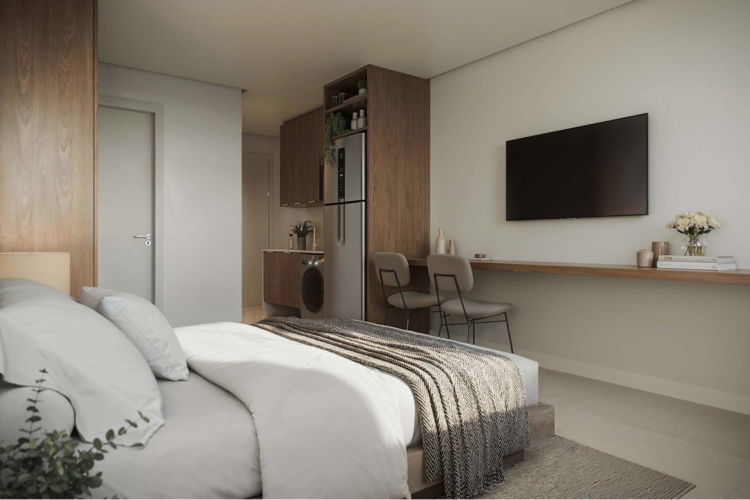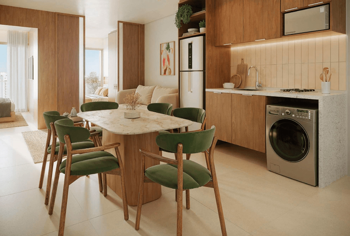 Os studios do Soul Rio possuem metragens que variam entre 22 m² e 43 m², ideais para quem busca praticidade em um espaço compacto e bem planejado. As unidades contam com integração inteligente entre sala e cozinha, fechadura eletrônica, bancada funcional e infraestrutura para internet e TV. São perfeitos para moradia individual ou como investimento em locação de curta temporada, aproveitando toda a demanda de Ipanema.