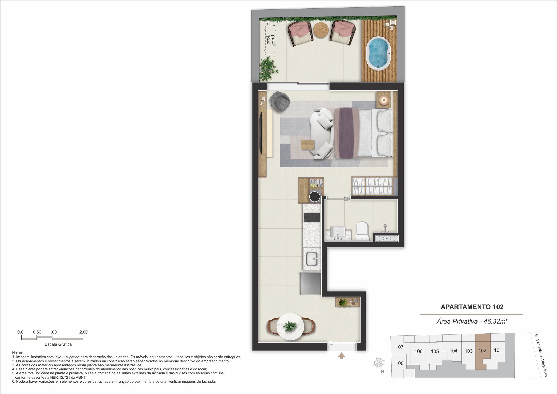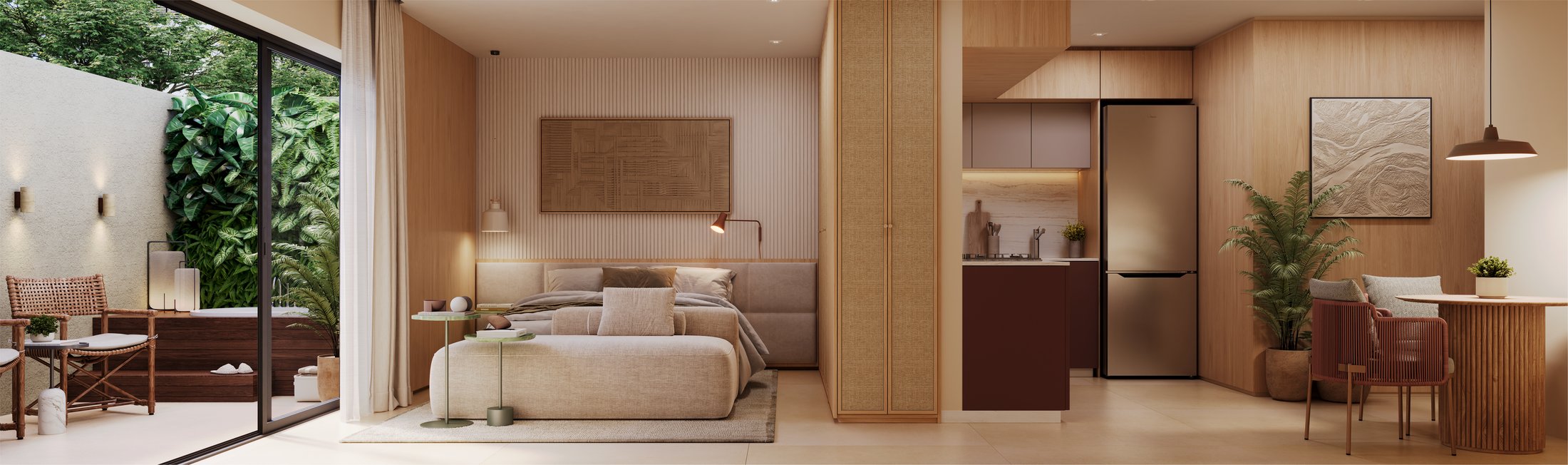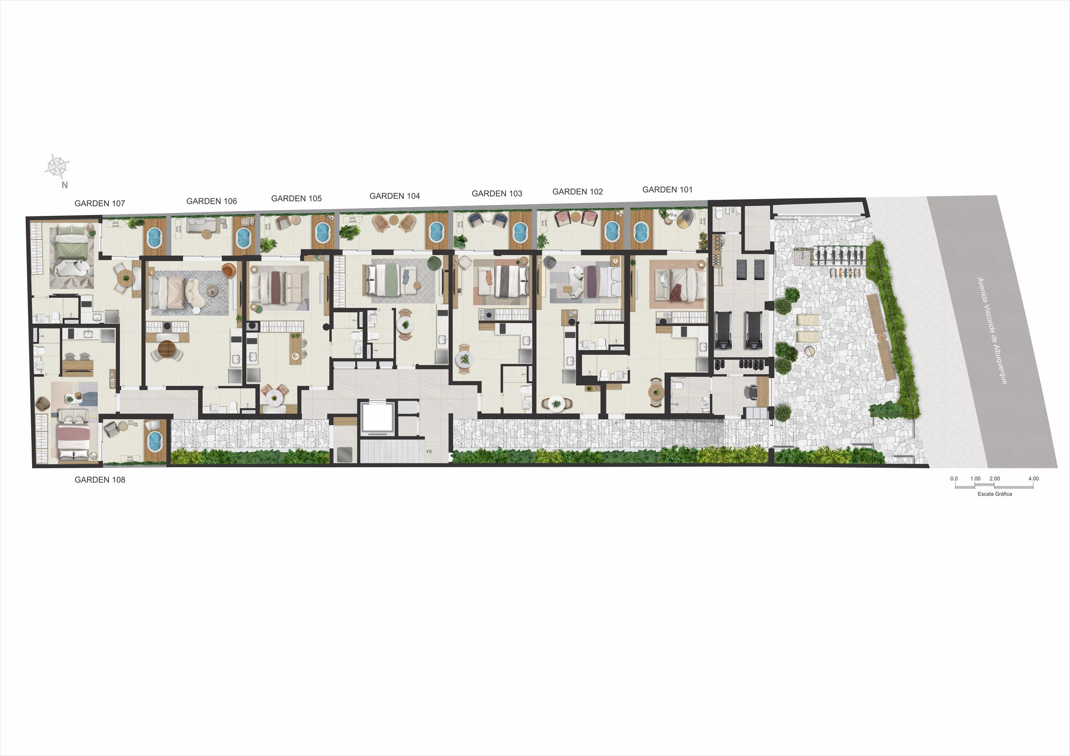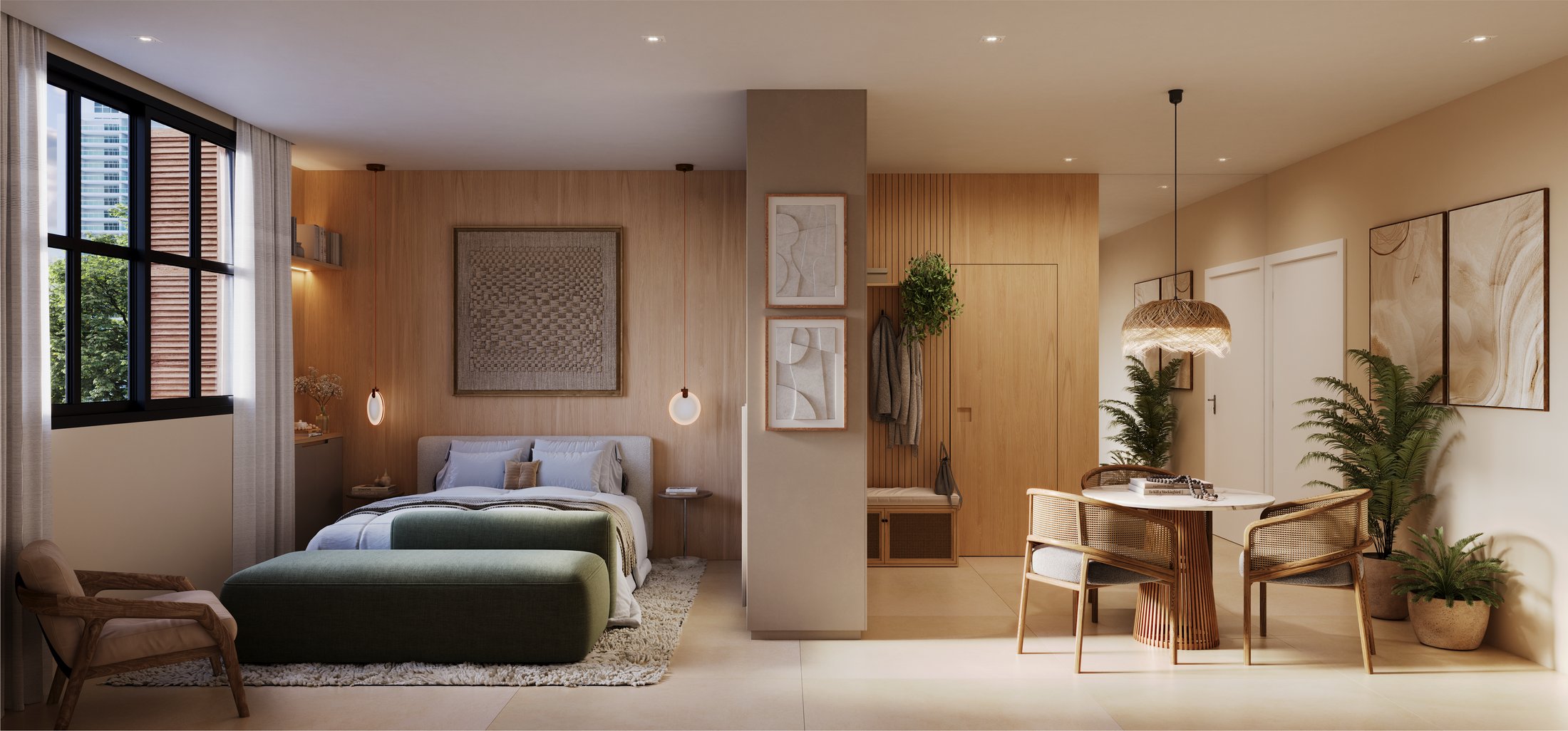 O projeto é composto por unidades Studios e Apartamentos Garden, com metragens compactas voltadas para moradia e investimento.