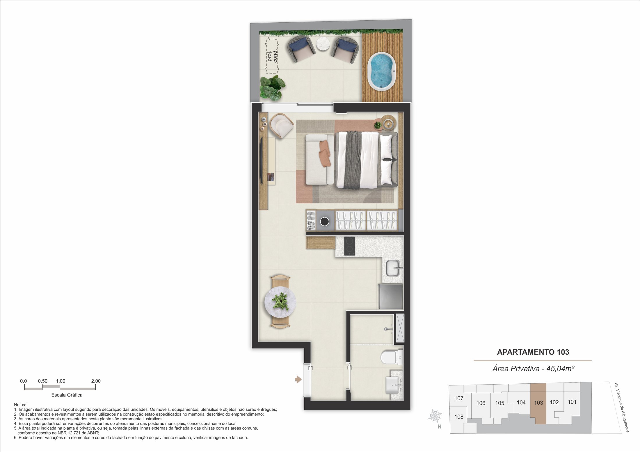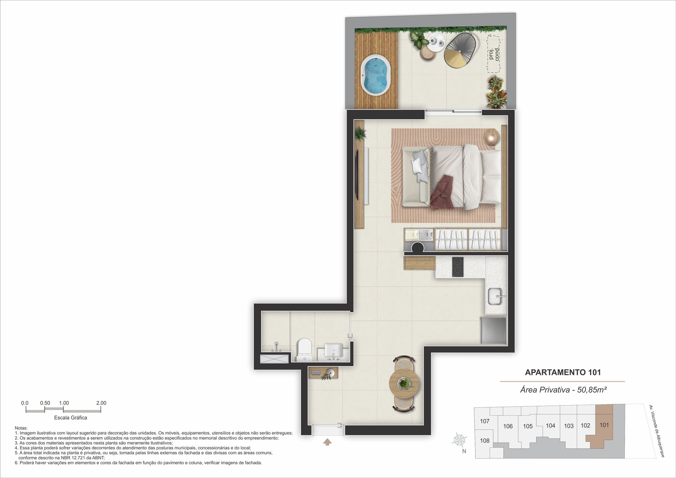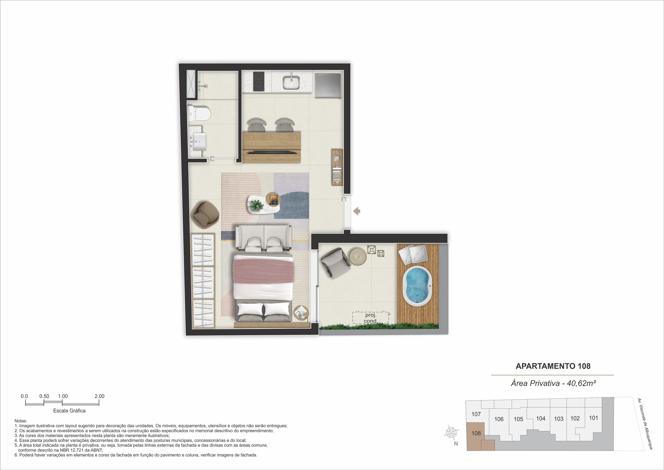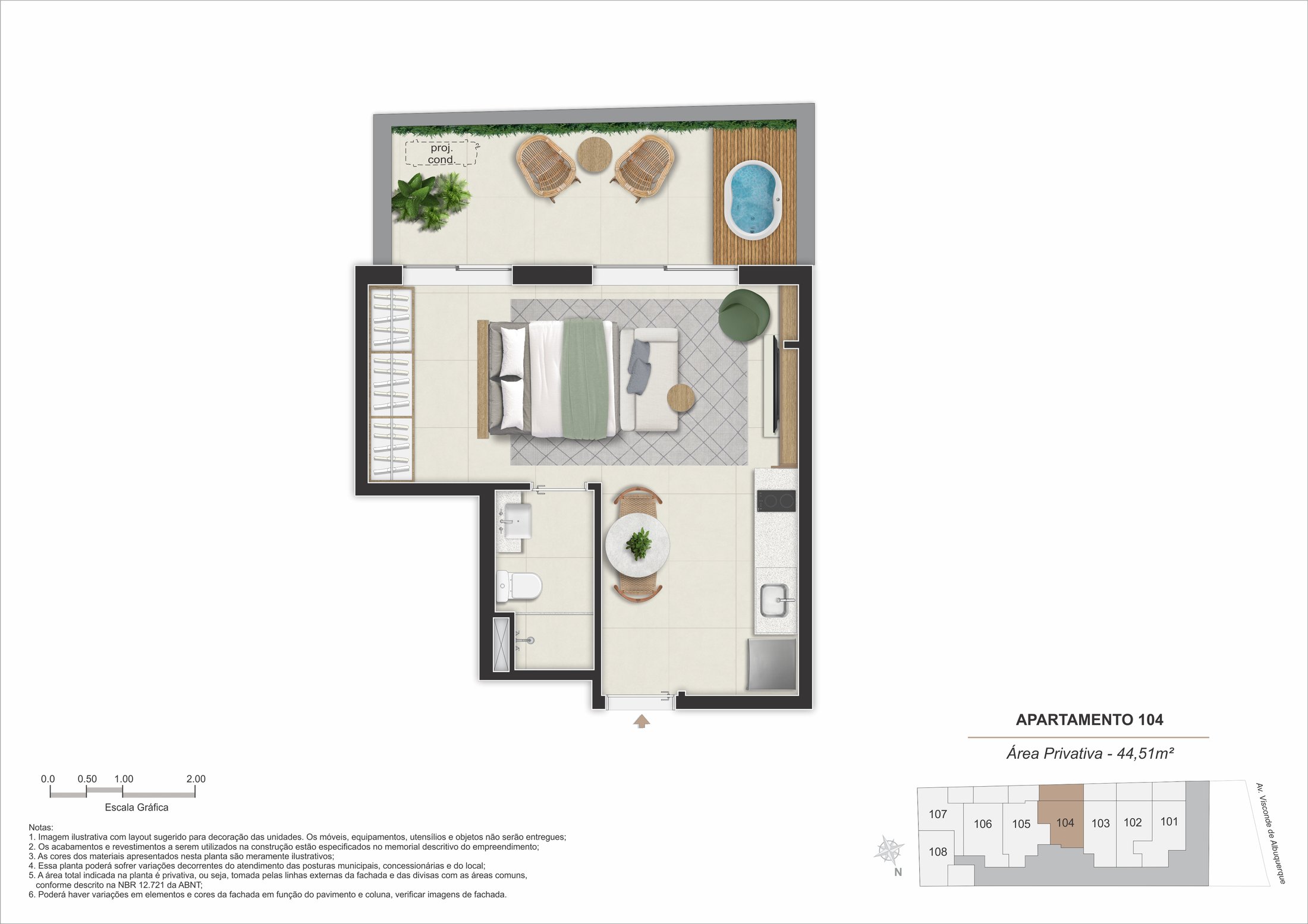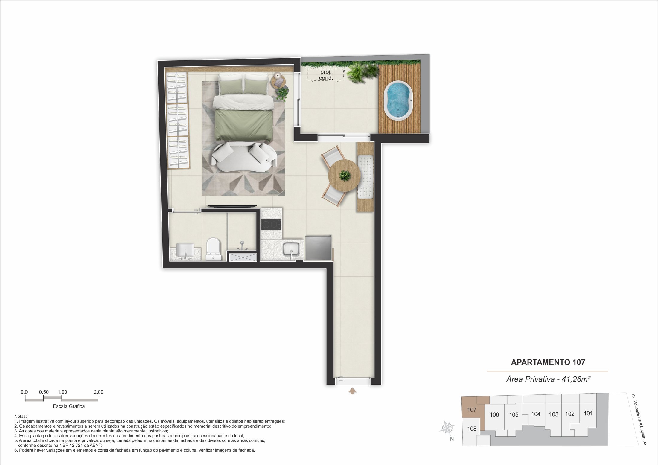 O projeto é composto por unidades Studios e Apartamentos Garden, com metragens compactas voltadas para moradia e investimento.