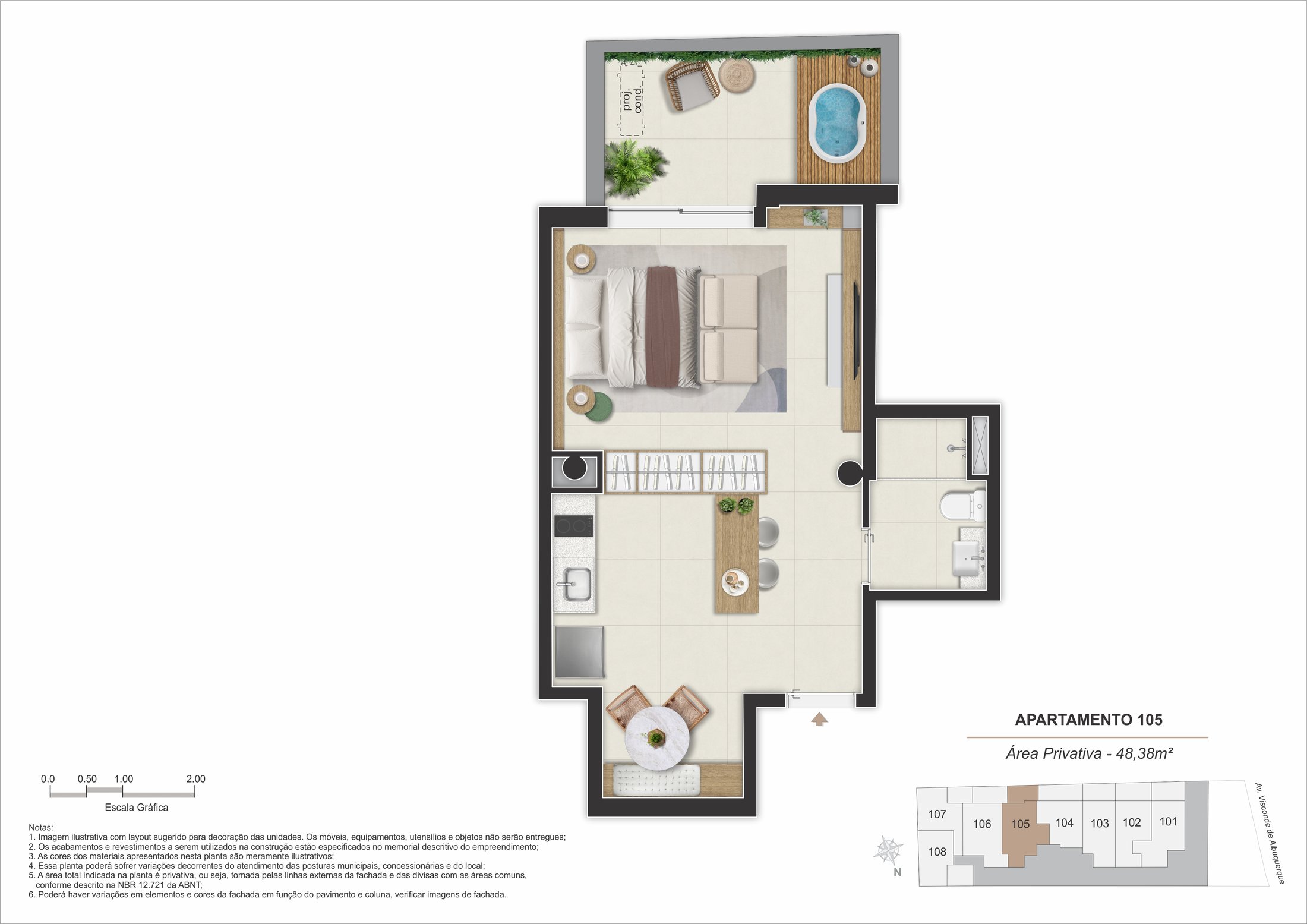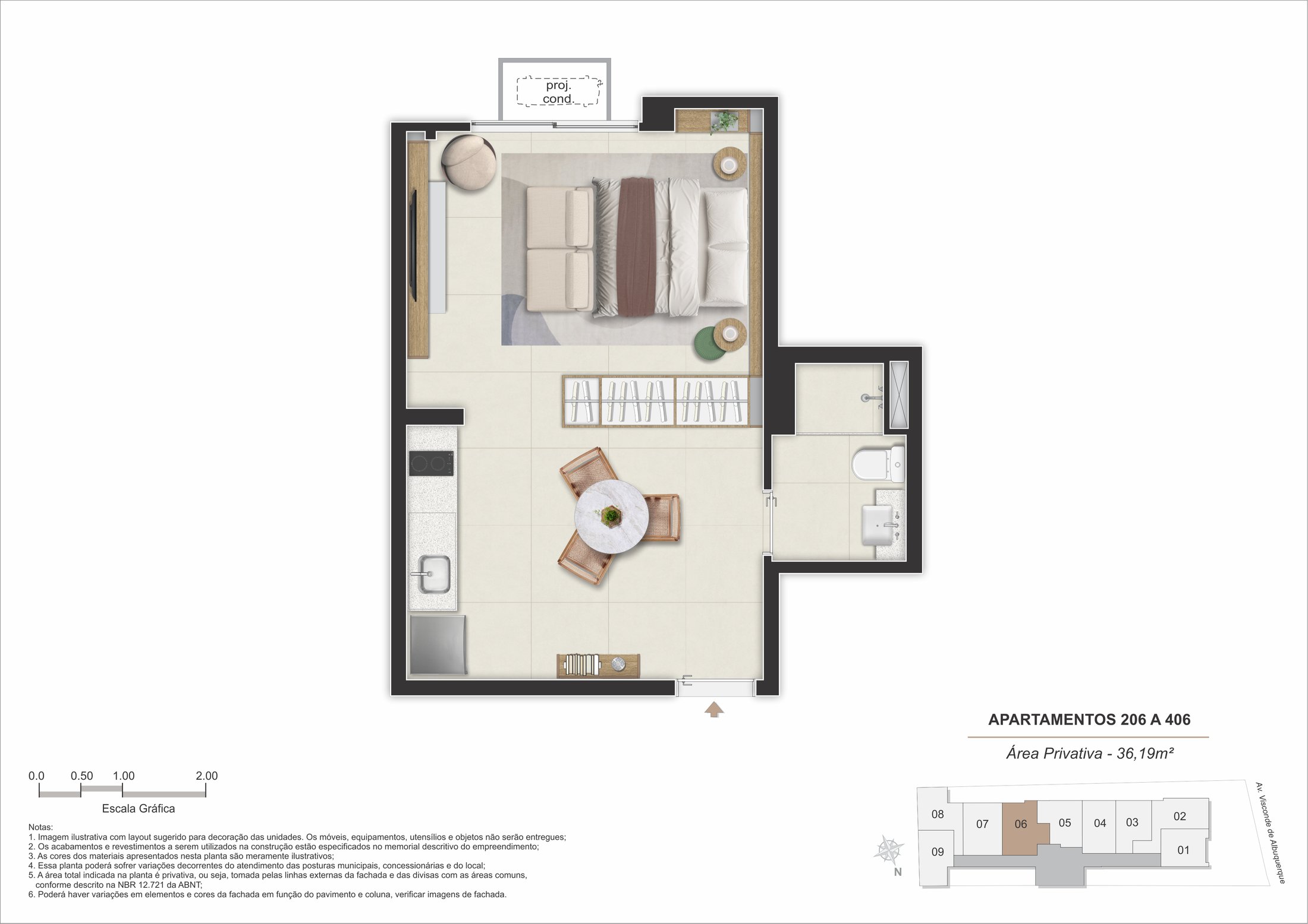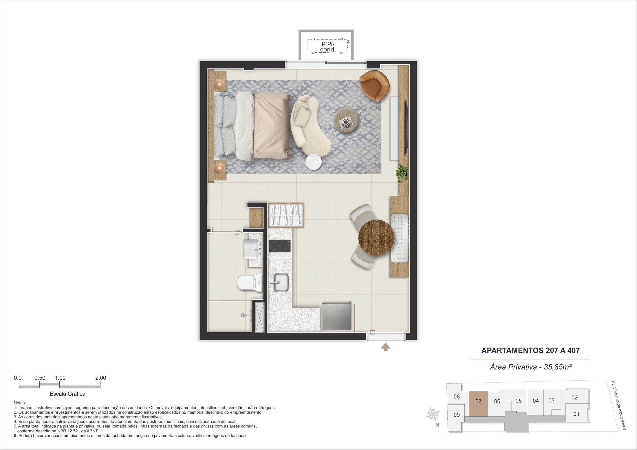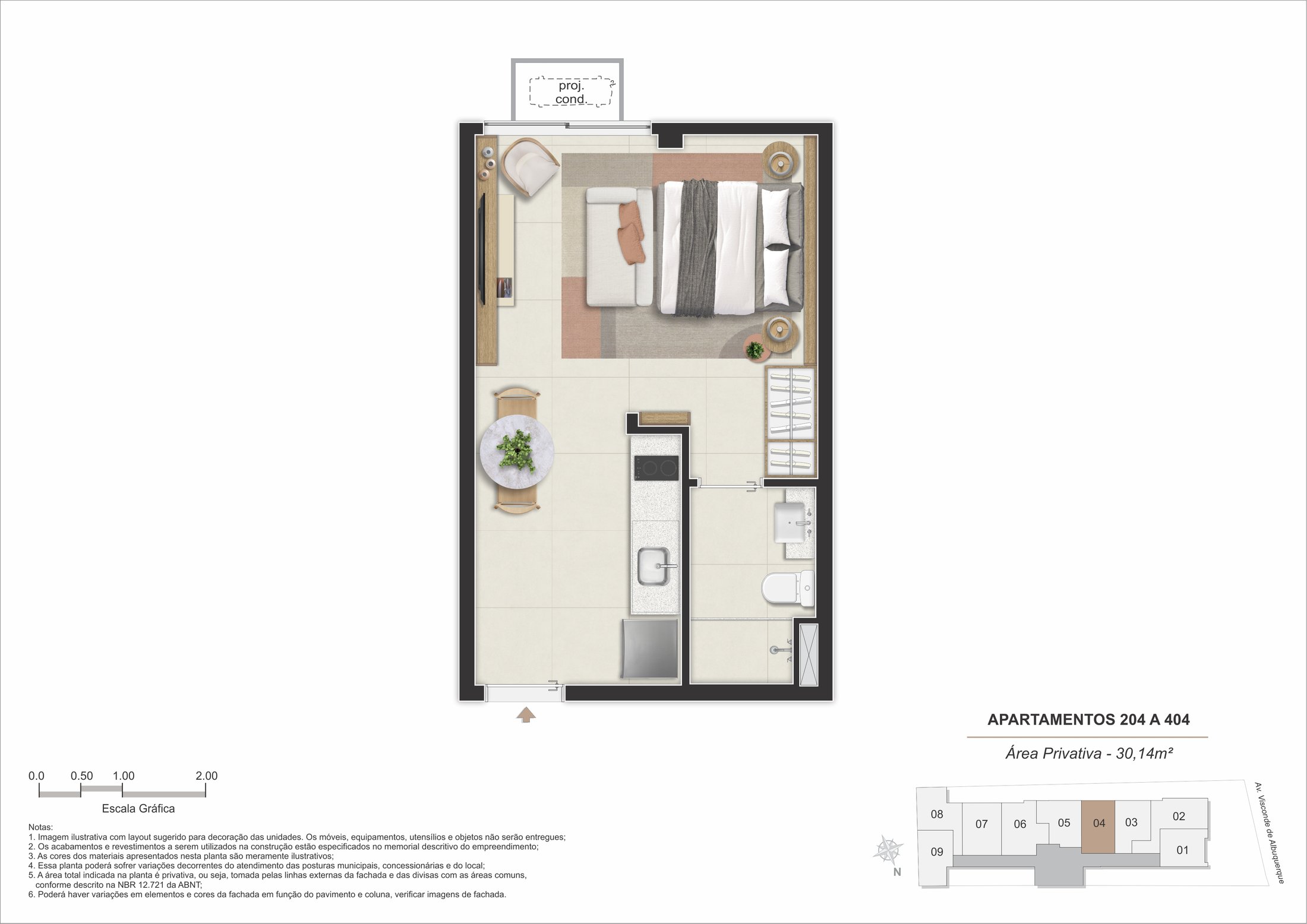 O projeto é composto por unidades Studios e Apartamentos Garden, com metragens compactas voltadas para moradia e investimento.