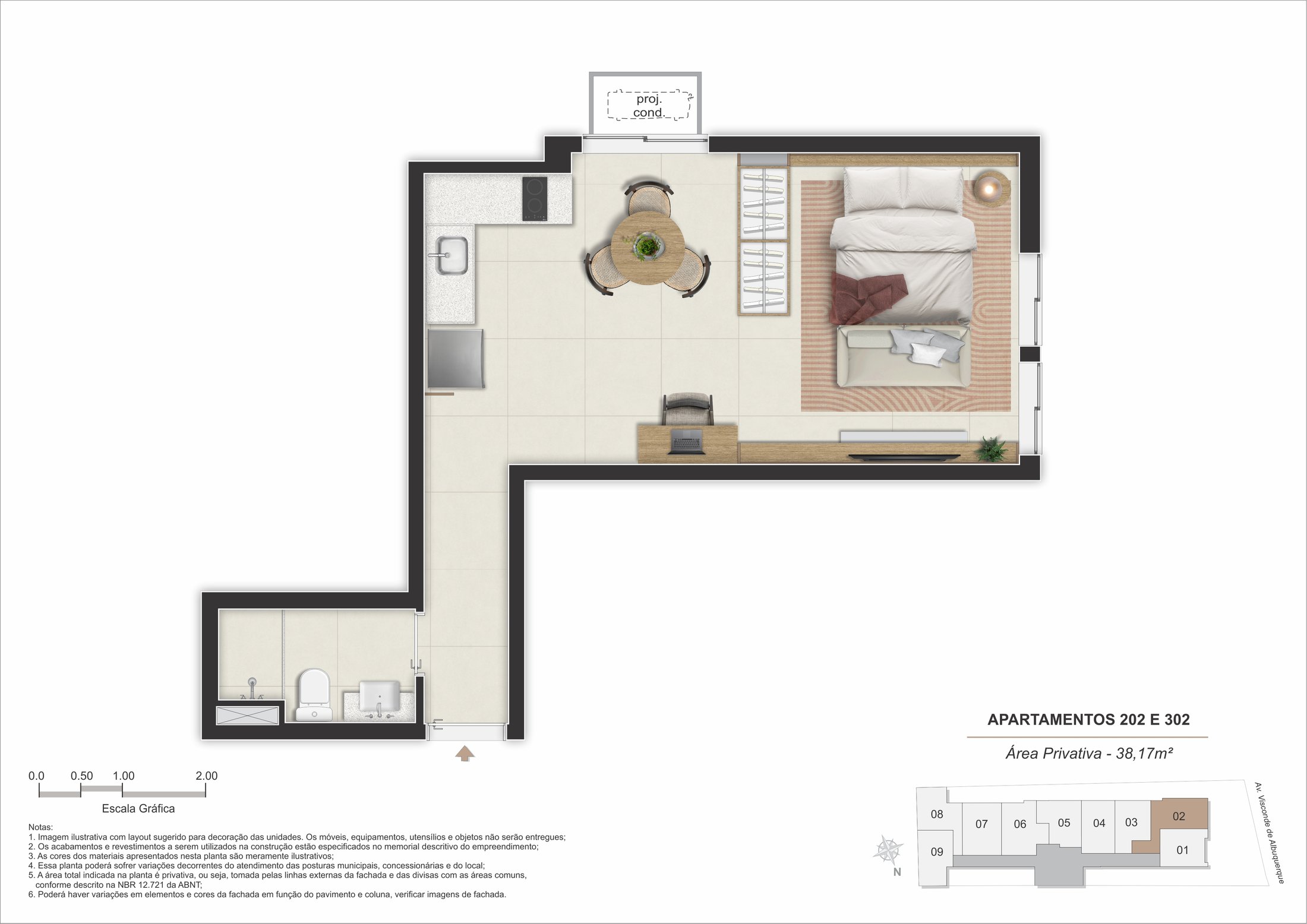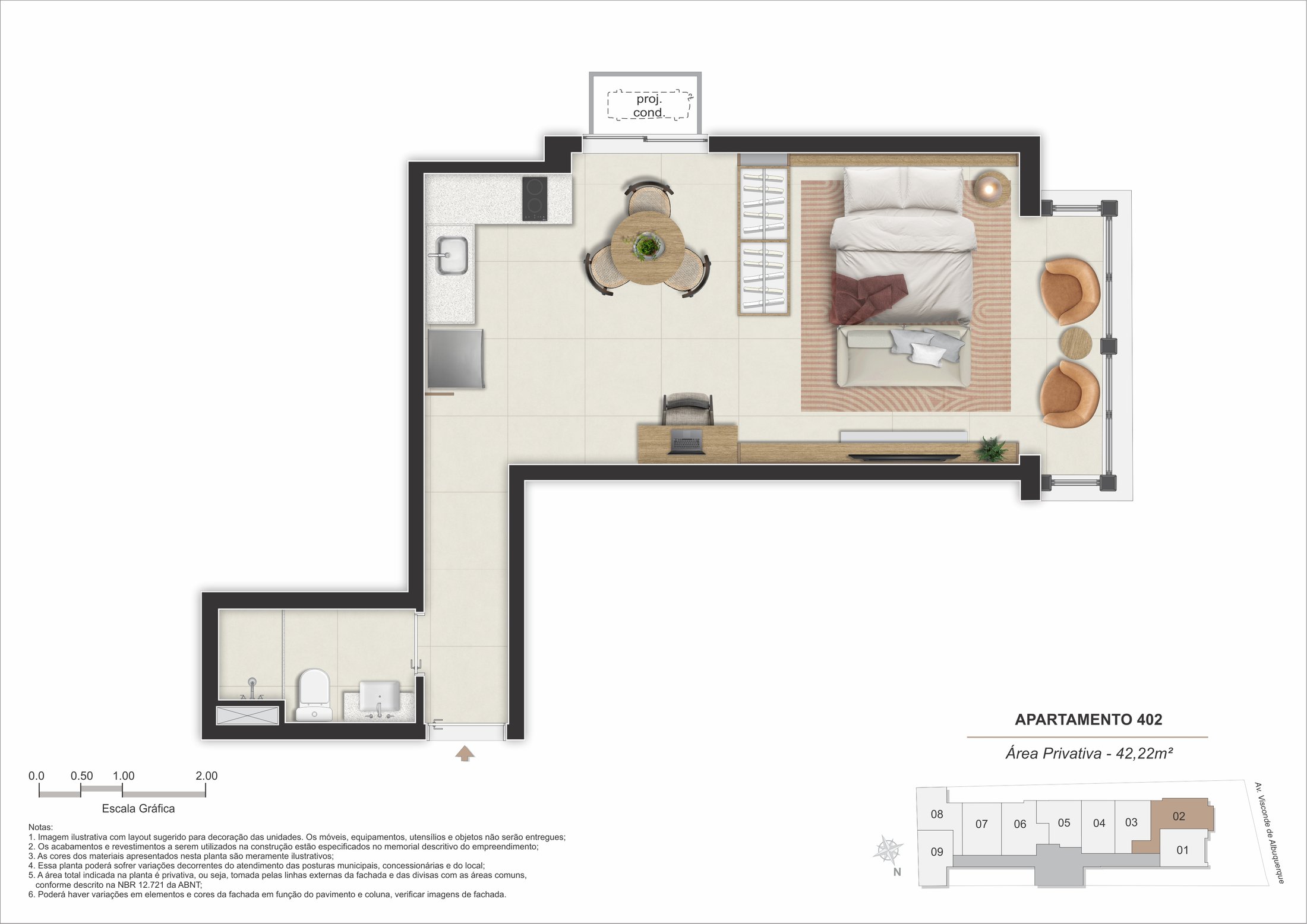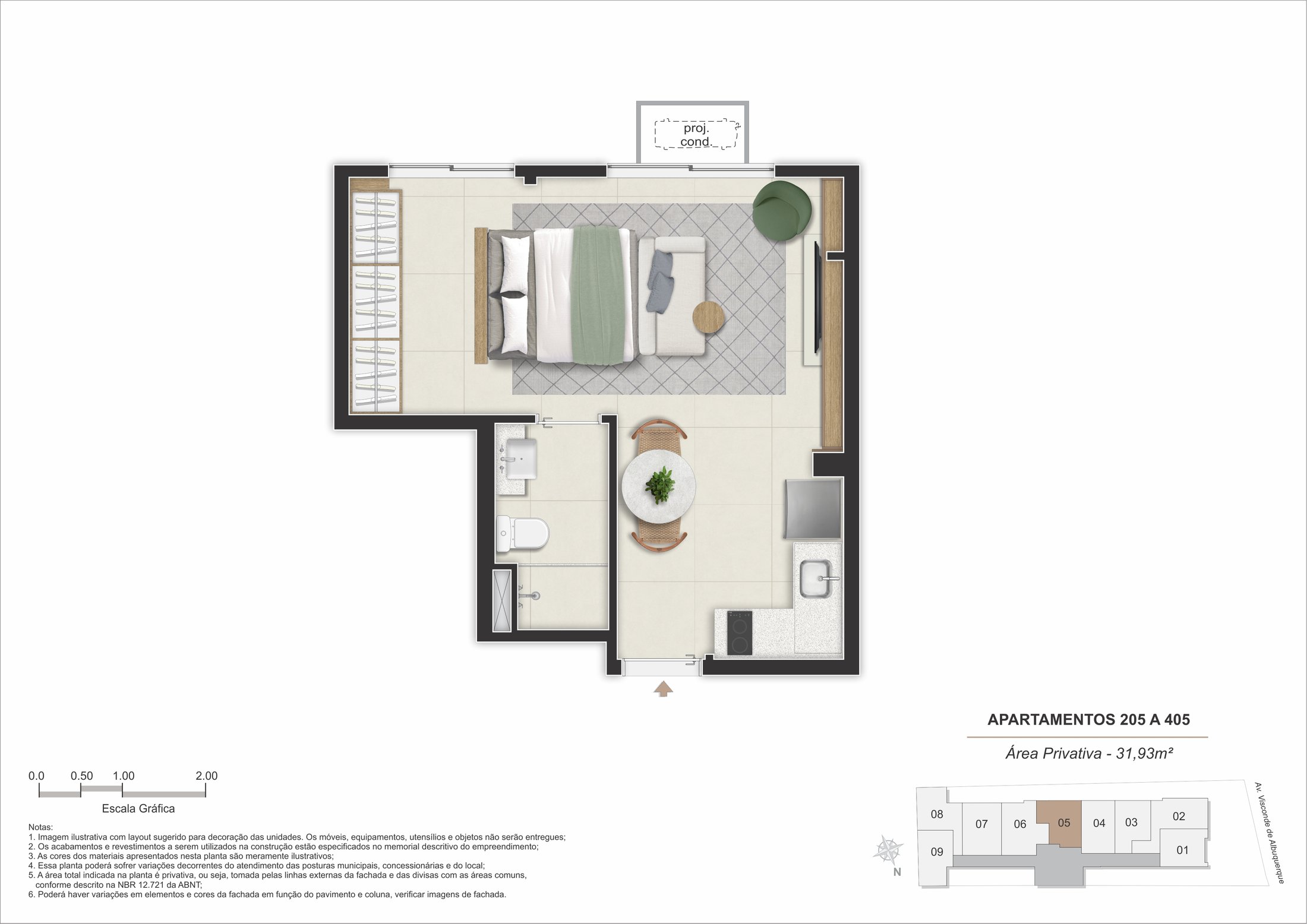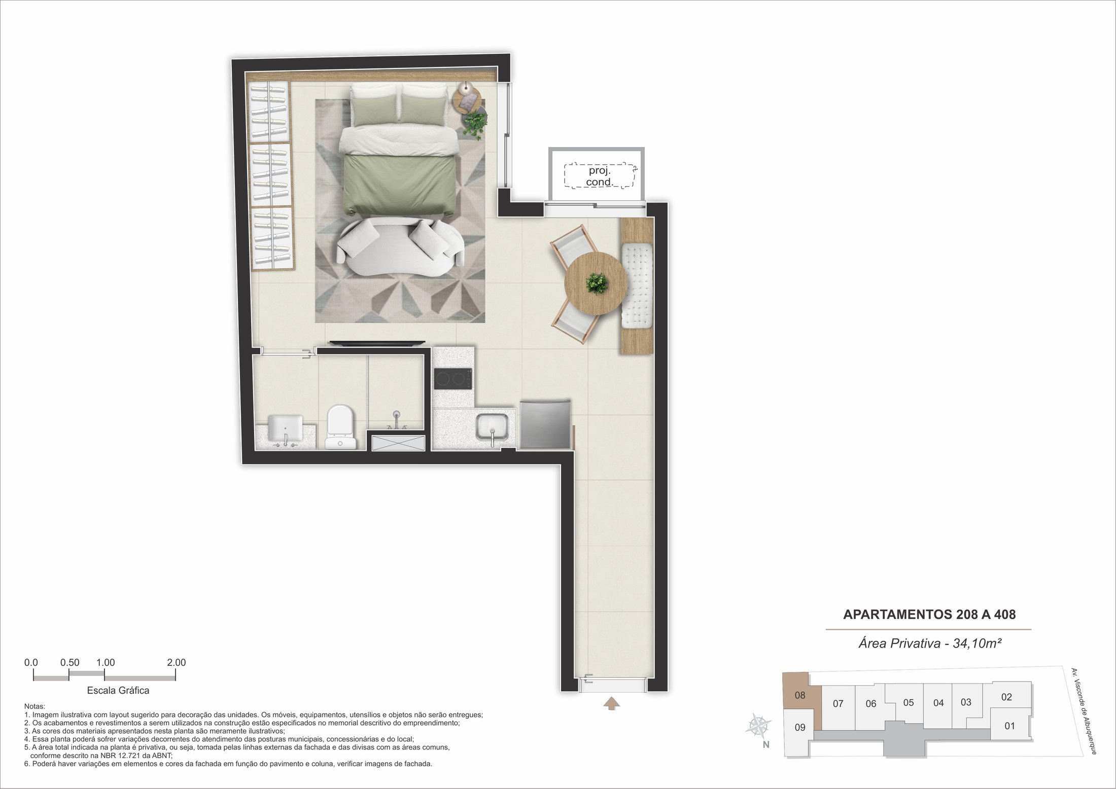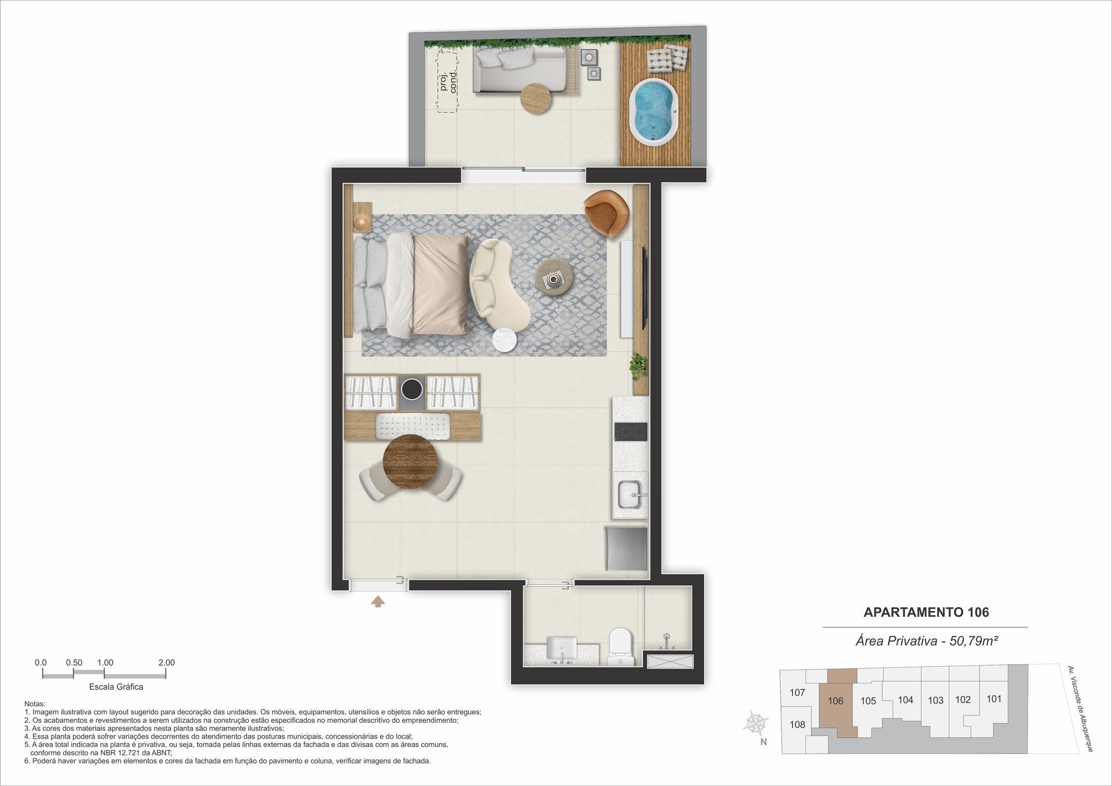 O projeto é composto por unidades Studios e Apartamentos Garden, com metragens compactas voltadas para moradia e investimento.