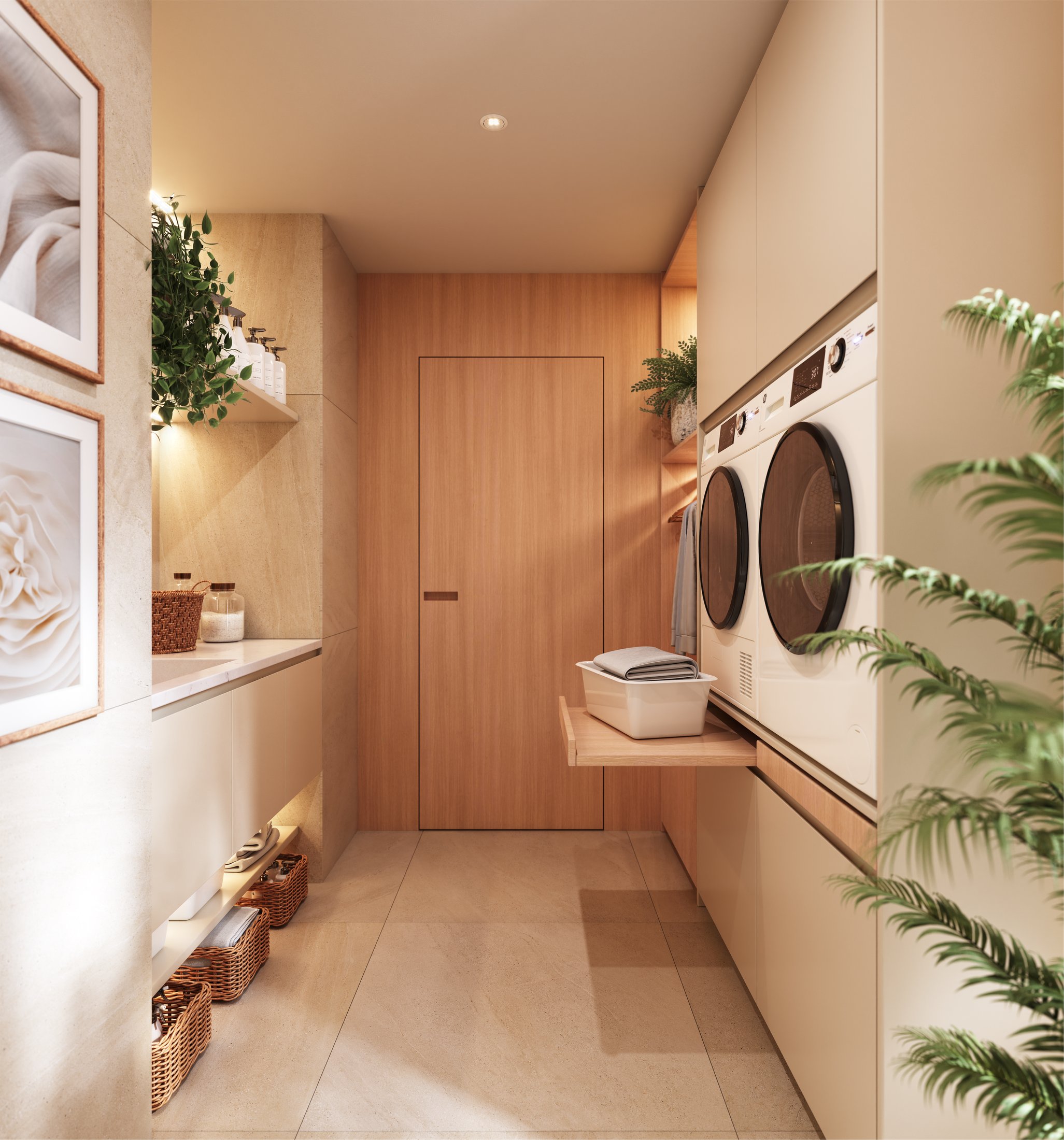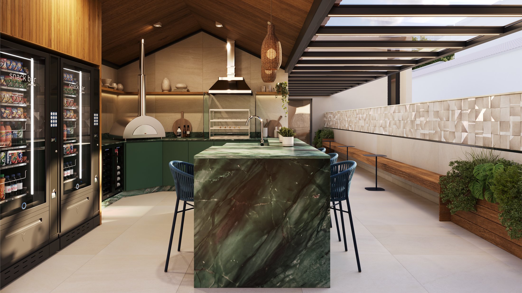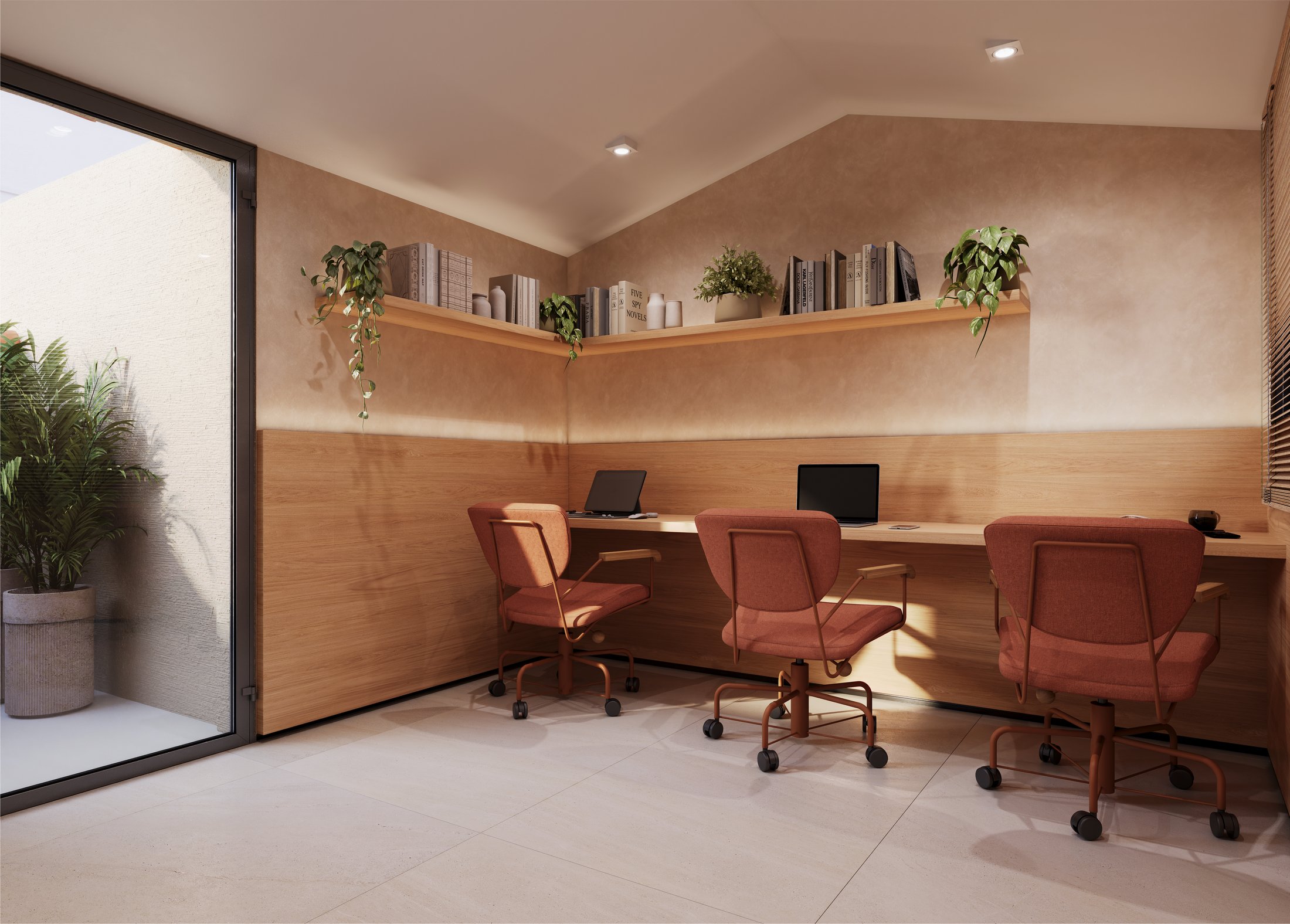 O projeto inclui coworking, atendendo à demanda por ambientes funcionais integrados à rotina residencial.