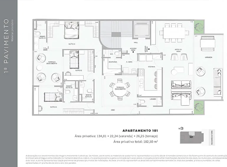 O apartamento garden do residencial Tríade é uma verdadeira raridade, com seus 182 m² de espaço interno dispostos em ambientes luxuosos e de puro bom gosto. O destaque da planta está em seus 2 terraços descobertos, sendo que um deles é conectado com suas 3 suítes magníficas. O imóvel também conta com uma varanda principal, sala que integra dois ambientes e uma cozinha moderna. Assim como as demais unidades, os moradores terão 2 vagas disponíveis na garagem.