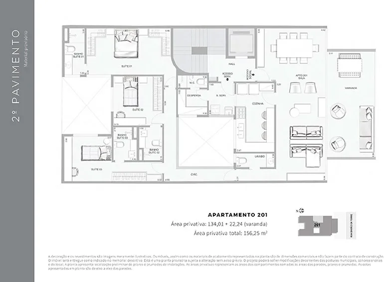 O apartamento tipo do residencial Tríade possui área total de 156 m², compondo um incrível e moderno imóvel de acabamentos premium, além de layout distribuído de maneira inteligente que apresenta cômodos amplos e de design sofisticado. A planta inclui uma varanda principal que possui conexão com a sala de estar e jantar, além de disponibilizar 3 suítes requintadas em sua área privativa. Os moradores também terão o direito de 2 vagas no estacionamento do condomínio.