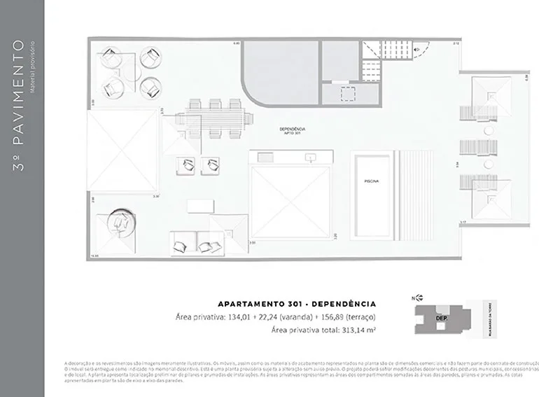 A cobertura duplex do Tríade apresenta espaço interno de 313 m², e é composta por 3 suítes amplas, cozinha moderna e salas integradas que são conectadas com a varanda principal da unidade. Sua planta possui um layout inteligente, resultando em cômodos bem arejados e iluminados. O diferencial está em seu pavimento superior que disponibiliza um terraço totalmente convertido em área de lazer, com piscina, deck e espaço para descanso.