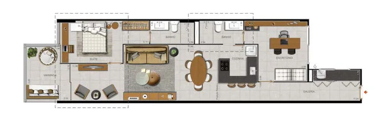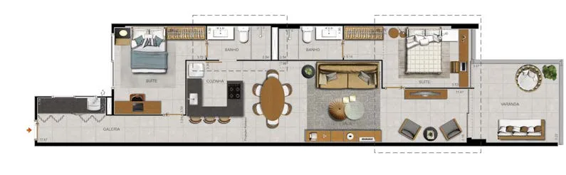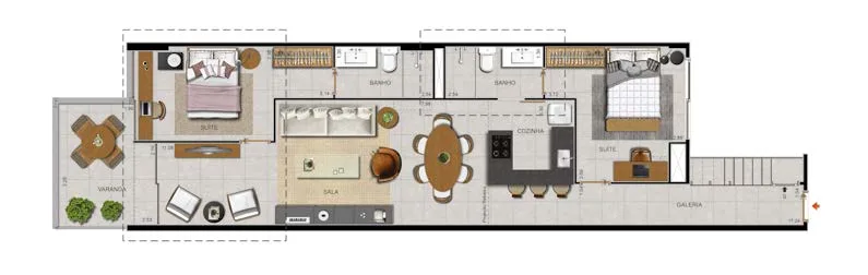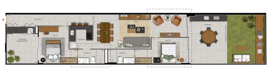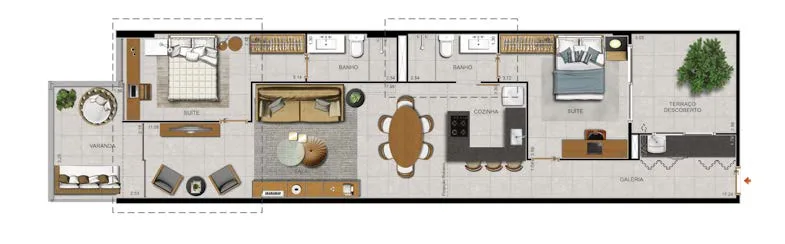Os apartamentos garden do Two Suites Ipanema apresentam área total interna de 128 m², layout moderno e cômodos aconchegantes com ótima ventilação e iluminação natural. A planta possui ambientes em conceito aberto, integrando de maneira moderna a cozinha e as salas, escolha que visa usar de forma inteligente cada metro quadrado do espaço interno. As 2 incríveis unidades disponíveis para venda no residencial também contam com 2 suítes, o direito de box privativo e são privilegiadas por possuir terraços descobertos, um destes integrado a uma varanda espaçosa, perfeita para momentos em família e para receber os amigos com muito estilo e conforto.