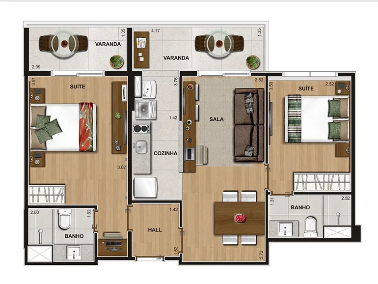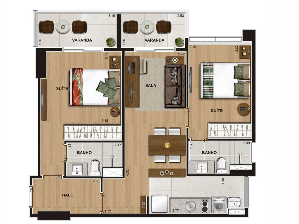Os apartamentos do Via Premiere contam com metragens entre 67 m² e 68 m², com 2 quartos, ambos suítes. O projeto prioriza uma planta funcional, com boa distribuição dos ambientes e integração entre sala, cozinha e varanda. Os acabamentos seguem um padrão moderno e de qualidade, e as janelas amplas garantem ótima entrada de luz natural. Cada unidade dispõe ainda de 1 vaga de garagem.