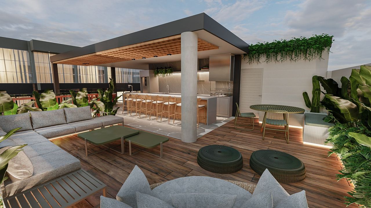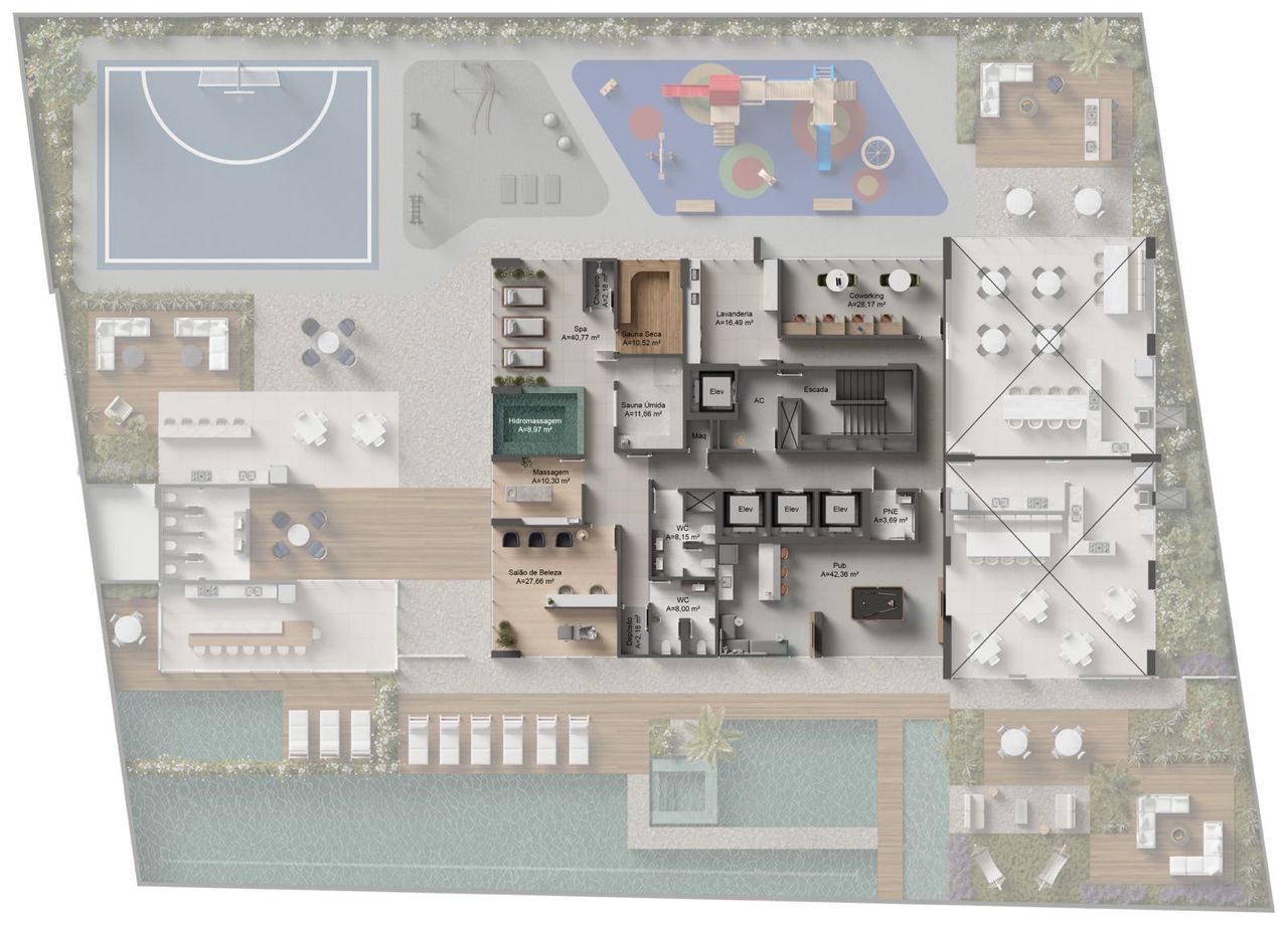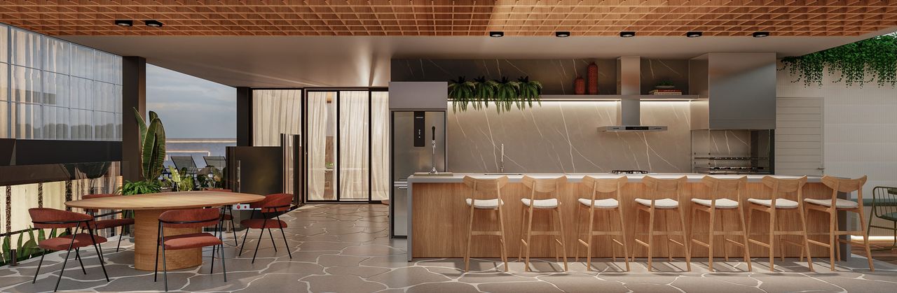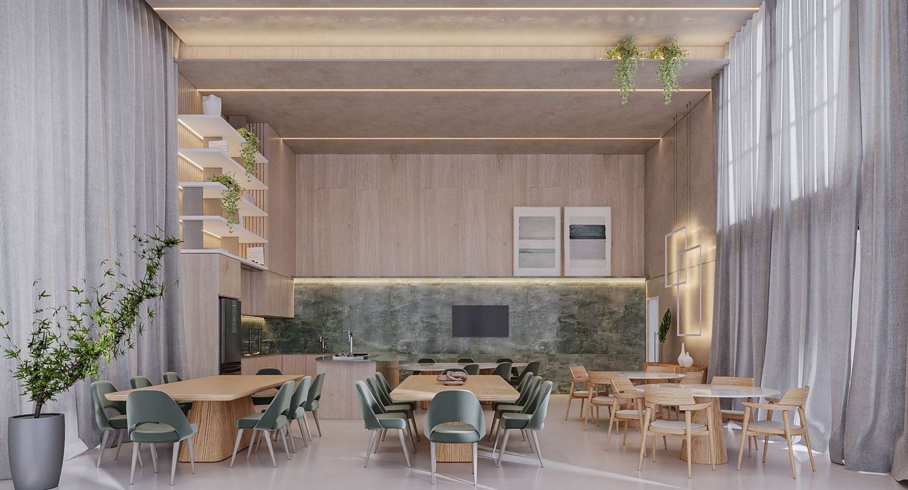 O design foca em um conceito Home Club, com arquitetura moderna e funcional, priorizando áreas de lazer completas e acabamentos internos como porcelanato e espera para split.