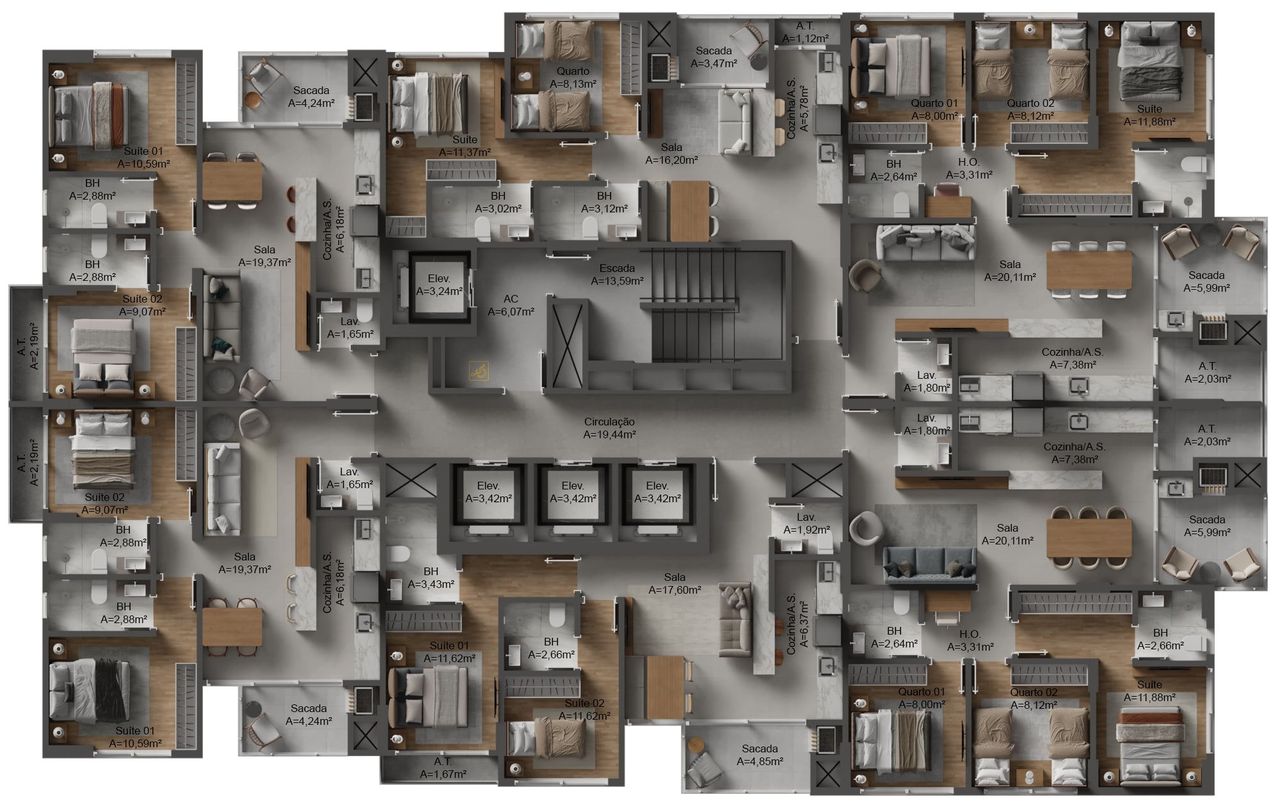 Analisamos o mercado e estruturamos o Art Tower Home Club com opções que atendem diferentes perfis de investidores e moradores. As unidades são compostas por apartamentos com áreas privativas que vão de 60,12 m² a 83,30 m², oferecendo 2 ou 3 dormitórios, com 1 a 2 vagas de garagem. O condomínio agrega diferenciais como varanda gourmet e infraestrutura para água quente, elevando o padrão de vida.
