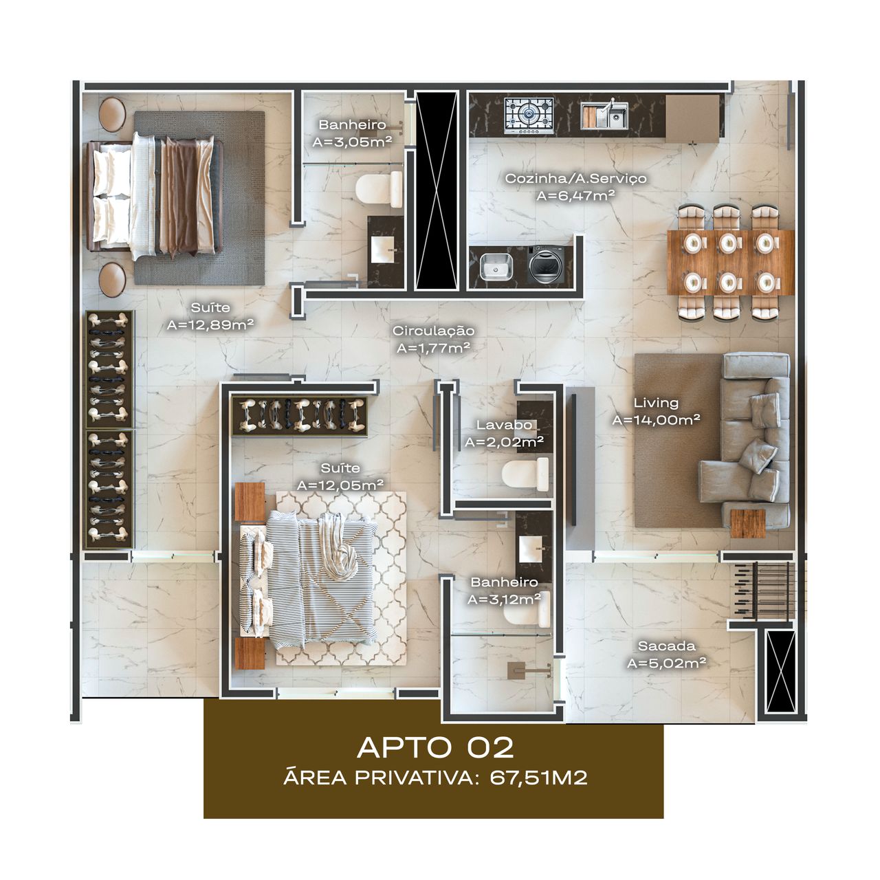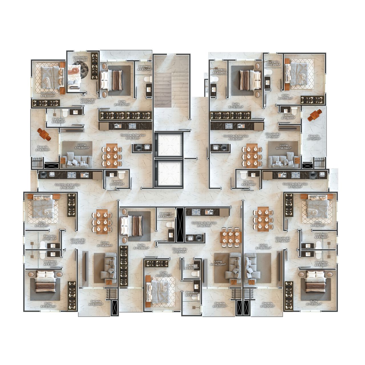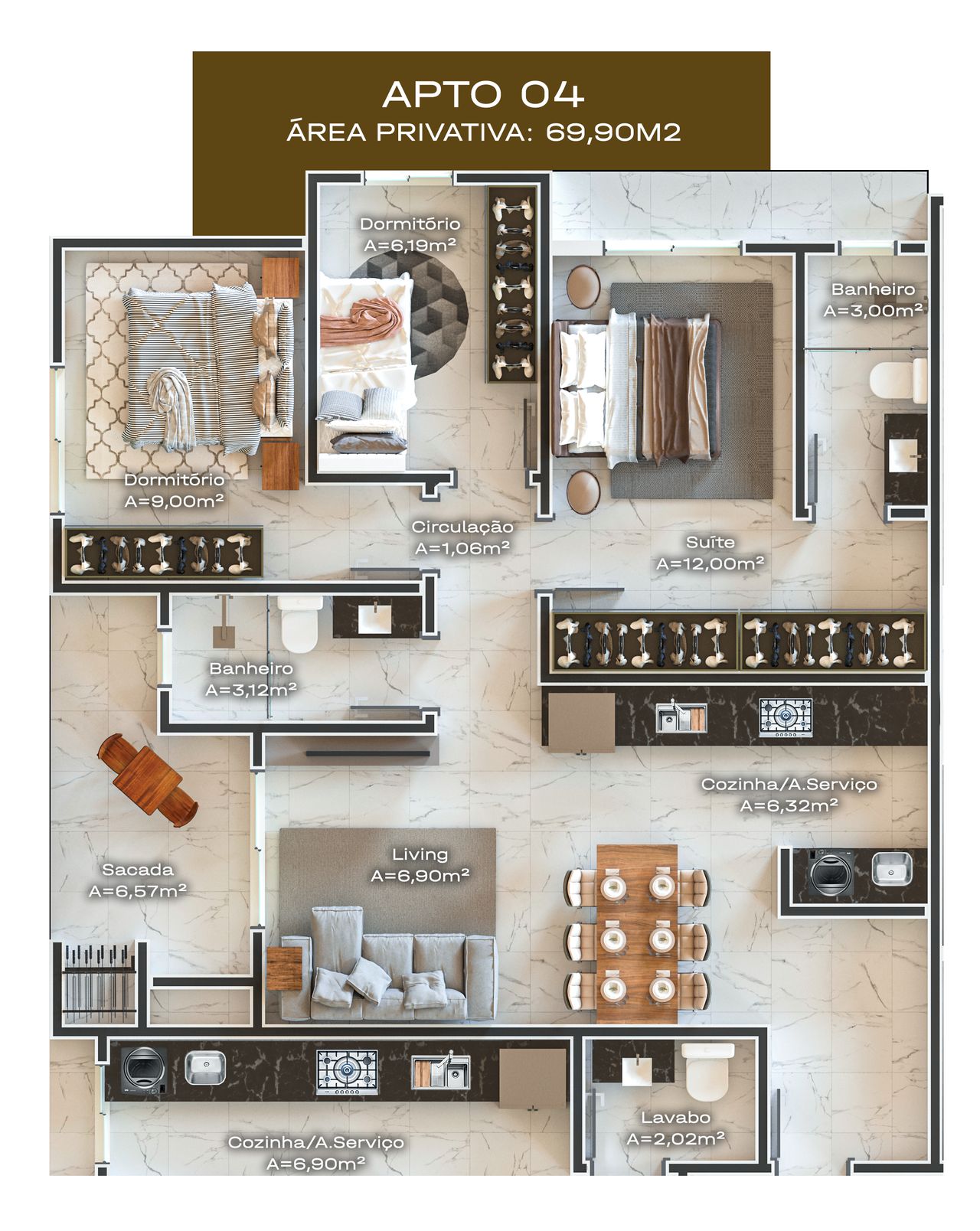 O Atlanta Residence oferece apartamentos com aproximadamente 70,00 m² de área privativa, com opções de 2 ou 3 dormitórios, sendo sempre 1 suíte.