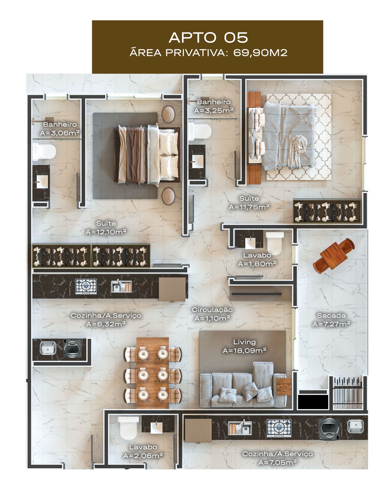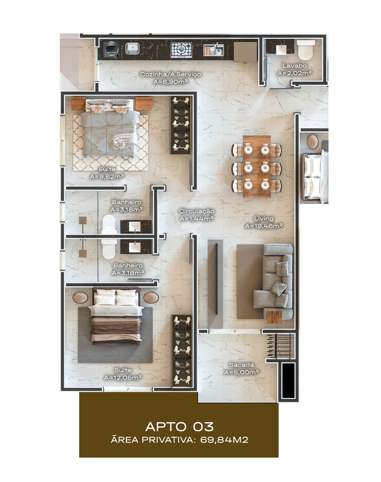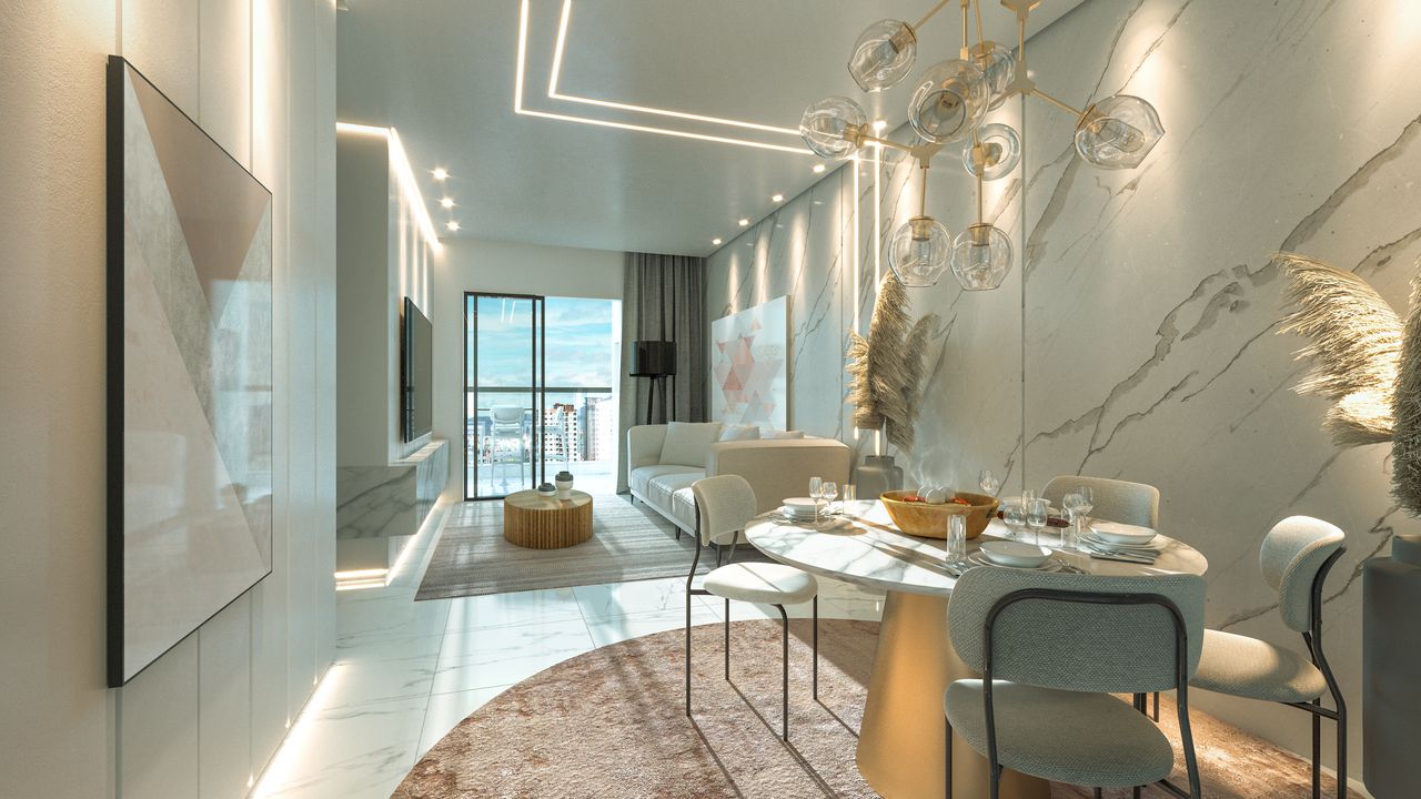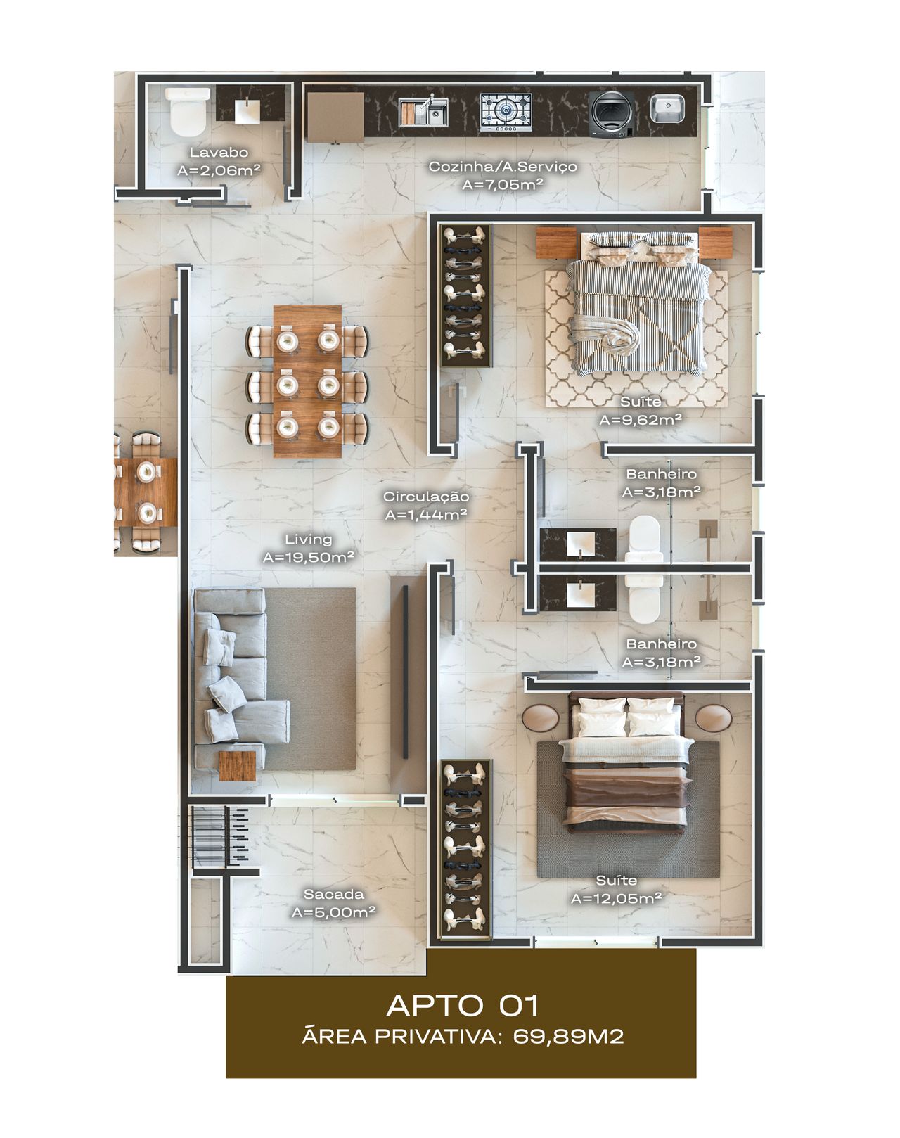 O Atlanta Residence oferece apartamentos com aproximadamente 70,00 m² de área privativa, com opções de 2 ou 3 dormitórios, sendo sempre 1 suíte.
