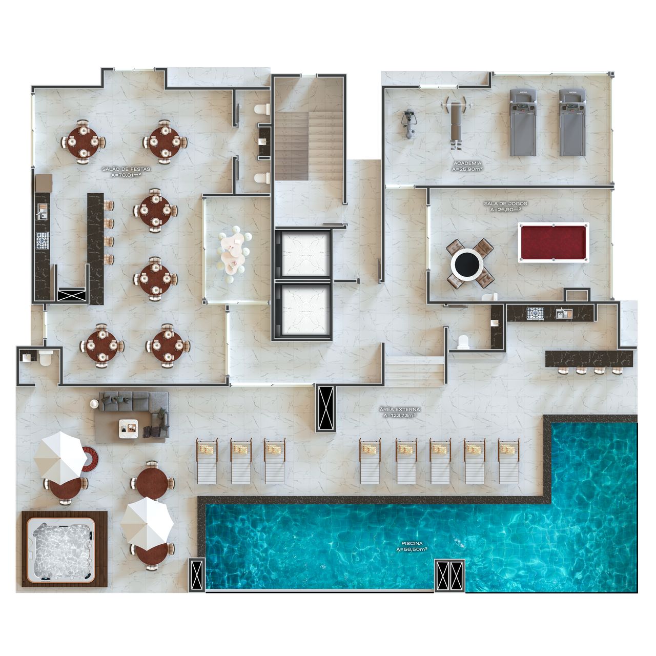 A área de lazer é completa e está localizada no rooftop, somando mais de 400m², incluindo piscina, academia, salão de festas e espaço gourmet.