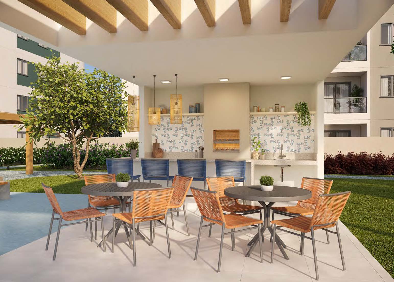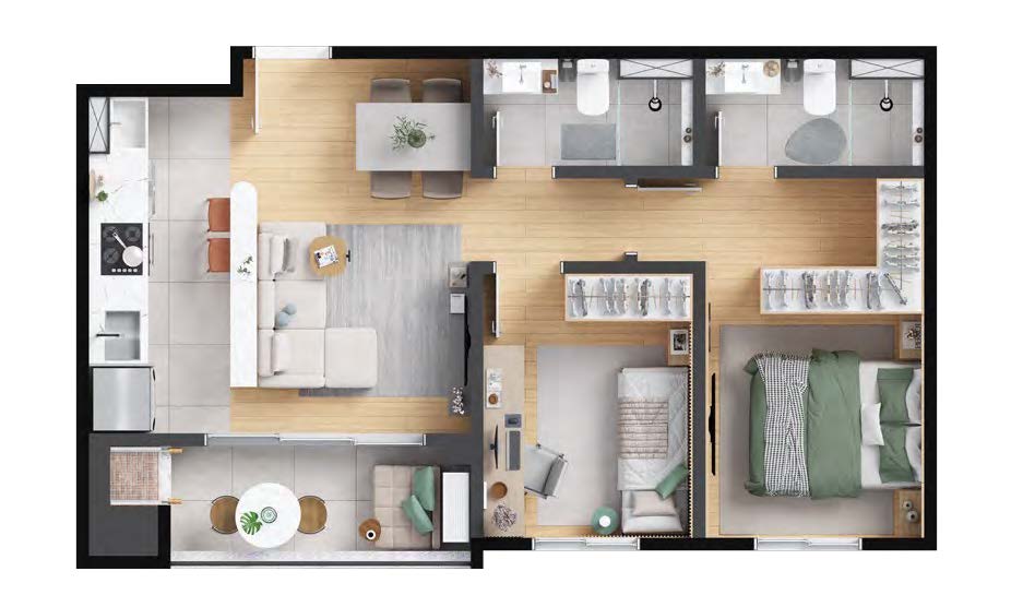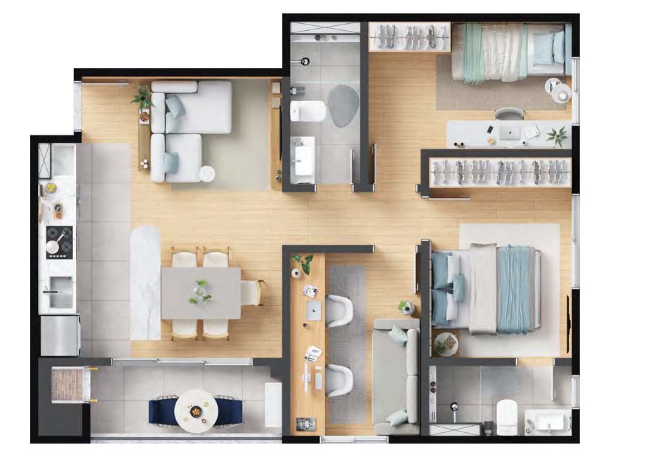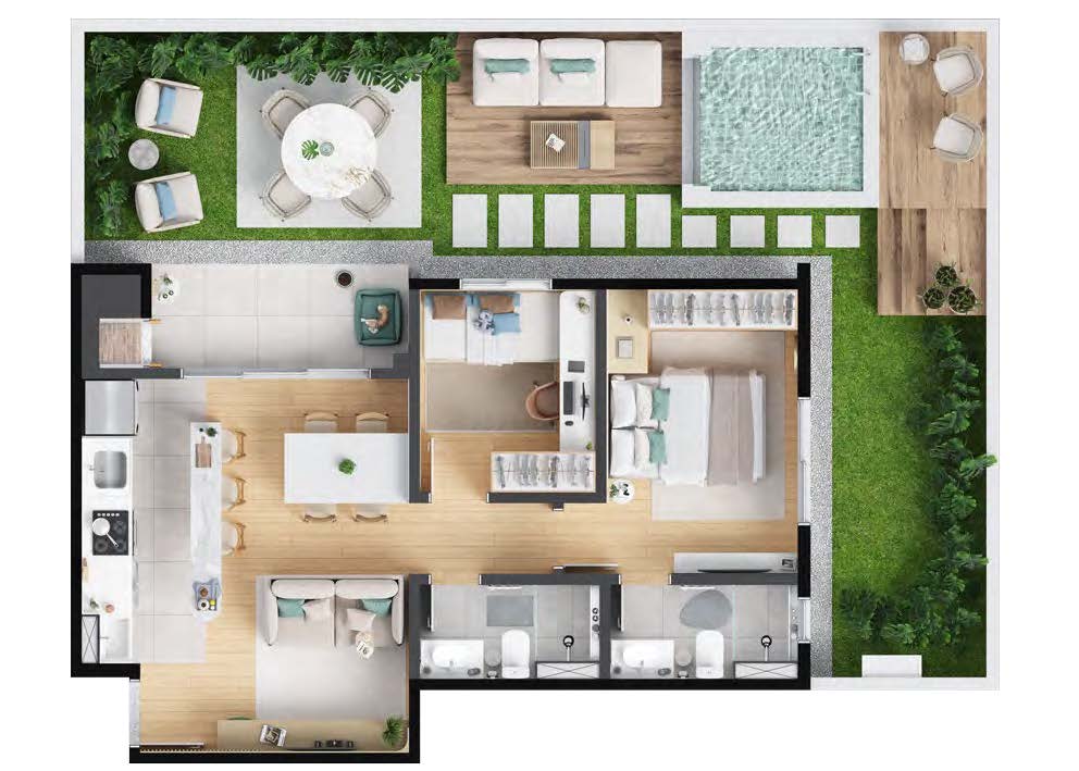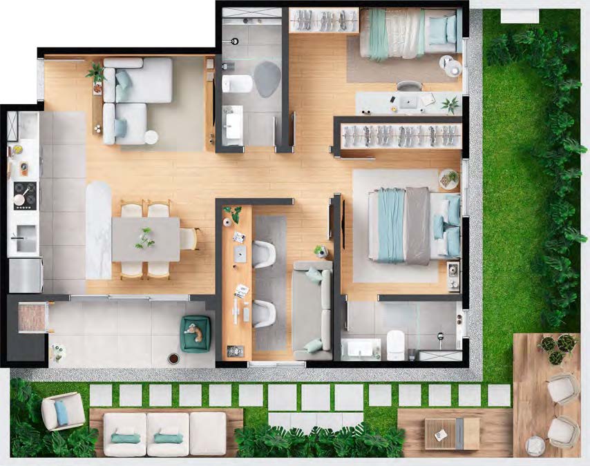 Os apartamentos garden combinam o conforto de uma casa com a praticidade de um condomínio resort. Com áreas de 82 m², 99 m², 104 m² e 107 m², essas unidades possuem 2 ou 3 dormitórios com suíte, amplo espaço externo e ponto para ofurô ou piscina privativa. Ideais para quem busca exclusividade e contato com a natureza.