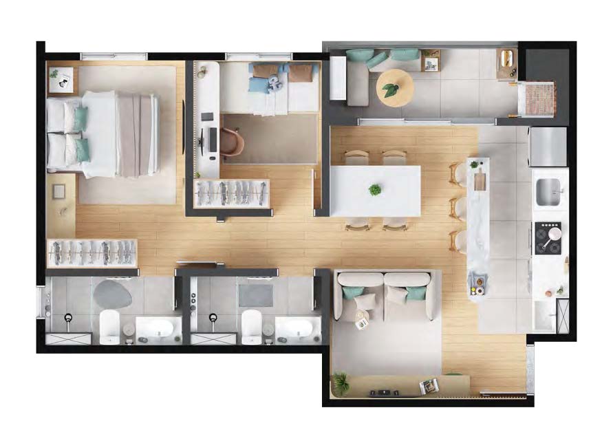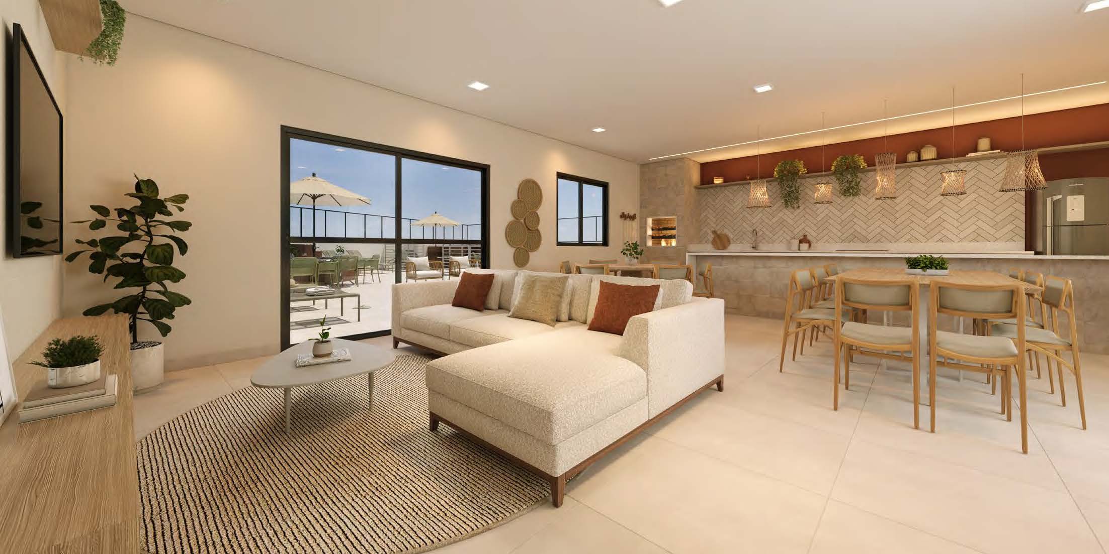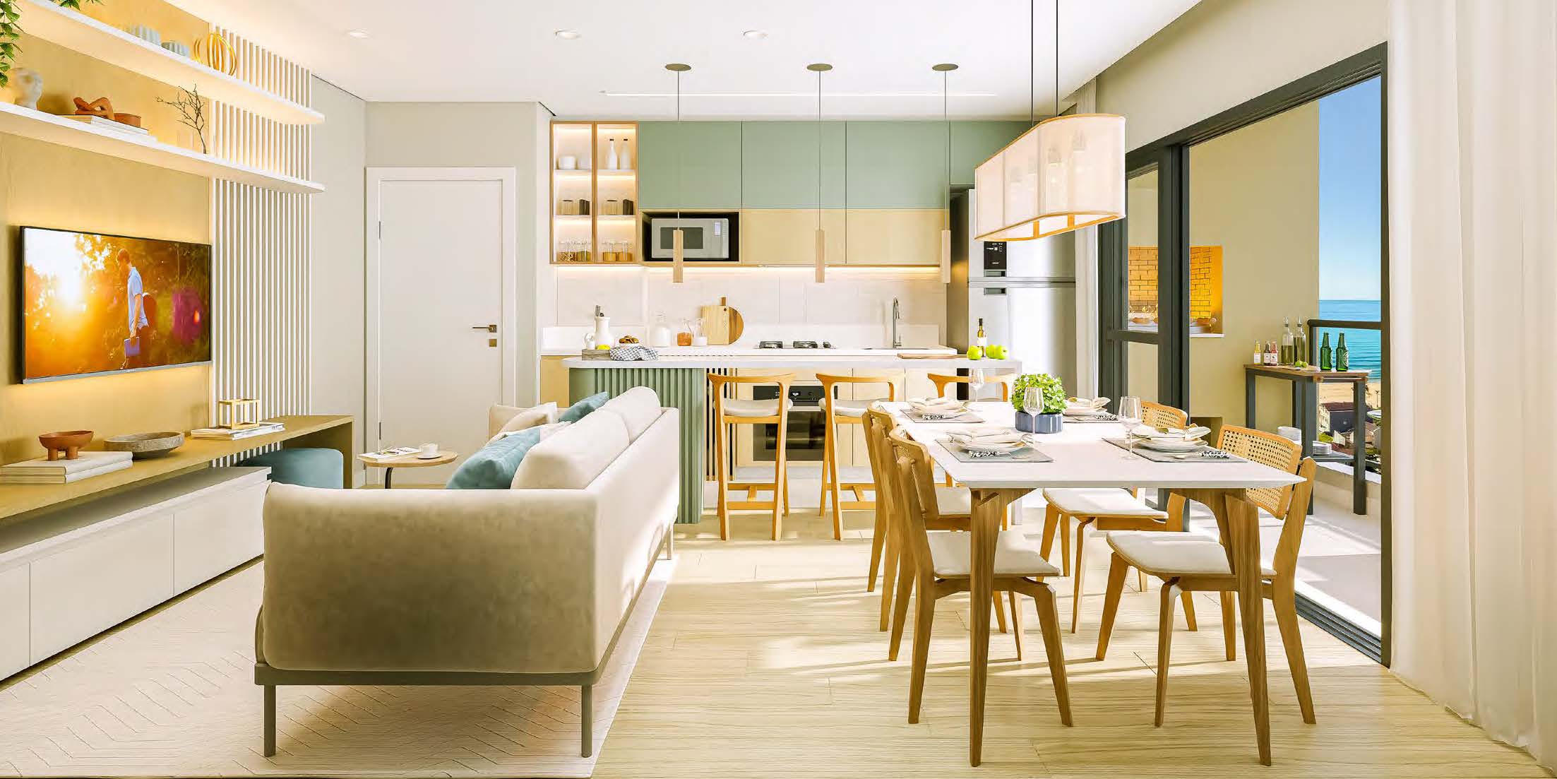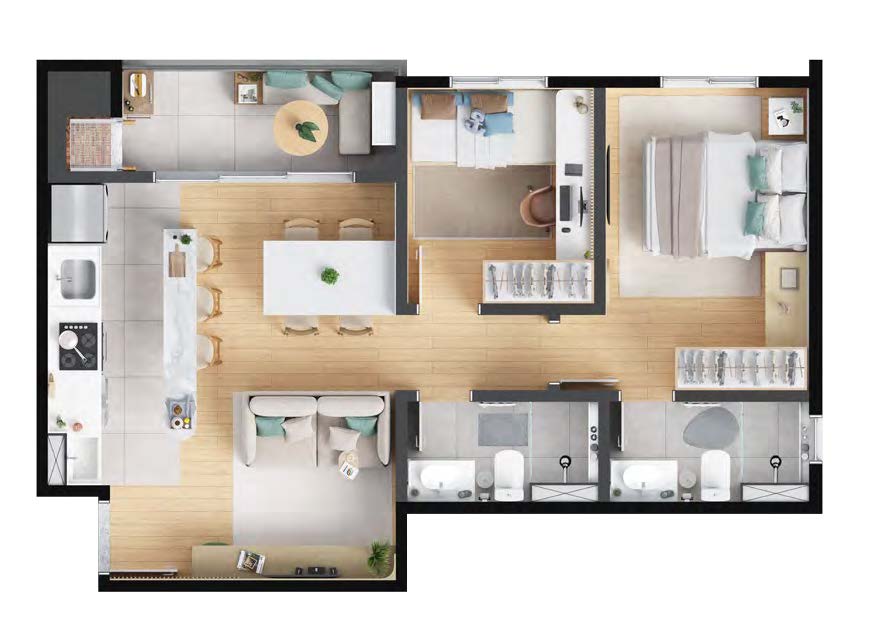 Os apartamentos do Barra Home Resort oferecem conforto e funcionalidade em metragens de 52 m², 53 m² e 64 m². As unidades contam com 2 ou 3 dormitórios, todos com suíte e sacada com churrasqueira, além de vista permanente para o mar. A planta inteligente valoriza a ventilação natural e a integração dos espaços sociais.