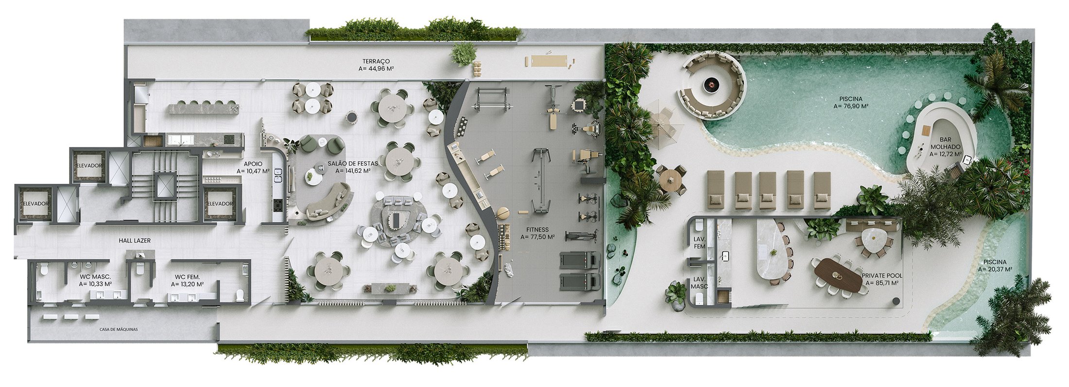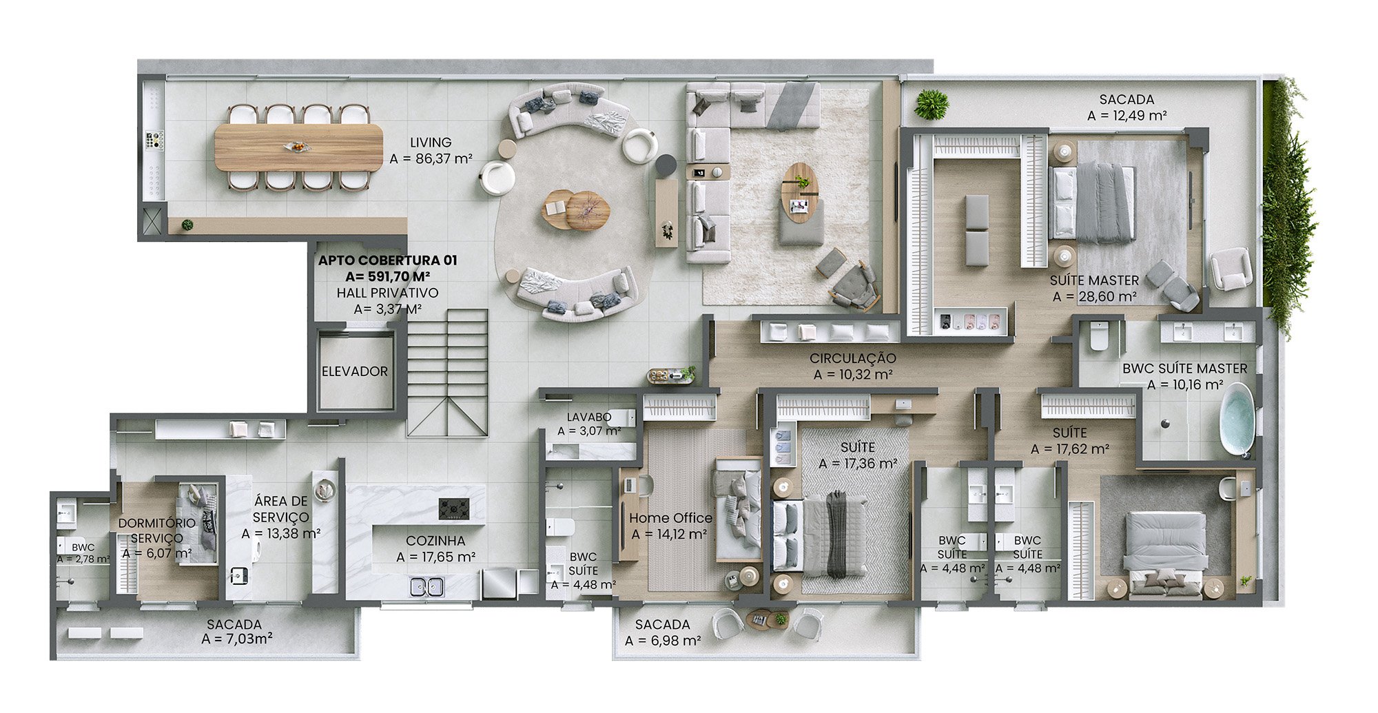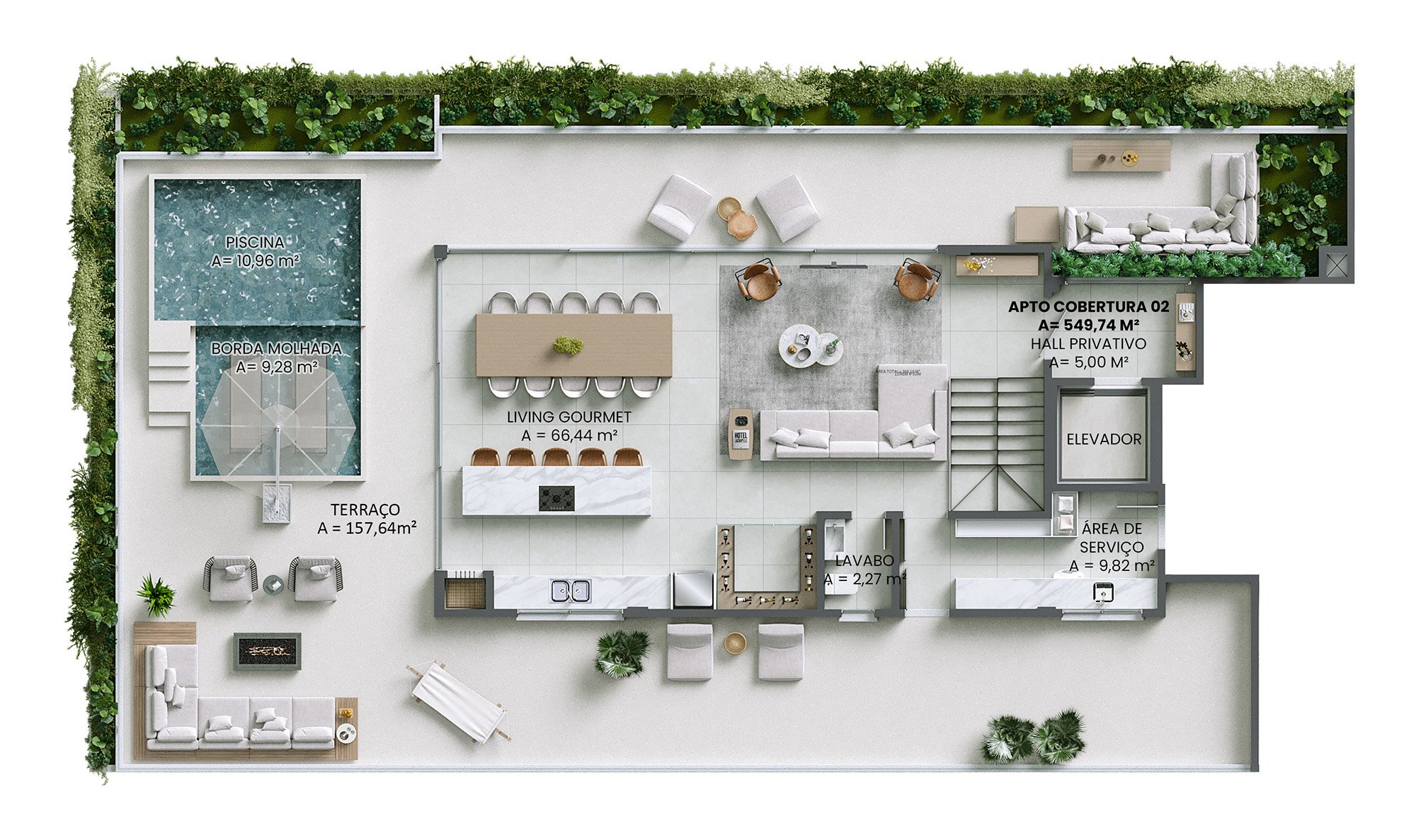 As coberturas duplex possuem 549,74 m² e 591,70 m², com 4 suítes, suíte master com closet e banheira, amplo living gourmet no pavimento superior e terraço com piscina privativa. Contam com 5 vagas individuais, hall privativo e integração total entre áreas internas e externas.