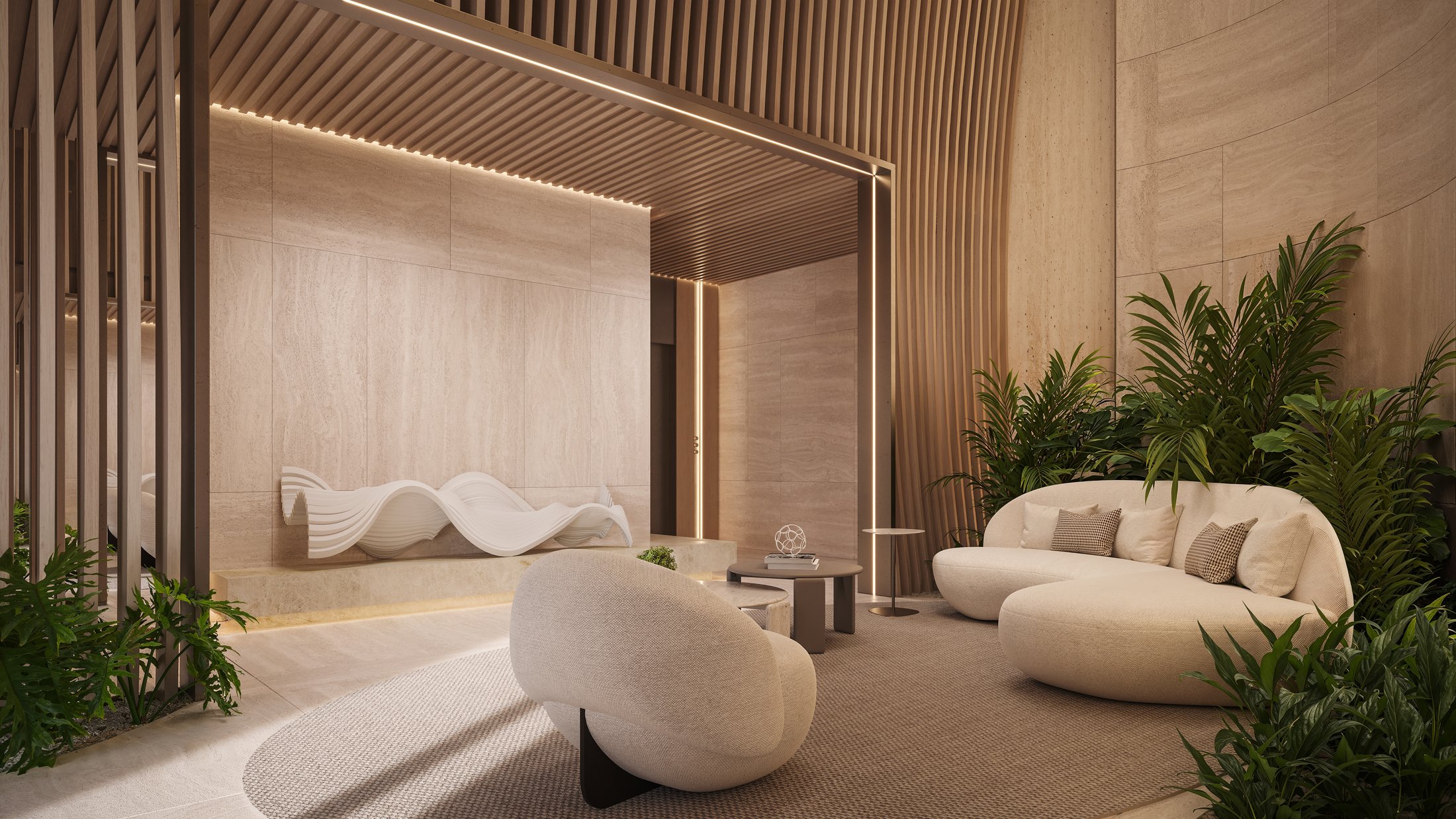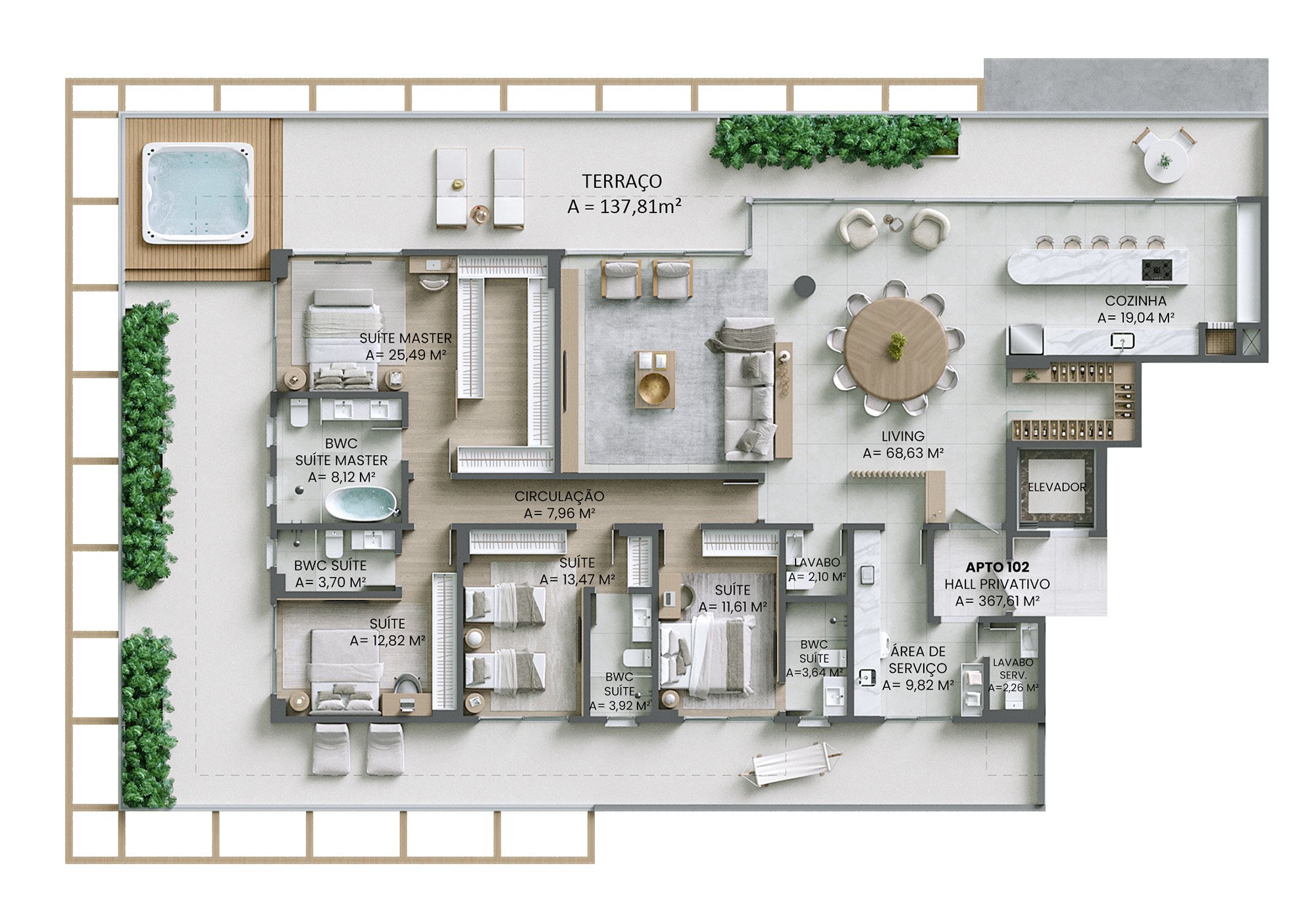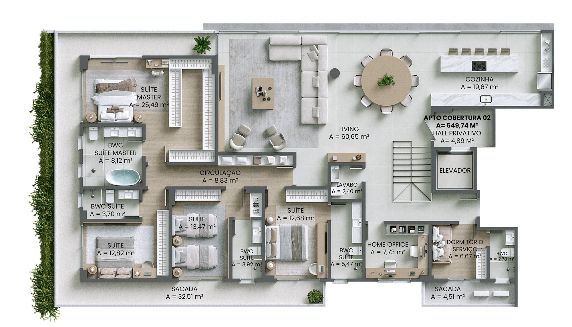 As coberturas duplex possuem 549,74 m² e 591,70 m², com 4 suítes, suíte master com closet e banheira, amplo living gourmet no pavimento superior e terraço com piscina privativa. Contam com 5 vagas individuais, hall privativo e integração total entre áreas internas e externas.