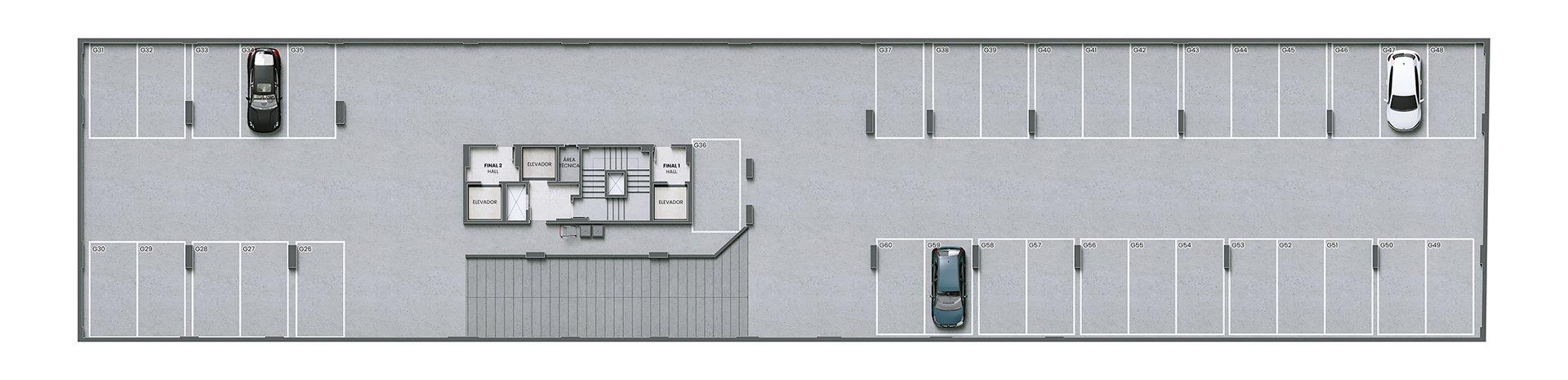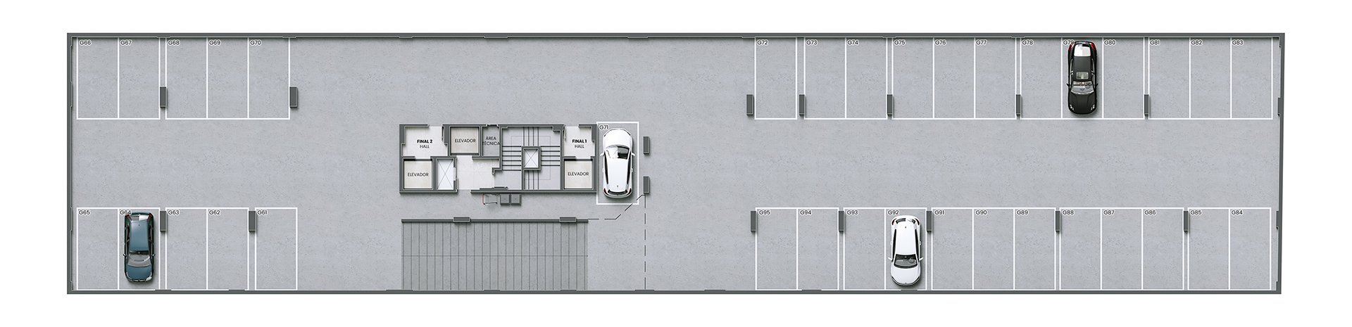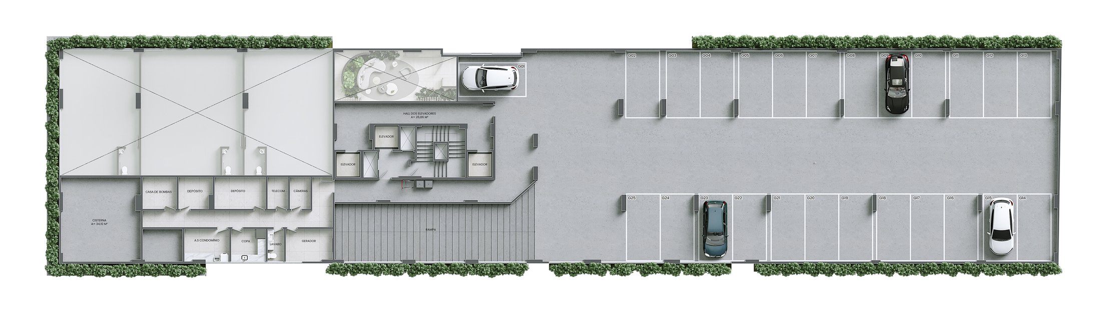 Os apartamentos tipo possuem de 3 a 4 vagas individuais, o garden conta com 3 vagas e as coberturas duplex oferecem 5 vagas individuais.