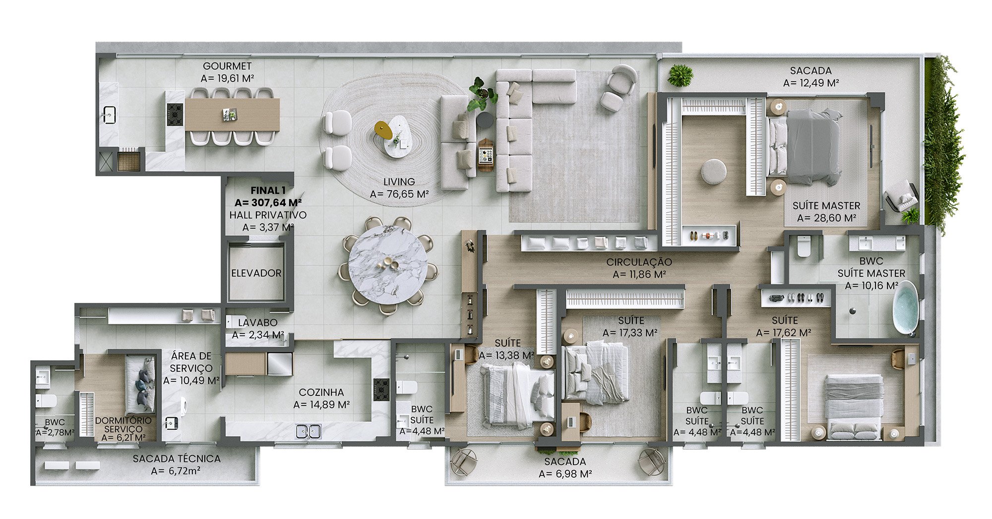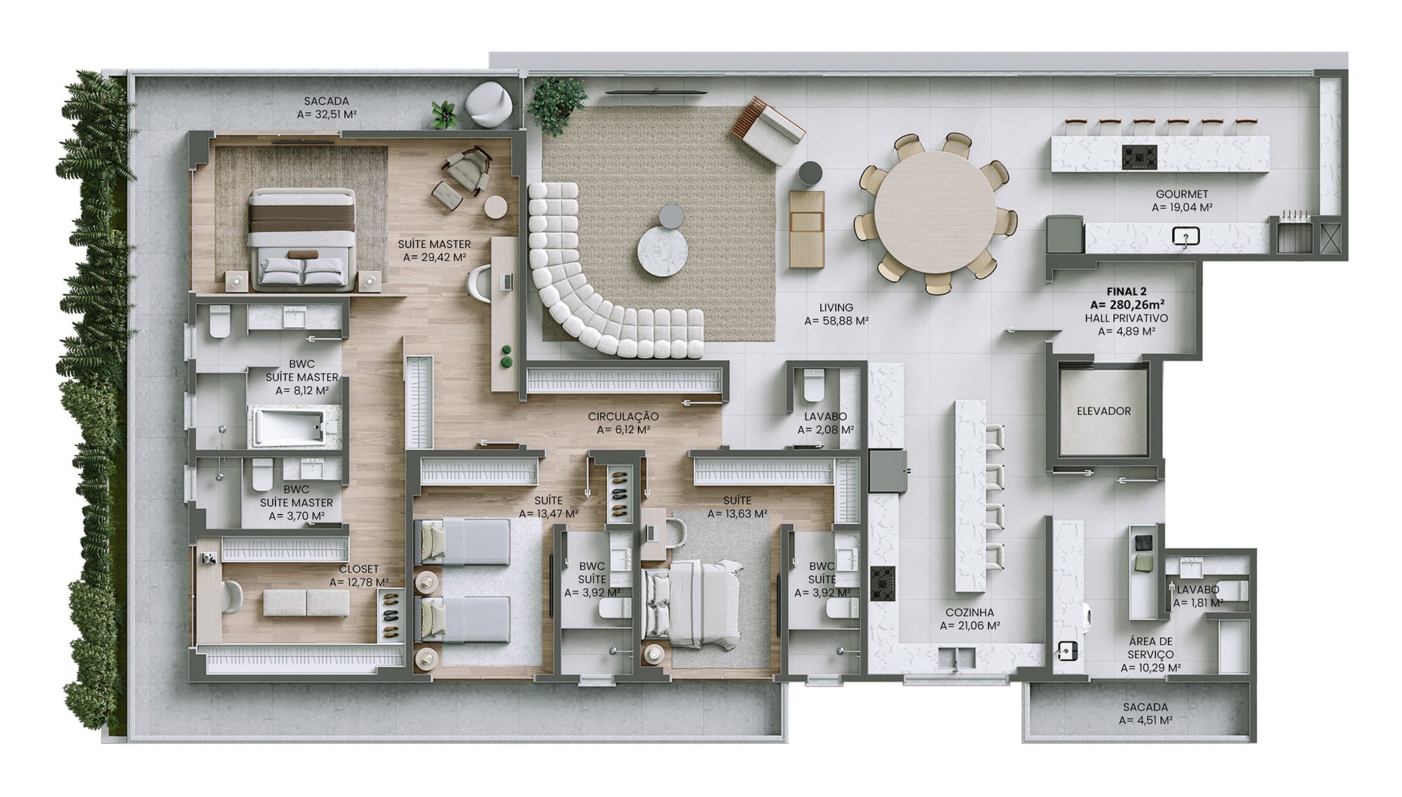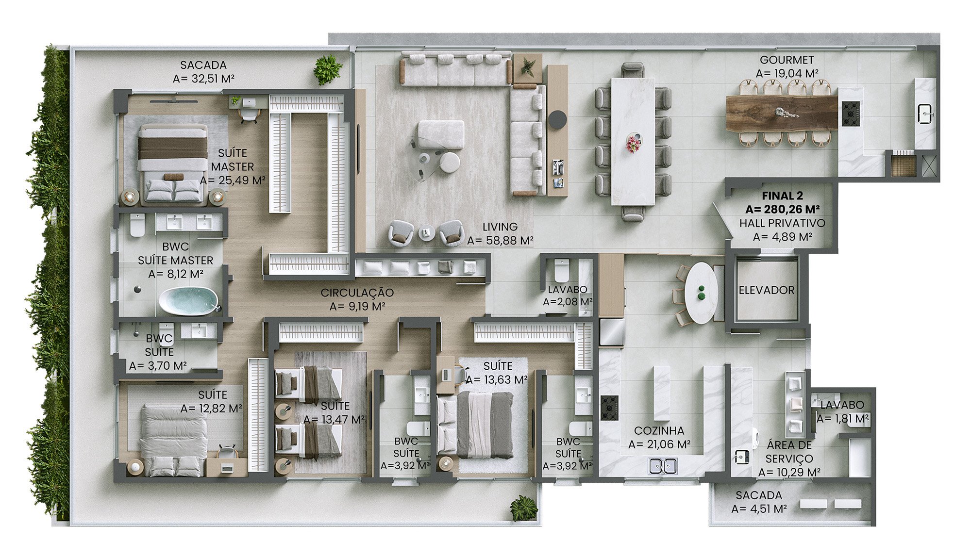 As metragens variam entre 280,26 m² nos apartamentos tipo, 367,61 m² no garden e até 591,70 m² nas coberturas duplex.