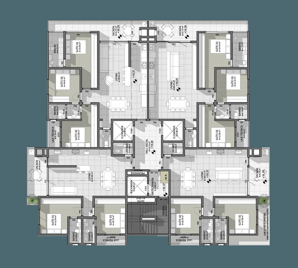 As unidades tipo 1 e 2 possuem 121,22 m² de área privativa, com distribuição de 1 suíte mais 2 demi-suítes, living integrado e sacada com churrasqueira a carvão. Contam com fechadura biométrica e infraestrutura para automação. São 4 apartamentos por pavimento.